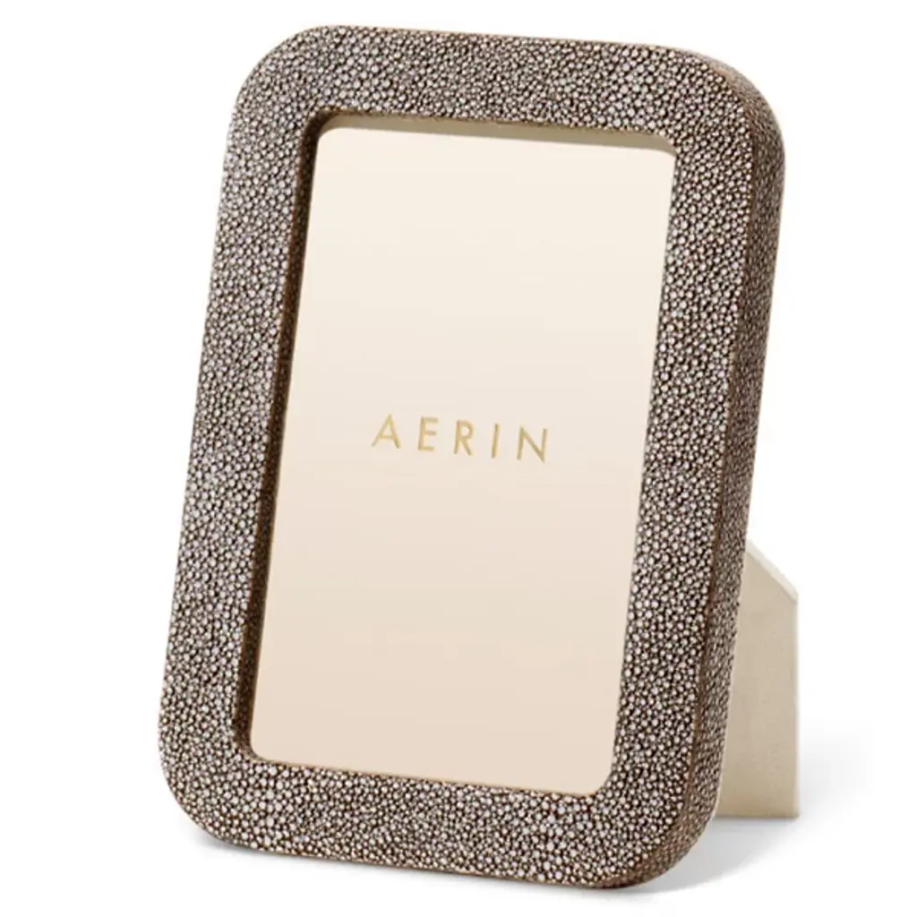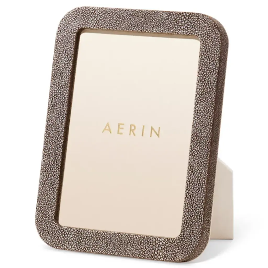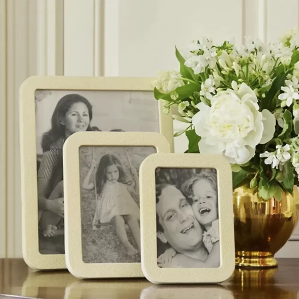 The Modern Shagreen Photo Frame from AERIN takes a minimalist approach with rounded corners that soften the rectangular format. The embossed covering creates texture without additional ornamentation, letting photographs remain the central focus. Curved edges prevent the frame from appearing rigid, while the smooth corners feel comfortable in hand. The textured surface provides a secure grip during photo changes and cleaning. An integrated easel back allows stable tabletop positioning in casual settings like bedrooms or kitchens. This streamlined design complements displayed images rather than competing for attention, making it suitable for everyday family photographs and artwork.