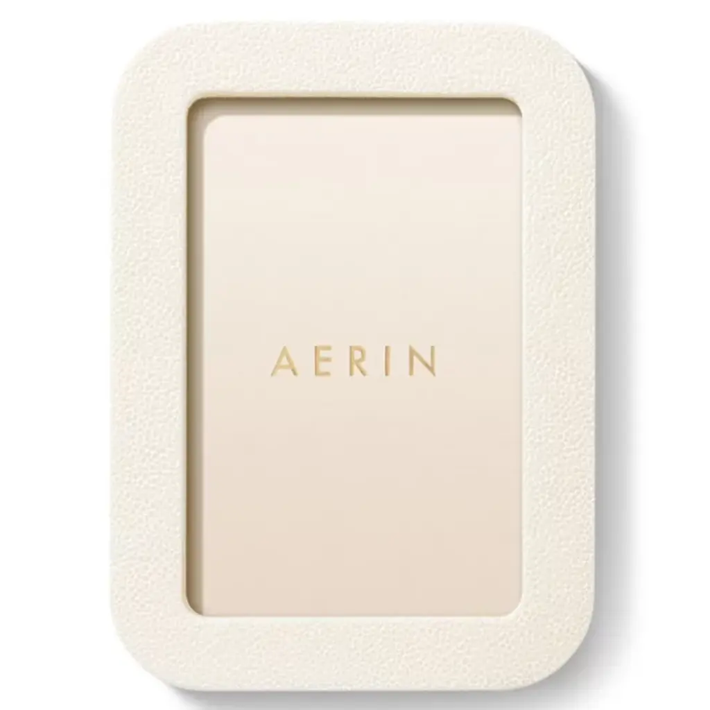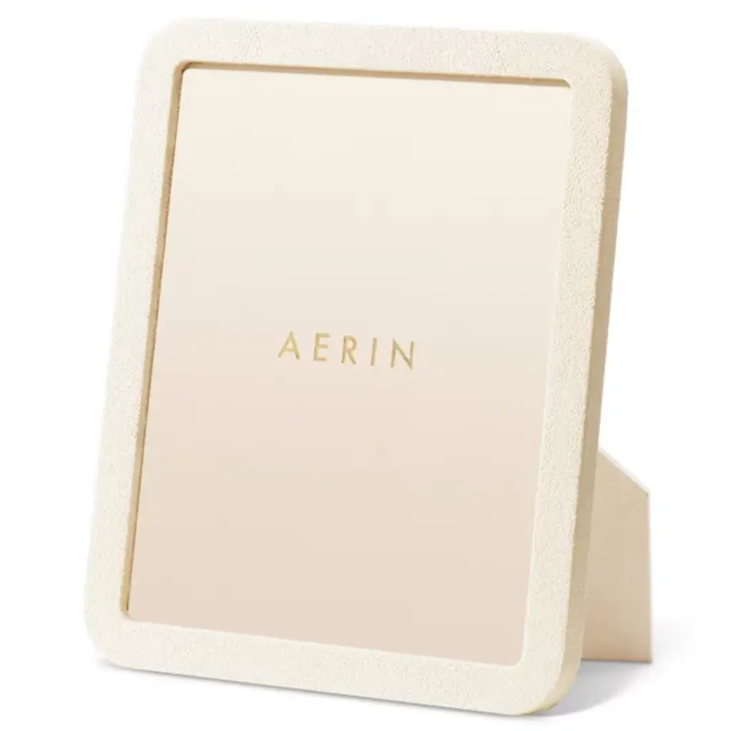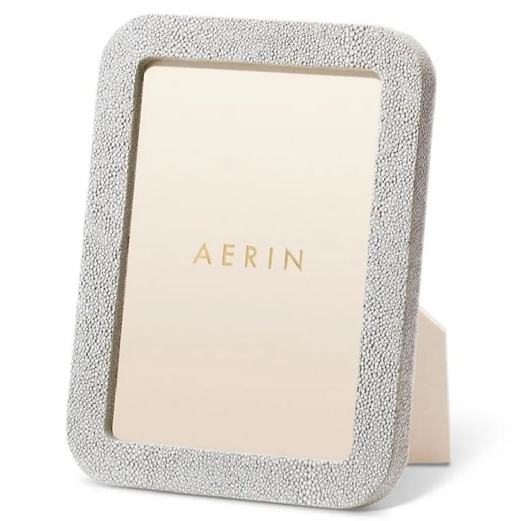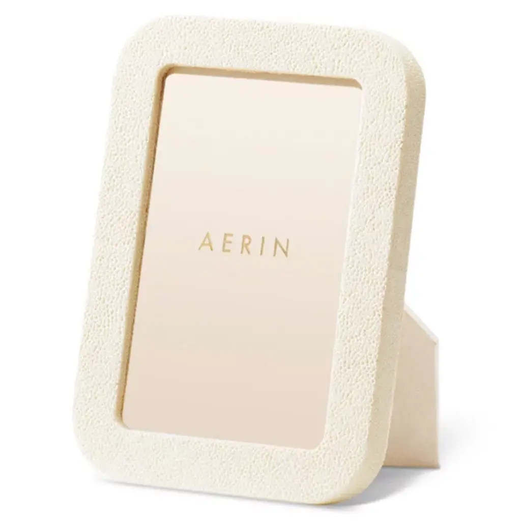 The Modern Shagreen Photo Frame from AERIN takes a minimalist approach with rounded corners that soften the rectangular format. The embossed covering creates texture without additional ornamentation, letting photographs remain the central focus. Curved edges prevent the frame from appearing rigid, while the smooth corners feel comfortable in hand. The textured surface provides a secure grip during photo changes and cleaning. An integrated easel back allows stable tabletop positioning in casual settings like bedrooms or kitchens. This streamlined design complements displayed images rather than competing for attention, making it suitable for everyday family photographs and artwork.