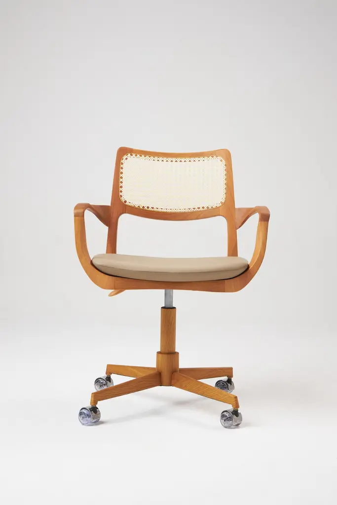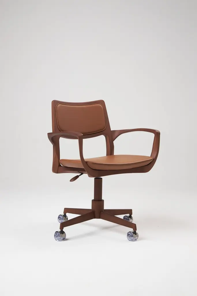 Warm and inviting, the Aurora Collection, prestigious winner of the International IF Design Award 2023 and the German Design Awards 2023, now welcomes an addition with its office chair, further enriching our universe of solutions within the line. This piece contrasts the refined beauty of our collection's chairs, stools and arm chairs incorporating new elements that infuse vitality into office spaces and spark fascination in every solution. Each embodies the guiding thread of the line’s overall concept as well as unique elements of each particular solution, aiming to create points of interest and variations that emanate novelty and arouse interest.Venturing into uncharted creative territories, this remarkable collection crafts a masterpiece that transcends norms, capturing a unique essence. Carved from solid wood blocks, the delicate shapes gracefully rotate along multiple axes, creating majestic contours that blend harmoniously. Each piece in the collection evokes the fluidity and grace of a ballet performance, with a desire for their movements to emanate life.A two-year journey took us from sketches to 3D prints and detailed models. This process refined our design, resulting in durable pieces that blend functionality with aesthetics. The collection transcends the norms for everyday chairs, armchairs, and stools, combining exceptional design, ergonomics, and distinctive identity. The possibilities for customization are endless, allowing for versatile co-creation for every unique and singular project.The office chairs have a swivel mechanism and hight adjustment that allows it to become taller or shorter in seat hight 18.5in to 22.44in (47cm > 57cm) this impact in the overall hight as well in the range of 32.28 in to 36,22 in(82cm > 92cm).