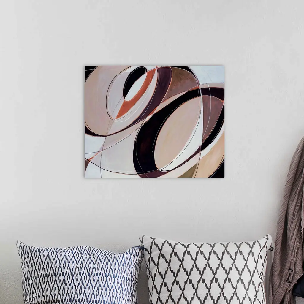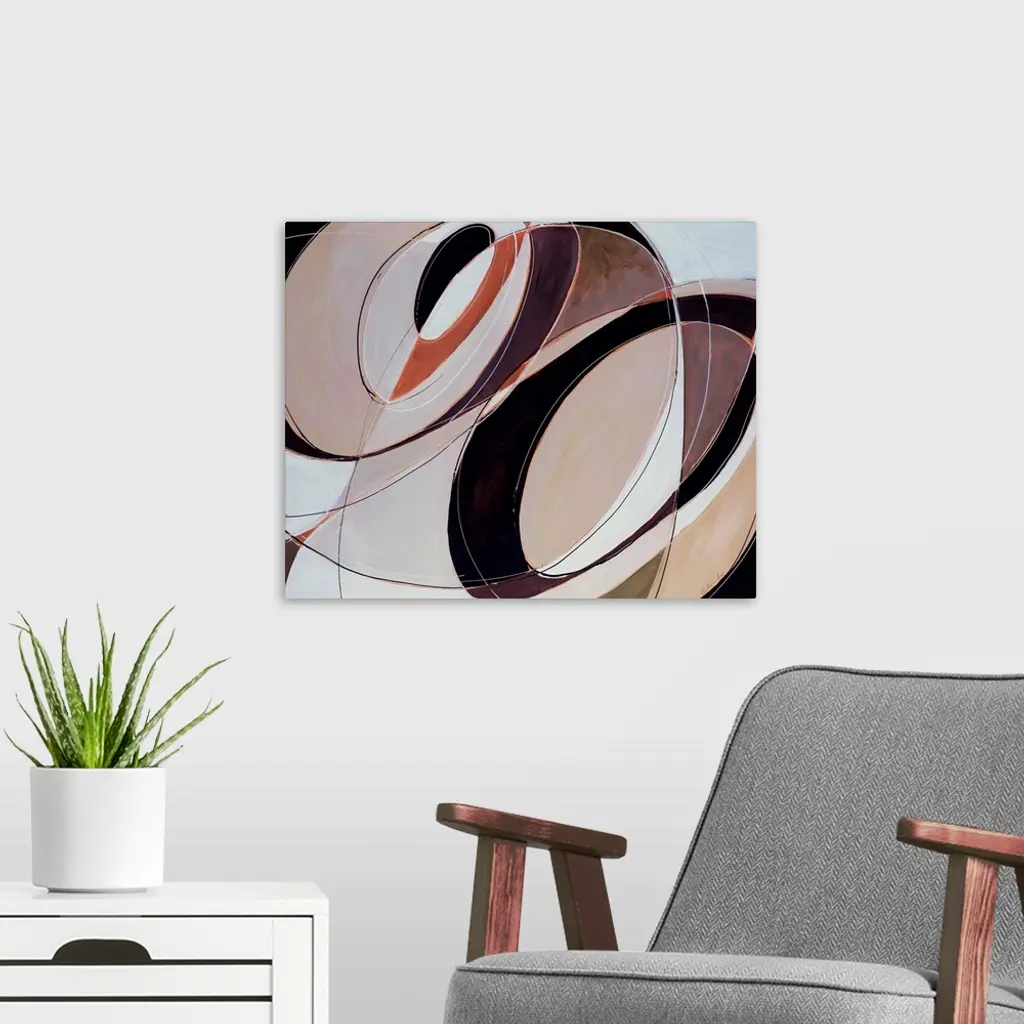 Giant, horizontal, contemporary artwork of multiple, intersecting, circular patterns in several colors that change as they are divided by the crossing lines.