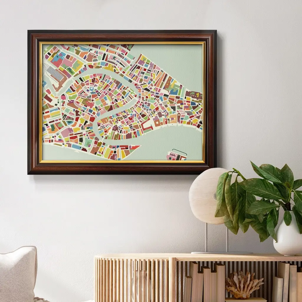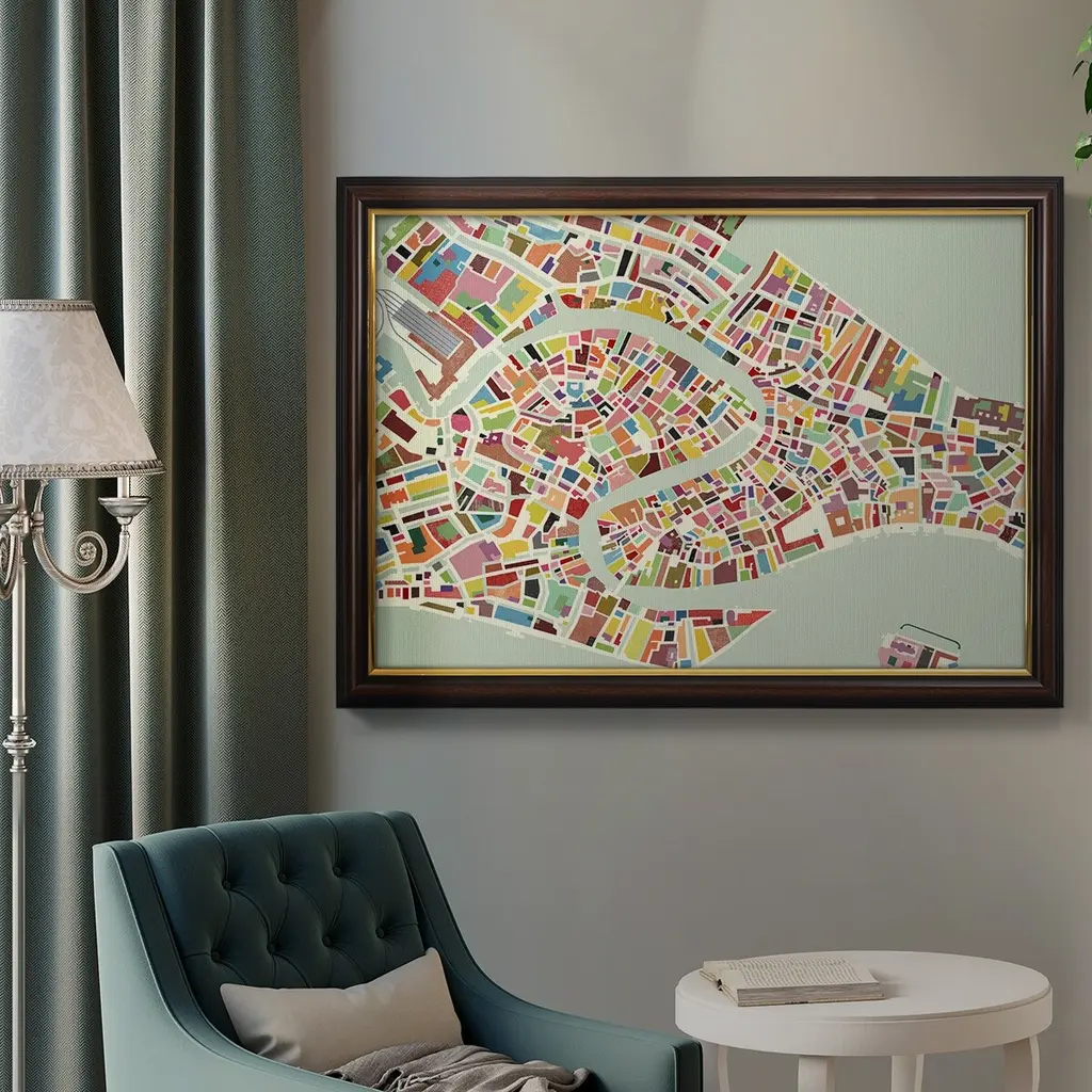 Modern Venice Map Premium Framed Canvas- Ready to Hang A Premium Framed Canvas created to last. Framed in distressed wood and available in an array of sizes and colors Featuring a beveled a solid wood stretcher bar, each piece comes ready to hand 3 SIZES AVAILABLE 16''X20'' - Overall Size 18'X27'' - Overall Size 24''x36'' - Overall Size Each piece is made to order. Each piece comes with hanging hardware. Made in the USA Ready to Hang Giclee Paper Print Acrylic Glass Beveled Matt Board