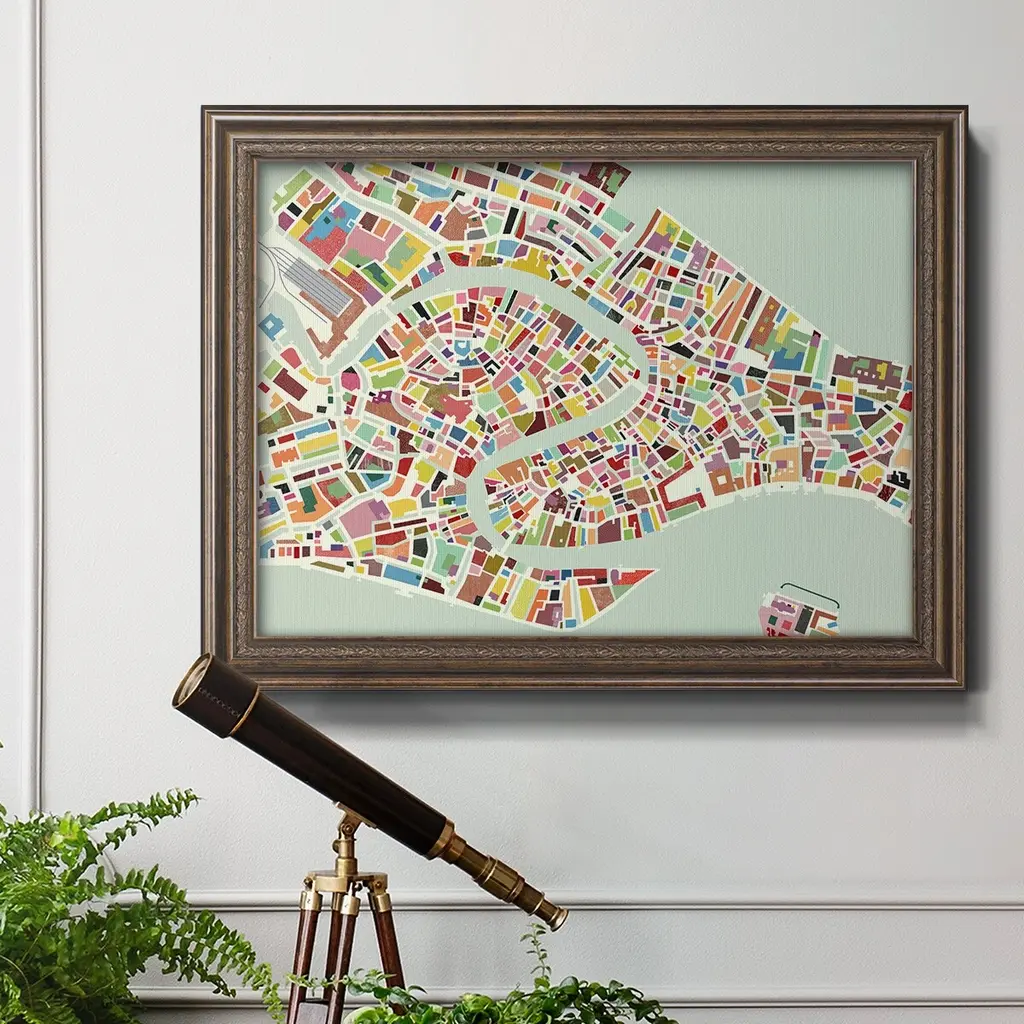 Modern Venice Map Premium Framed Canvas- Ready to Hang A Premium Framed Canvas created to last. Framed in distressed wood and available in an array of sizes and colors Featuring a beveled a solid wood stretcher bar, each piece comes ready to hand 3 SIZES AVAILABLE 16''X20'' - Overall Size 18'X27'' - Overall Size 24''x36'' - Overall Size Each piece is made to order. Each piece comes with hanging hardware. Made in the USA Ready to Hang Giclee Paper Print Acrylic Glass Beveled Matt Board