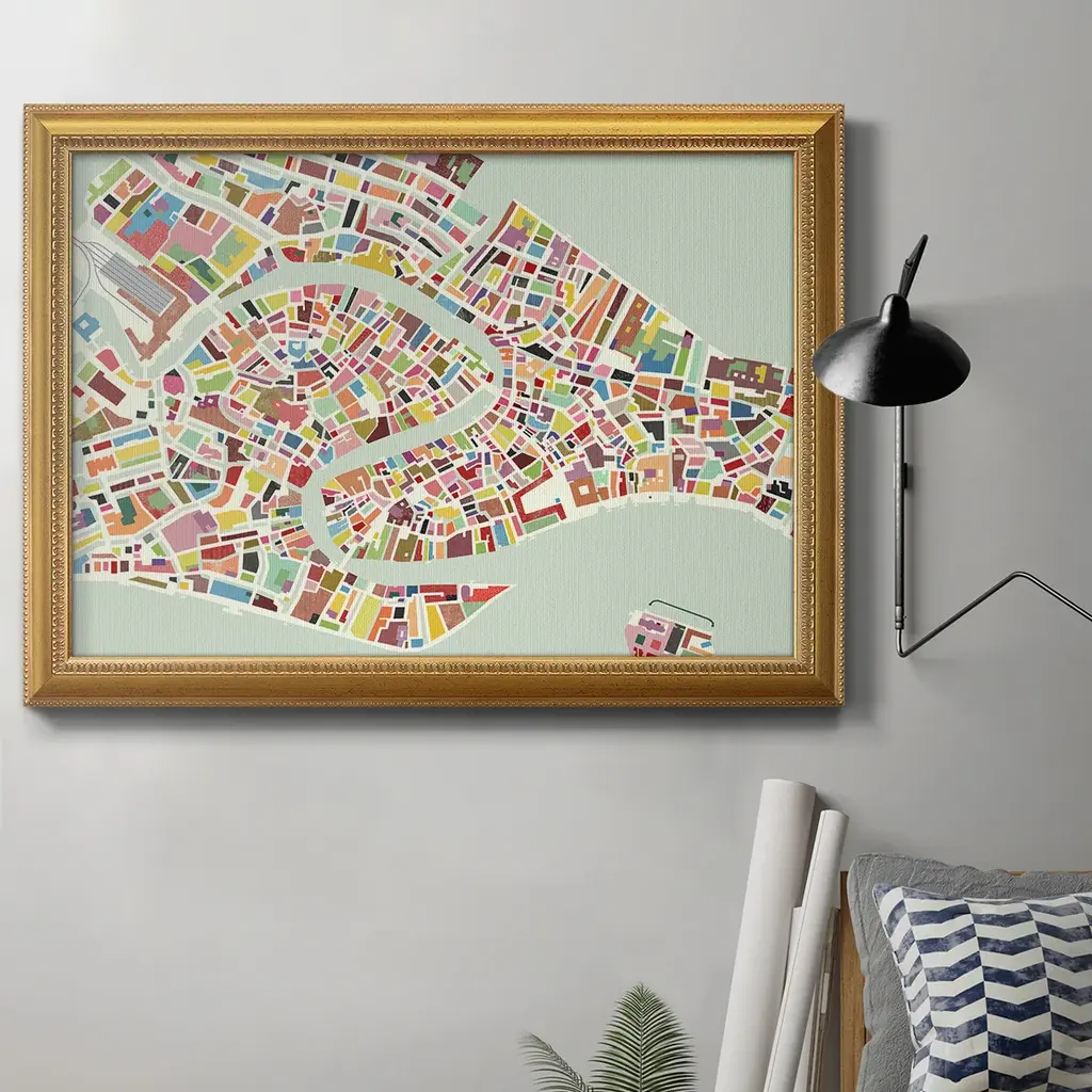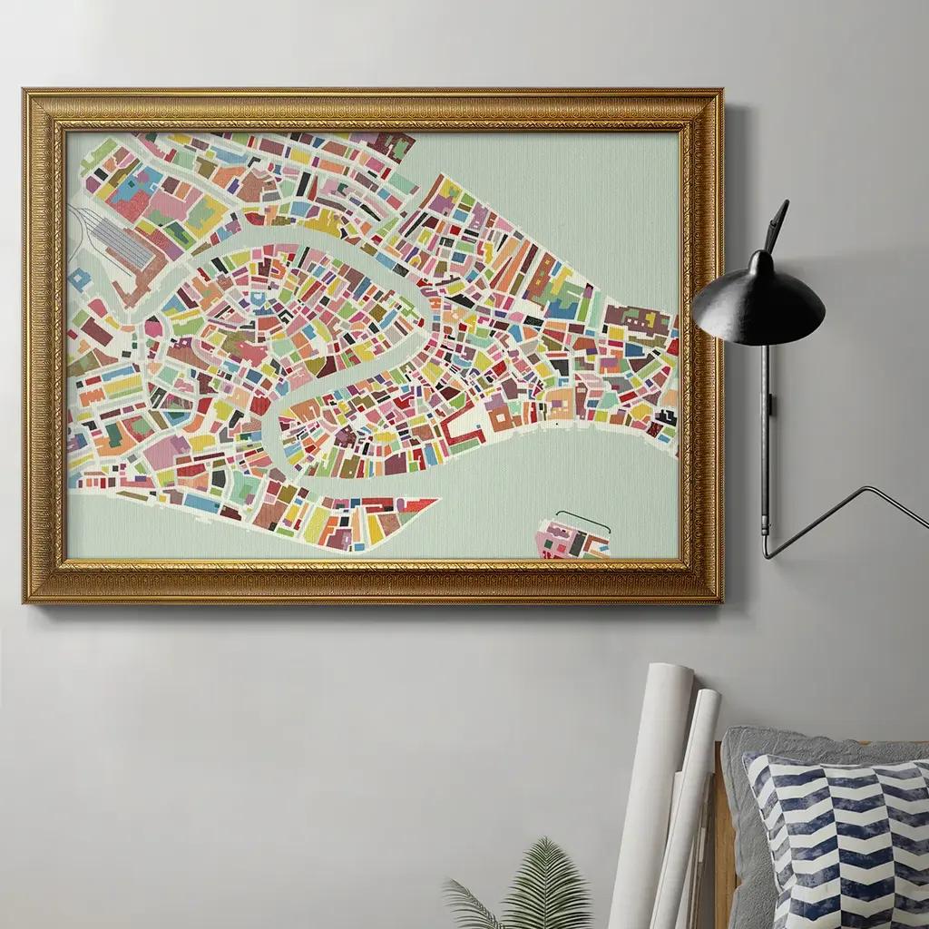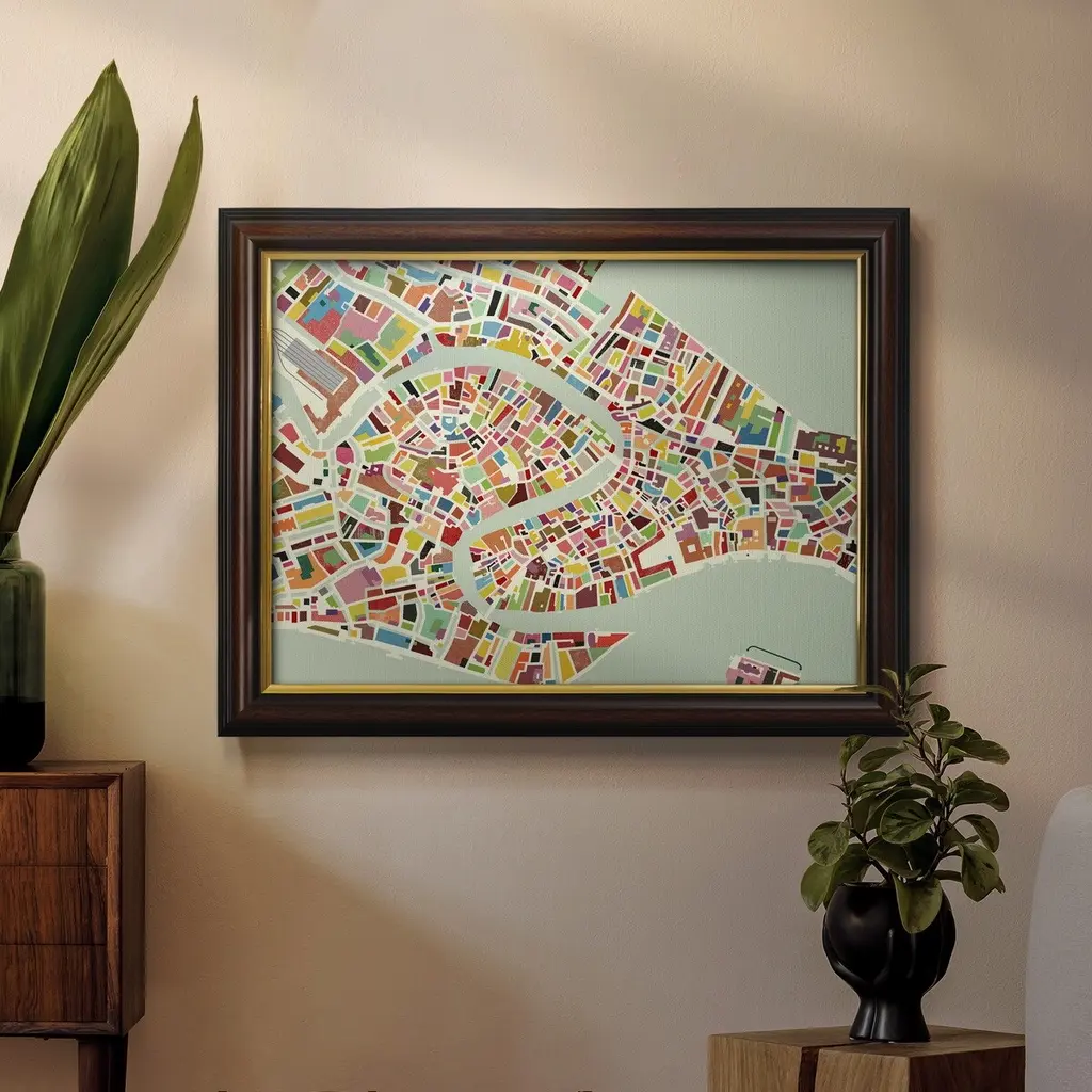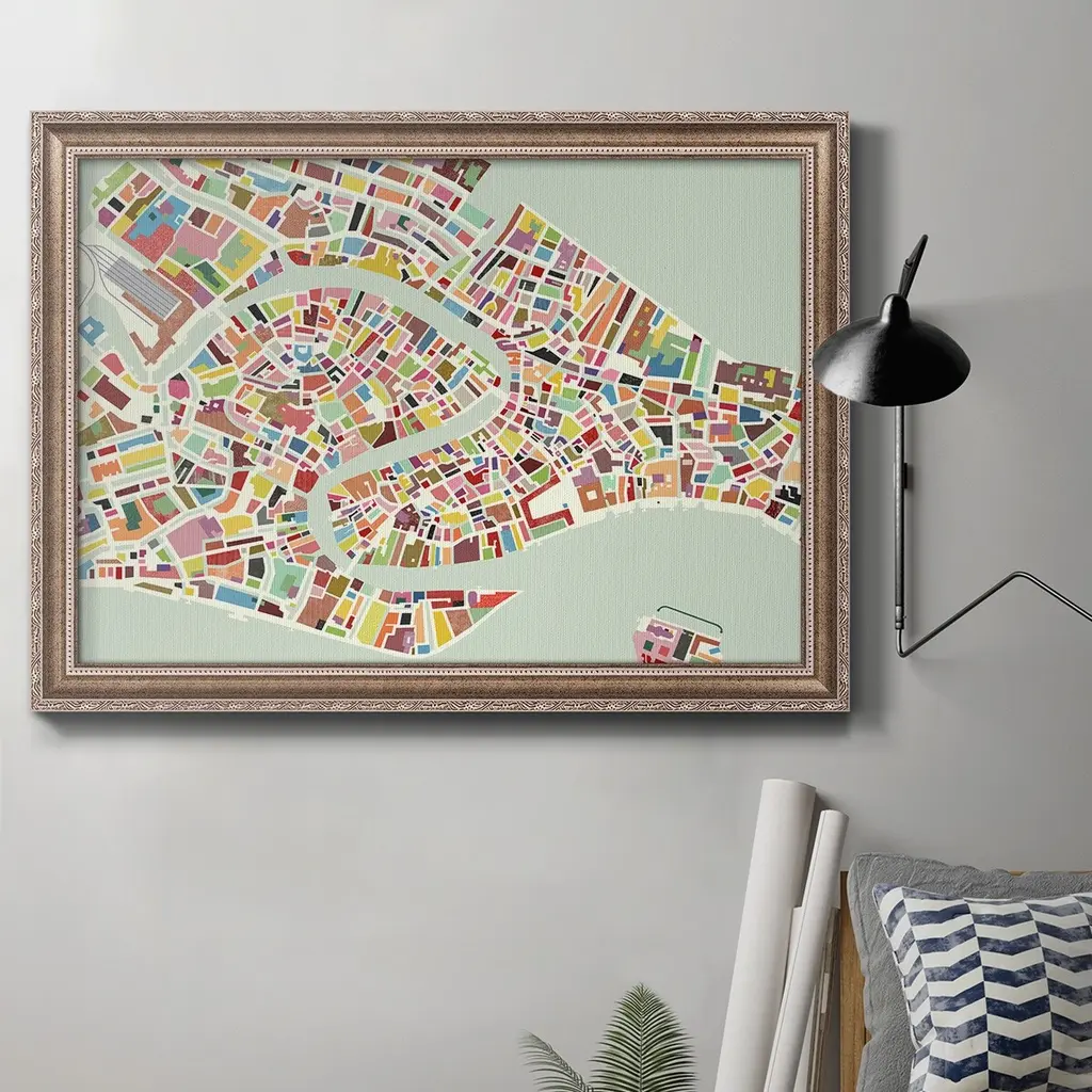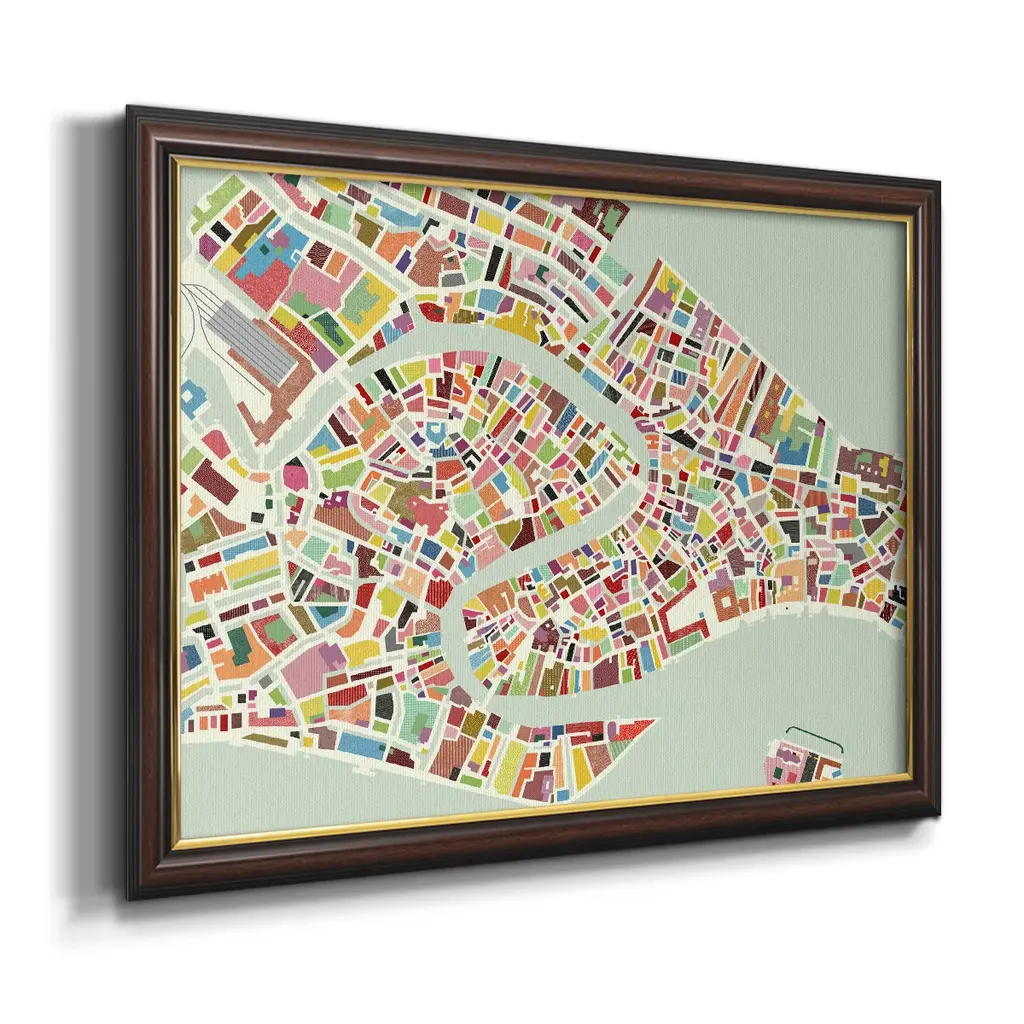Modern Venice Map Premium Framed Canvas- Ready to Hang A Premium Framed Canvas created to last. Framed in distressed wood and available in an array of sizes and colors Featuring a beveled a solid wood stretcher bar, each piece comes ready to hand 3 SIZES AVAILABLE 16''X20'' - Overall Size 18'X27'' - Overall Size 24''x36'' - Overall Size Each piece is made to order. Each piece comes with hanging hardware. Made in the USA Ready to Hang Giclee Paper Print Acrylic Glass Beveled Matt Board