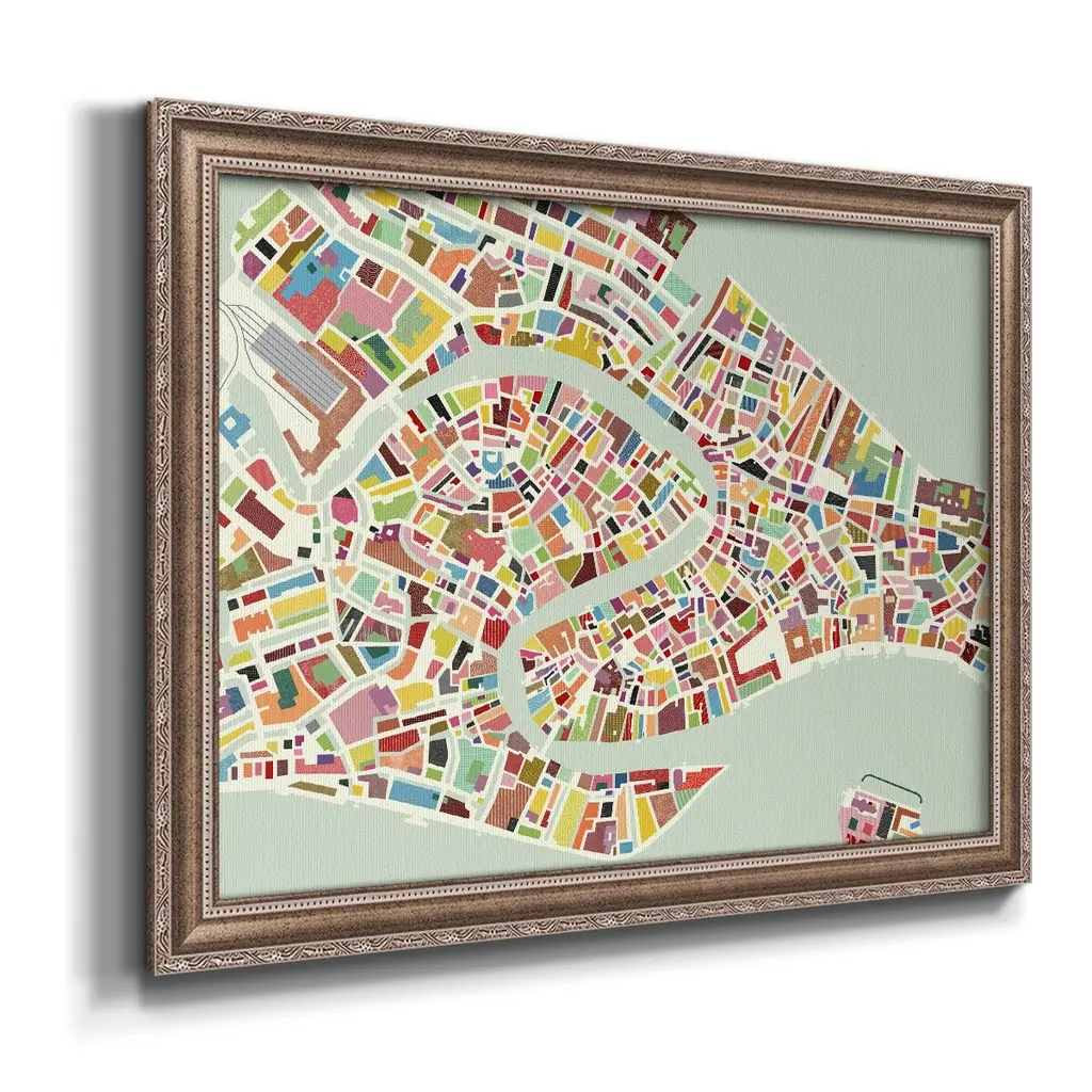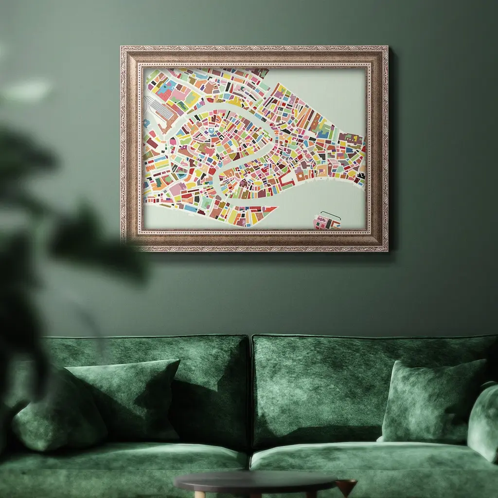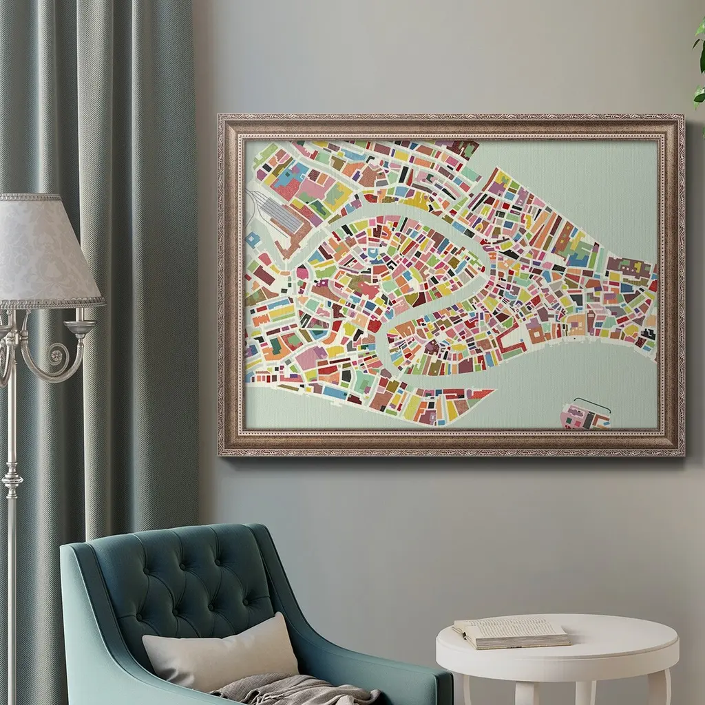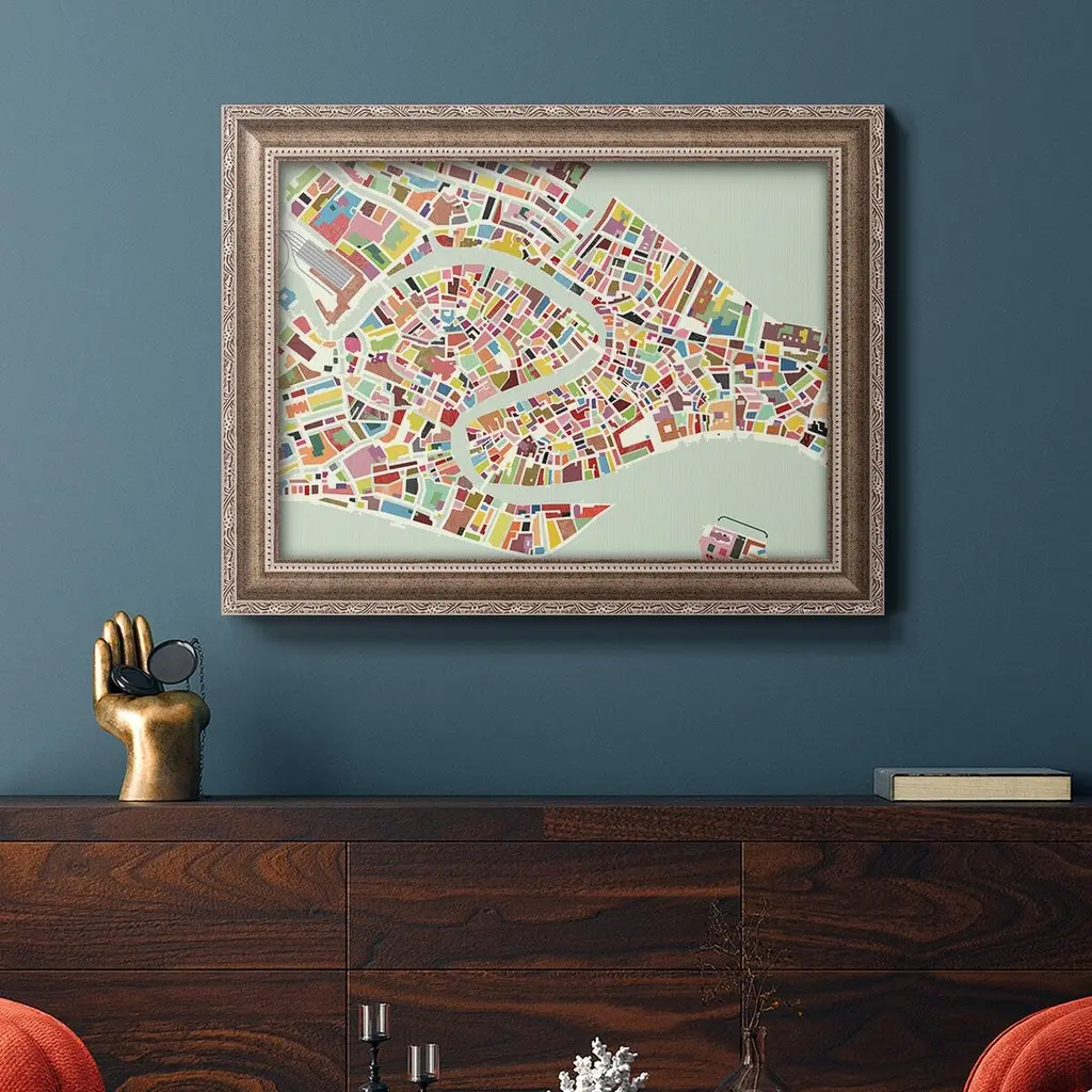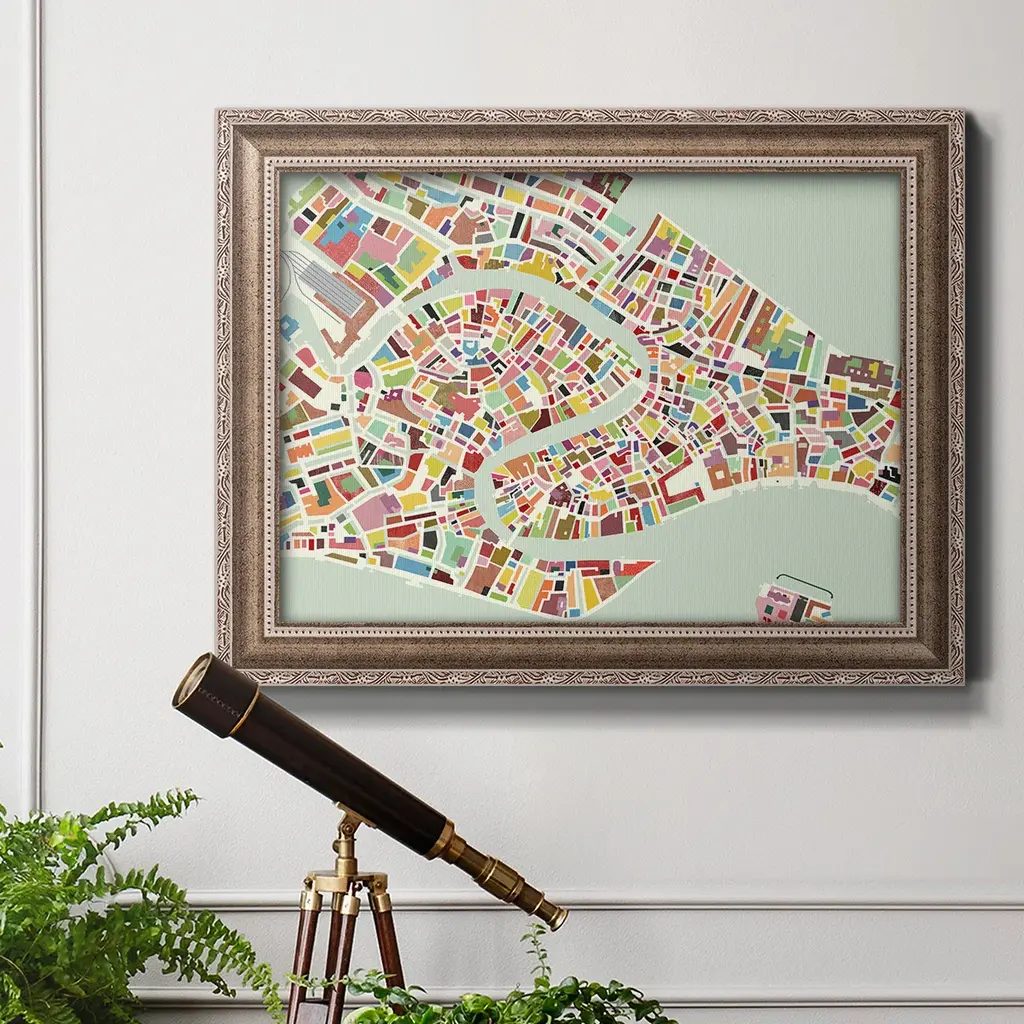 Modern Venice Map Premium Framed Canvas- Ready to Hang A Premium Framed Canvas created to last. Framed in distressed wood and available in an array of sizes and colors Featuring a beveled a solid wood stretcher bar, each piece comes ready to hand 3 SIZES AVAILABLE 16''X20'' - Overall Size 18'X27'' - Overall Size 24''x36'' - Overall Size Each piece is made to order. Each piece comes with hanging hardware. Made in the USA Ready to Hang Giclee Paper Print Acrylic Glass Beveled Matt Board