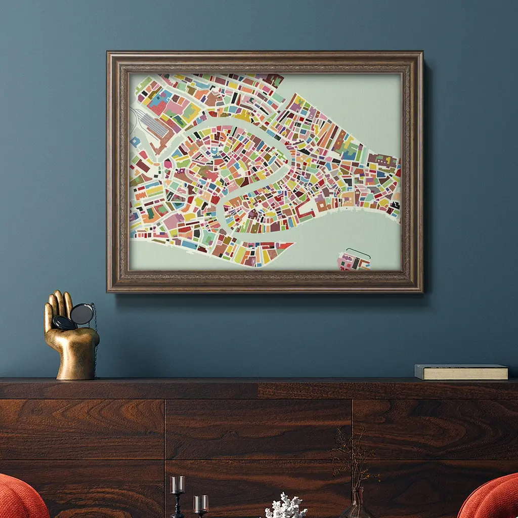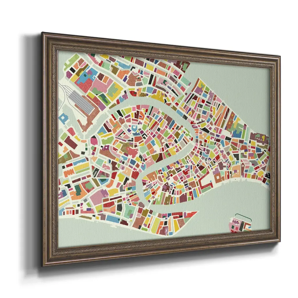 Modern Venice Map Premium Framed Canvas- Ready to Hang A Premium Framed Canvas created to last. Framed in distressed wood and available in an array of sizes and colors Featuring a beveled a solid wood stretcher bar, each piece comes ready to hand 3 SIZES AVAILABLE 16''X20'' - Overall Size 18'X27'' - Overall Size 24''x36'' - Overall Size Each piece is made to order. Each piece comes with hanging hardware. Made in the USA Ready to Hang Giclee Paper Print Acrylic Glass Beveled Matt Board
