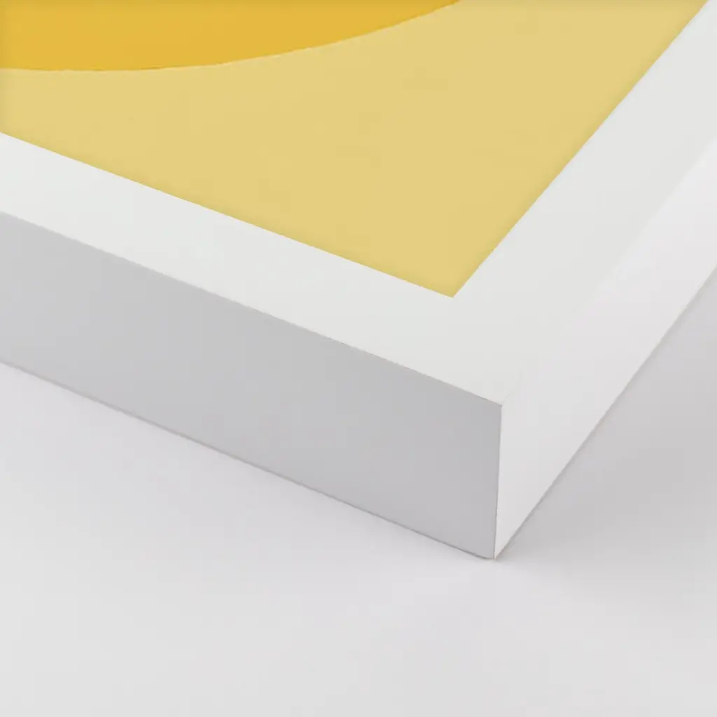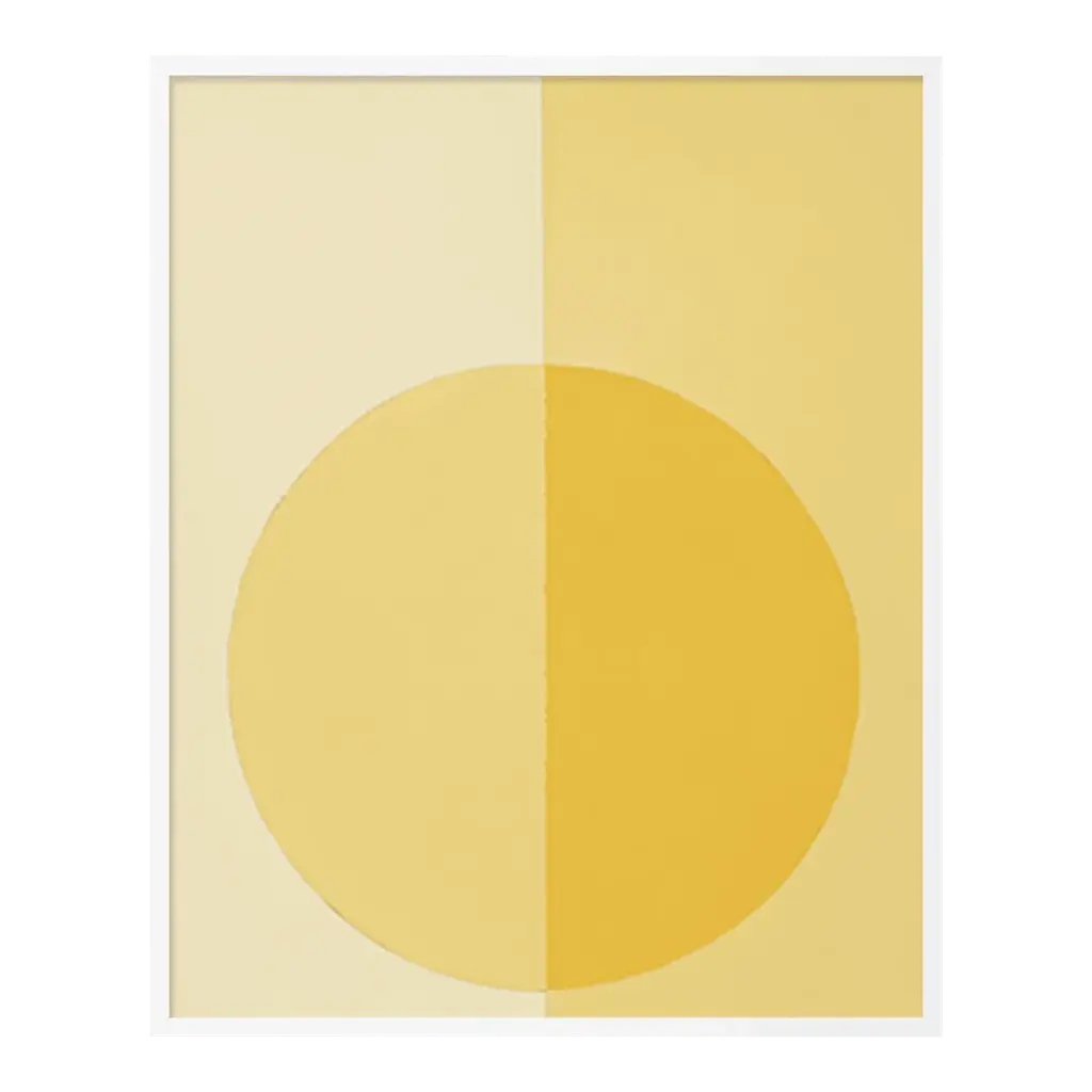 DESCRIPTION: Modern Yellow Forever by Stephanie Henderson in White Frame, Large Art Print SPECIFICATIONS: Type: Giclée Art Print on Matte Paper. Overall Size (in): 32x40. Image Size (in): 31x39. Orientation: Vertical. Flush/Float/Matted: Flush. Frame Color: White. Hanging Hardware: Picture Perfect. FRAMING: Each art work arrives framed and ready to hang. We use handmade frames with a plexiglass glazing front, because it offers less glare than standard glass. At this time, we only offer framed prints. ARTIST BIO: Stephanie Lear Henderson is a painter living in Ponte Vedra Beach, Florida. Her work can be found in collections throughout the US and Canada. Working primarily in hard-edge abstraction, she also occasionally paints representational works in oil. A native of Thomasville, Georgia, Stephanie earned a B.A. in English Literature from the University of Virginia and an M.A. in Journalism from the University of Georgia. Stephanie’s work revolves around bold, saturated color and how colors communicate with each other and affect the observer. Her paintings contain forms that are simple, allowing the colors to express themselves without complications. Stephanie’s work reveals focus, precision, and an insatiable appetite for evocative combinations of color. She revels in the challenge of painting perfectly clean lines freehand with a brush. No tape. No masking.Stephanie embraces the belief that color alters mood, outlook, and brings absolute joy to life. Stephanie's artwork has appeared in a multitued of publications including House Beautiful and The CUT.
