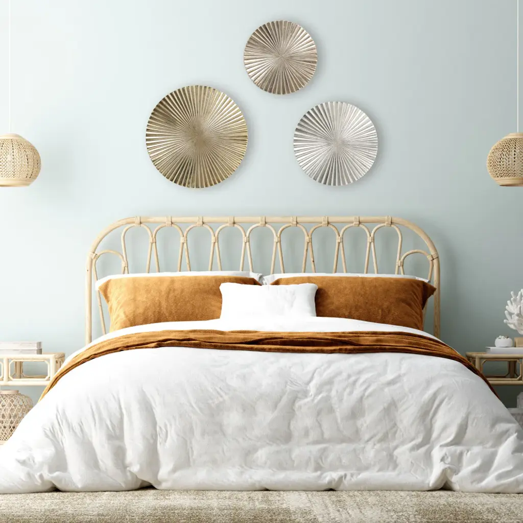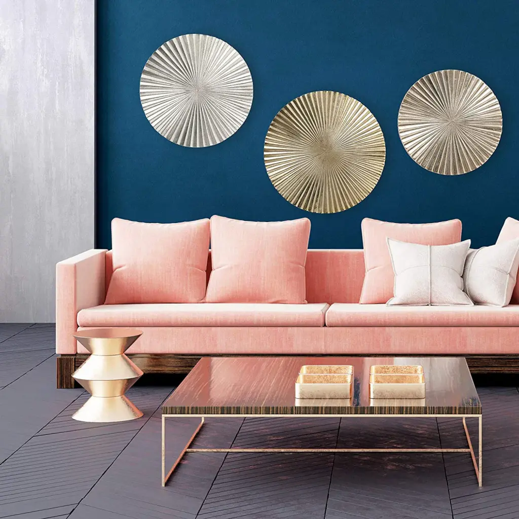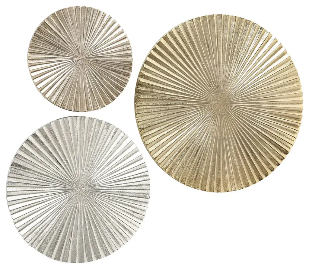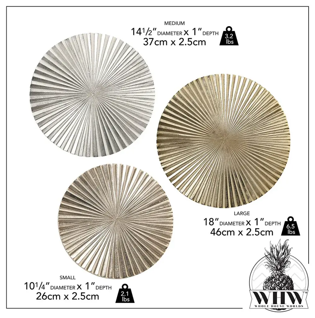 Enliven any space with energy by infusing your wall decor this set of 3 metallic roundels. Loaded with personality and style, suggest the radiance of the sun with their luxuriant incised lines. Always interesting to look at, ambient light is reflected as lighting in a room changes. Position strategically this set of roundels to take best advantage of wall space needs, be it vertical or horizontal. Especially suited for use behind a couch, above a bed, or over mantel for a dramatic statement. Since it is made by hand, each piece will be slightly unique and no two will be exactly the same.
