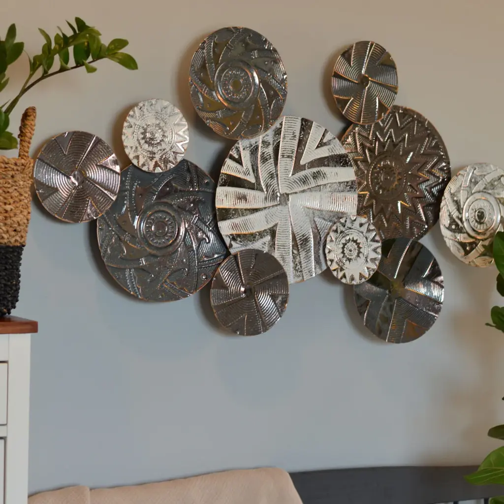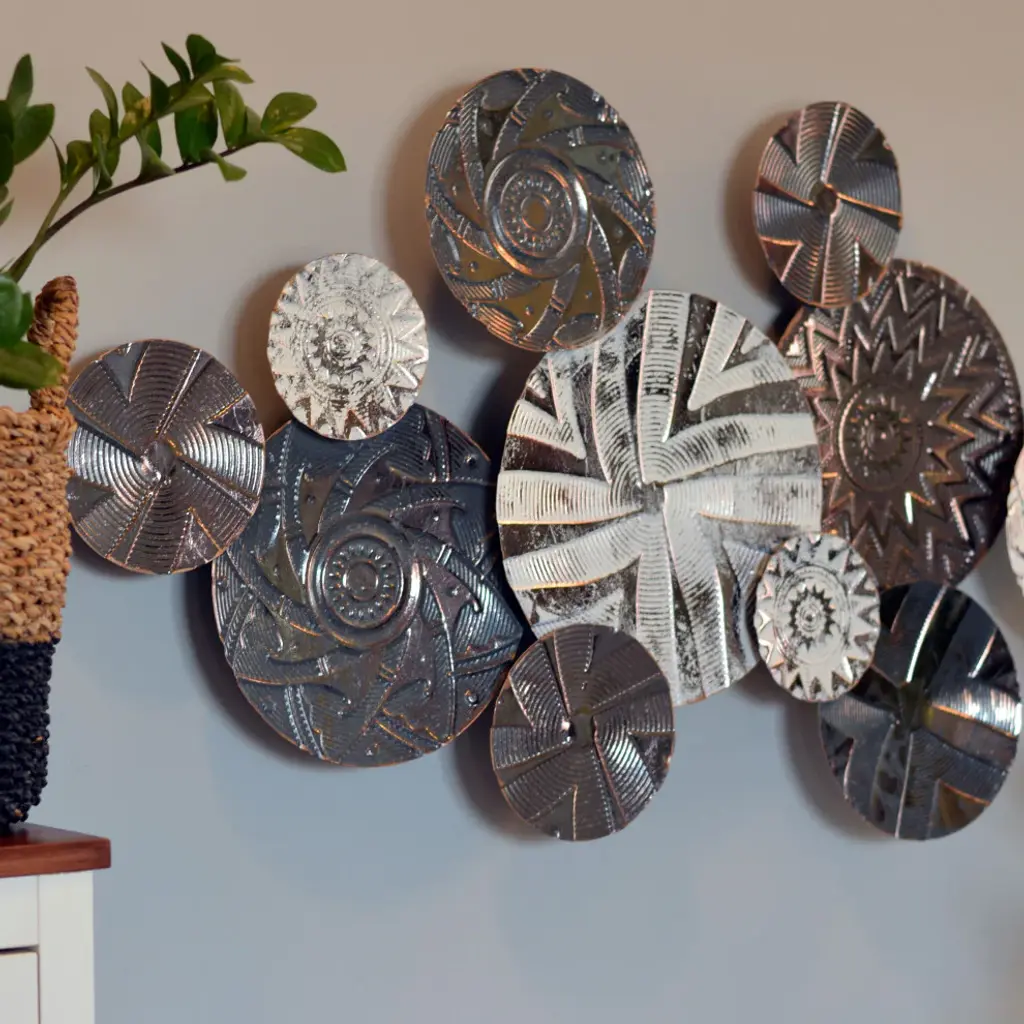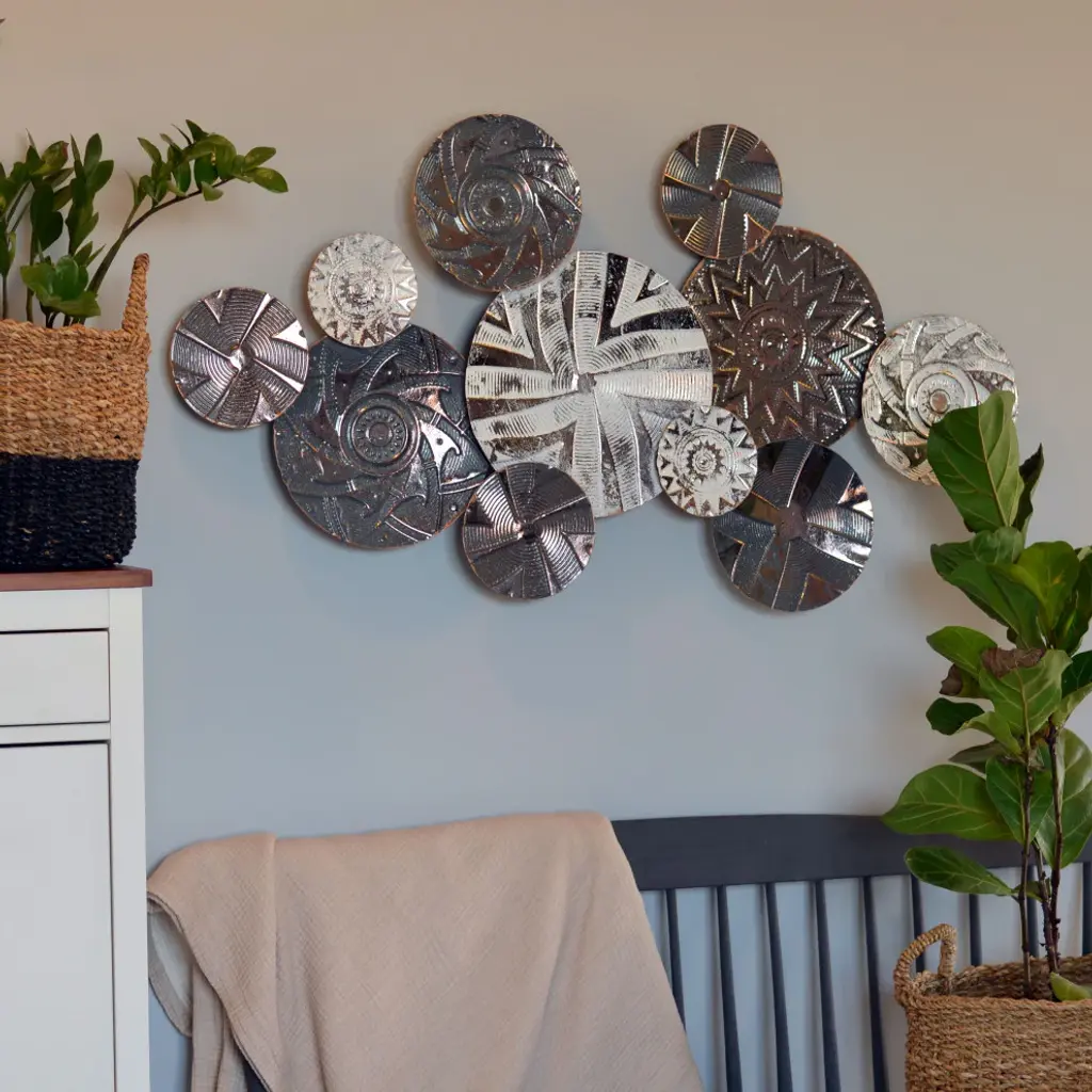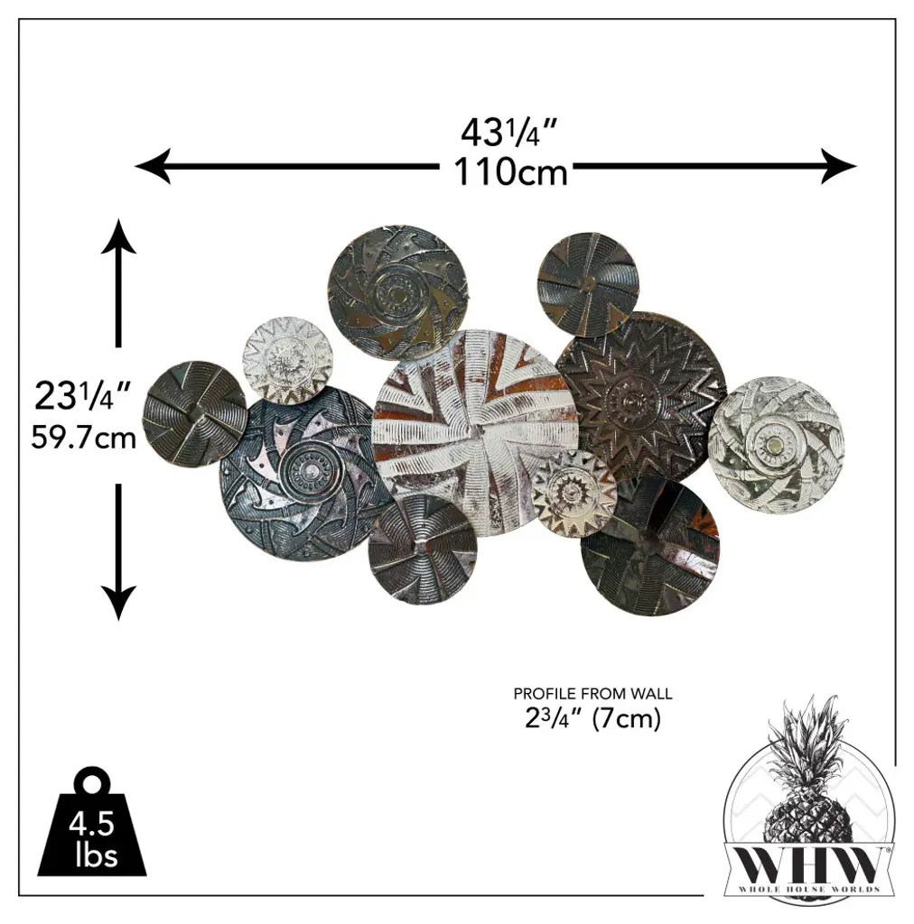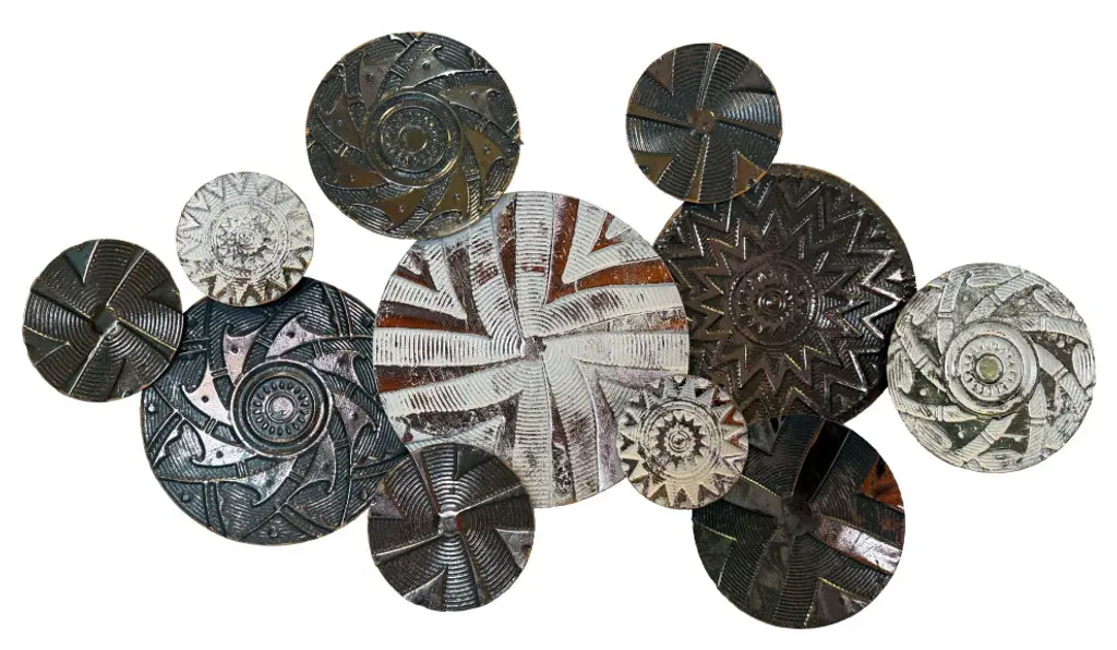 Visually rhythmic, this statement wall art decor is comprised of eye-catching white washed and grey roundels that feel rustic yet modern at the same time.Handcrafted of durable iron and painted, the 11 connected rounds offer distinct character, size and texture. Each piece is unique due to its artisanal nature and no two will be exactly alike. Well sized, this piece measures as follows: 2.75 L x 43.25 W x 23.5 H inches (7.0 L x 110.0 W x 60.0 H cm). Luxurious and layered with juxtapositioned zig-zag, burst and intersecting stripe patterns on each round make this an ideal focal point.Display horizontally, vertically or on a diagonal. A sturdy armature is cleverly hidden on the reverse that offers easy to use hanging loops.