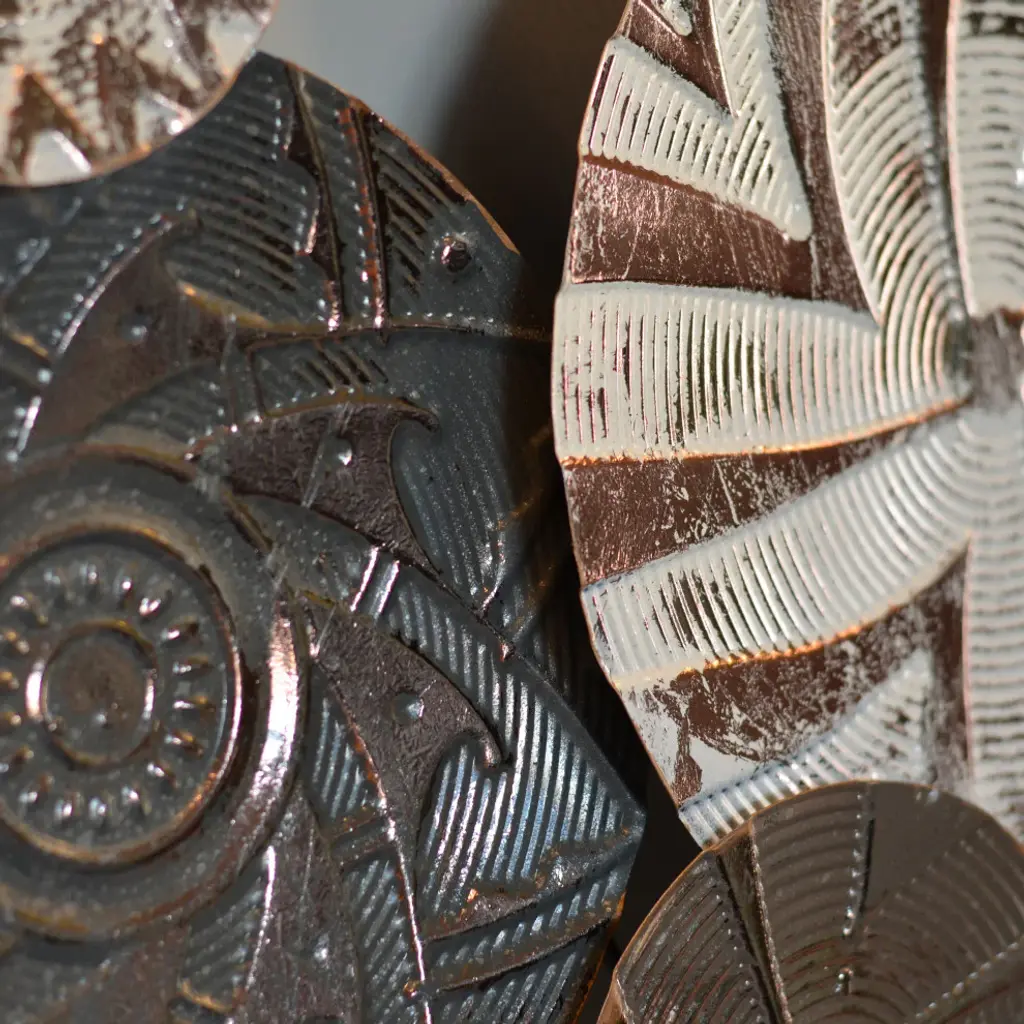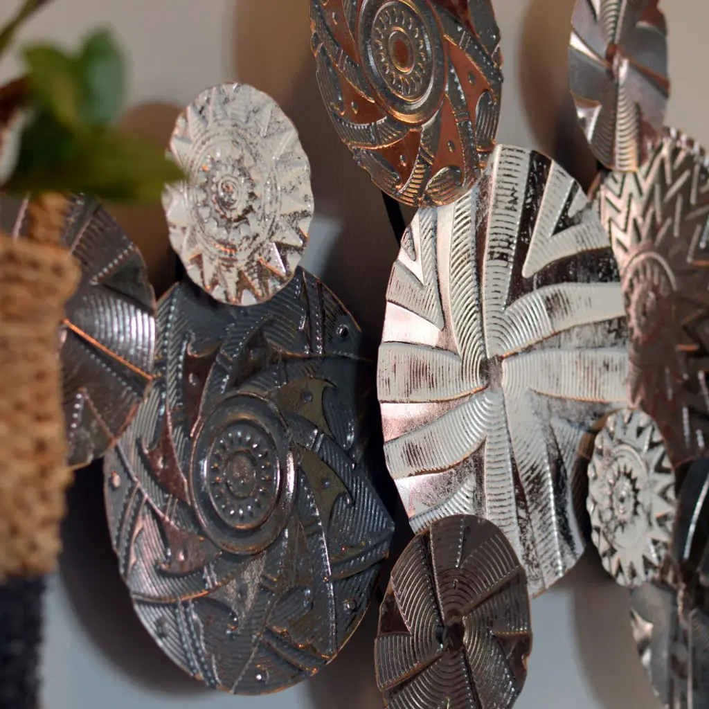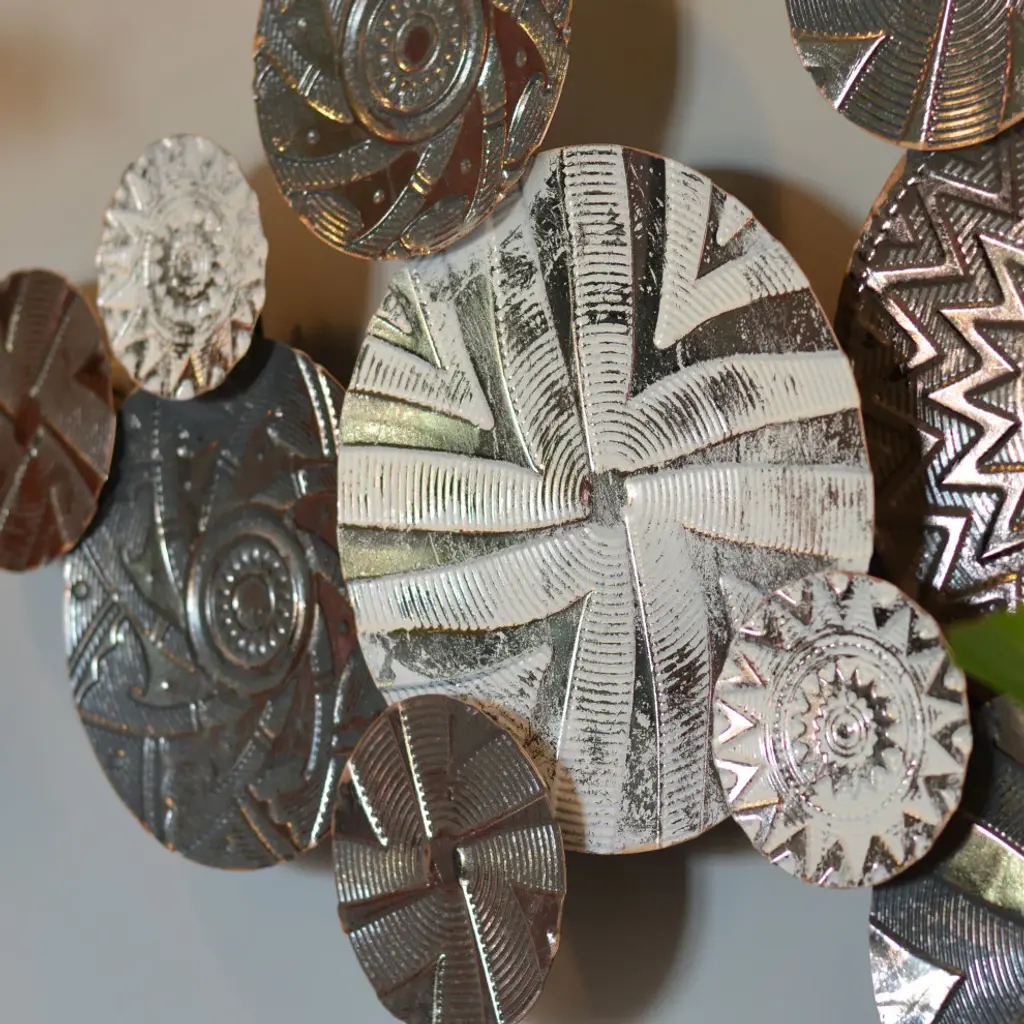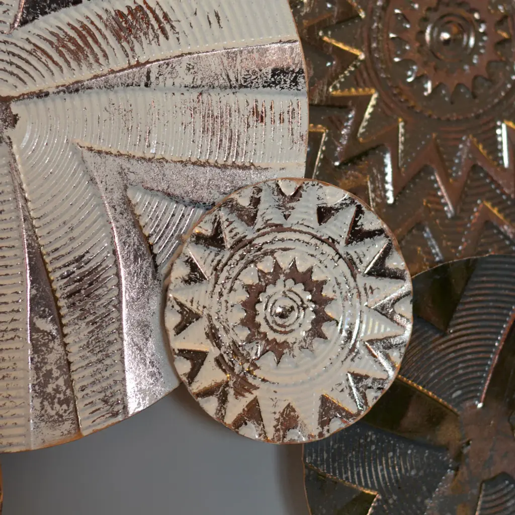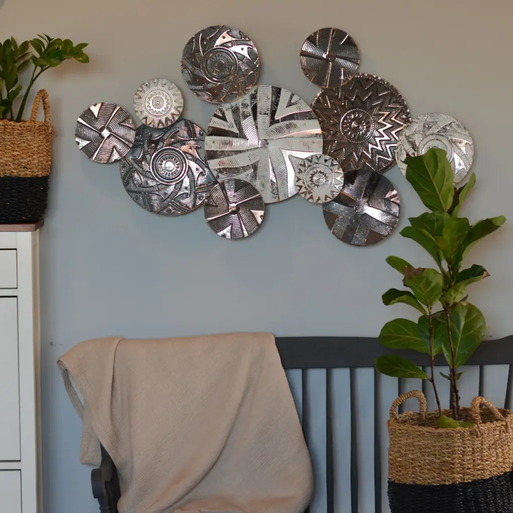 Visually rhythmic, this statement wall art decor is comprised of eye-catching white washed and grey roundels that feel rustic yet modern at the same time.Handcrafted of durable iron and painted, the 11 connected rounds offer distinct character, size and texture. Each piece is unique due to its artisanal nature and no two will be exactly alike. Well sized, this piece measures as follows: 2.75 L x 43.25 W x 23.5 H inches (7.0 L x 110.0 W x 60.0 H cm). Luxurious and layered with juxtapositioned zig-zag, burst and intersecting stripe patterns on each round make this an ideal focal point.Display horizontally, vertically or on a diagonal. A sturdy armature is cleverly hidden on the reverse that offers easy to use hanging loops.
