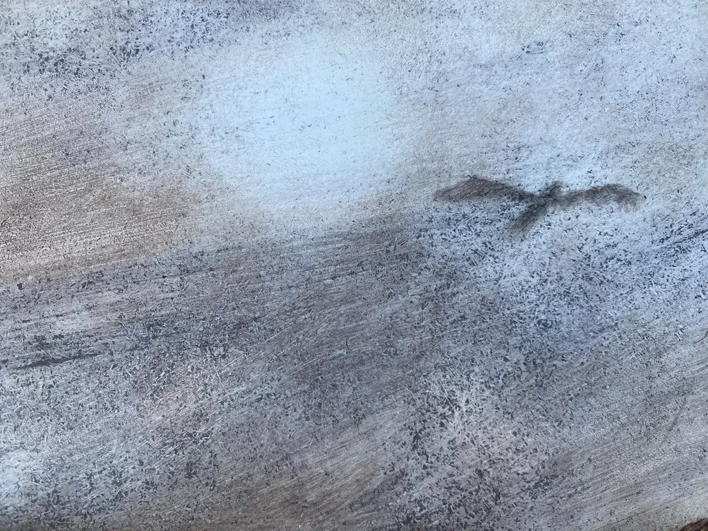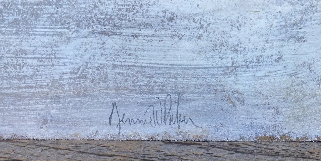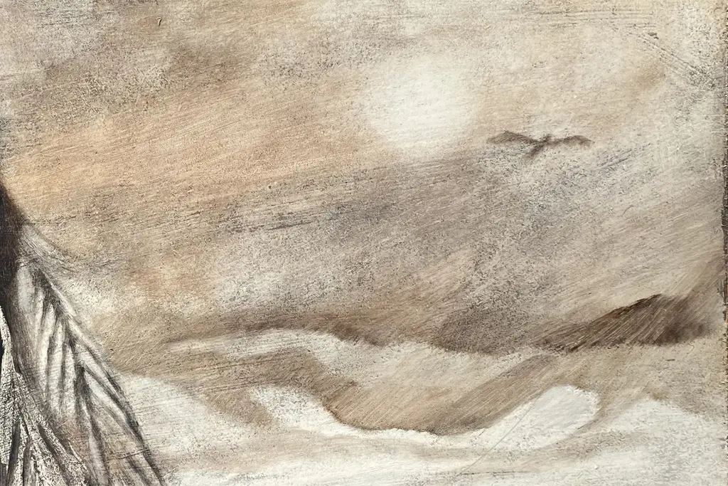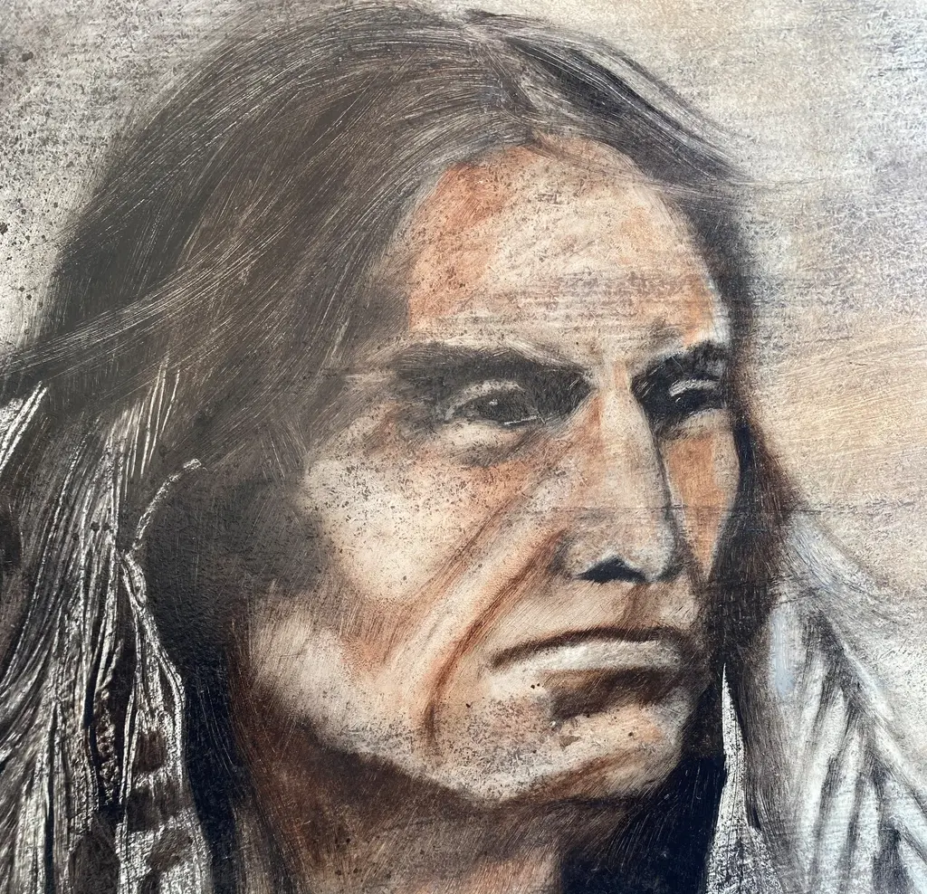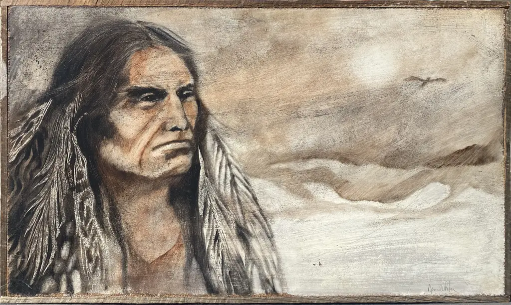 anthon Signed lower right 'Jennie Whiken.' This oil shows a Native American man gazing off into the distance. He is backed by a desert scene and a bird flying into the white-hot sun.