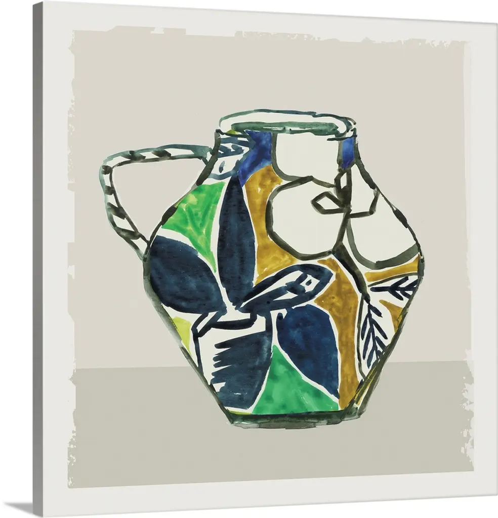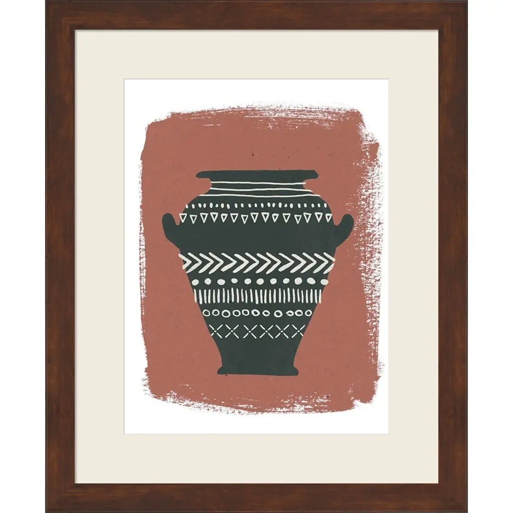 Global Vessels IV by Moira Hershey is a high quality piece of framed artwork. The finished size of this piece is 18.75" X 22.75". It has a Slim Solid Pecan Brown Flat with Satin Finish frame, is single matted and finished with high quality Acrylic Plexiglass. 100% Satisfaction Guaranteed.