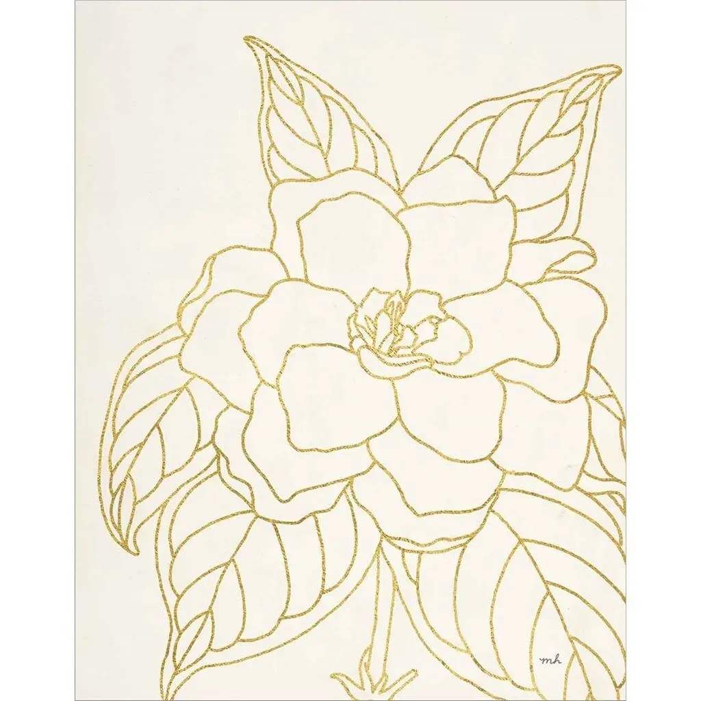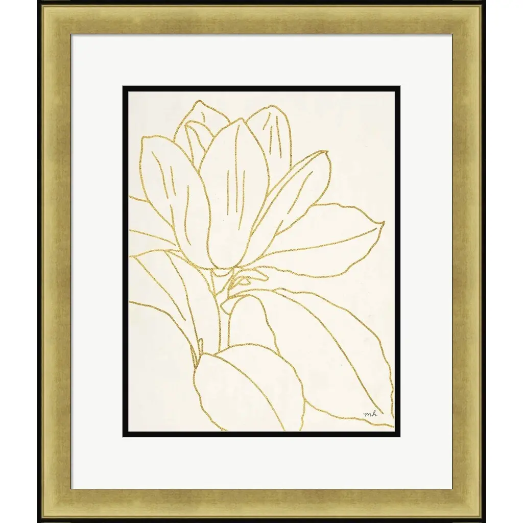 Gold Magnolia Line Drawing v2 Crop by Moira Hershey is a high quality piece of framed artwork. The finished size of this piece is 19.75" X 23". It has a Gold Black Accent Contemporary frame, is double matted and finished with high quality Acrylic Plexiglass. 100% Satisfaction Guaranteed.