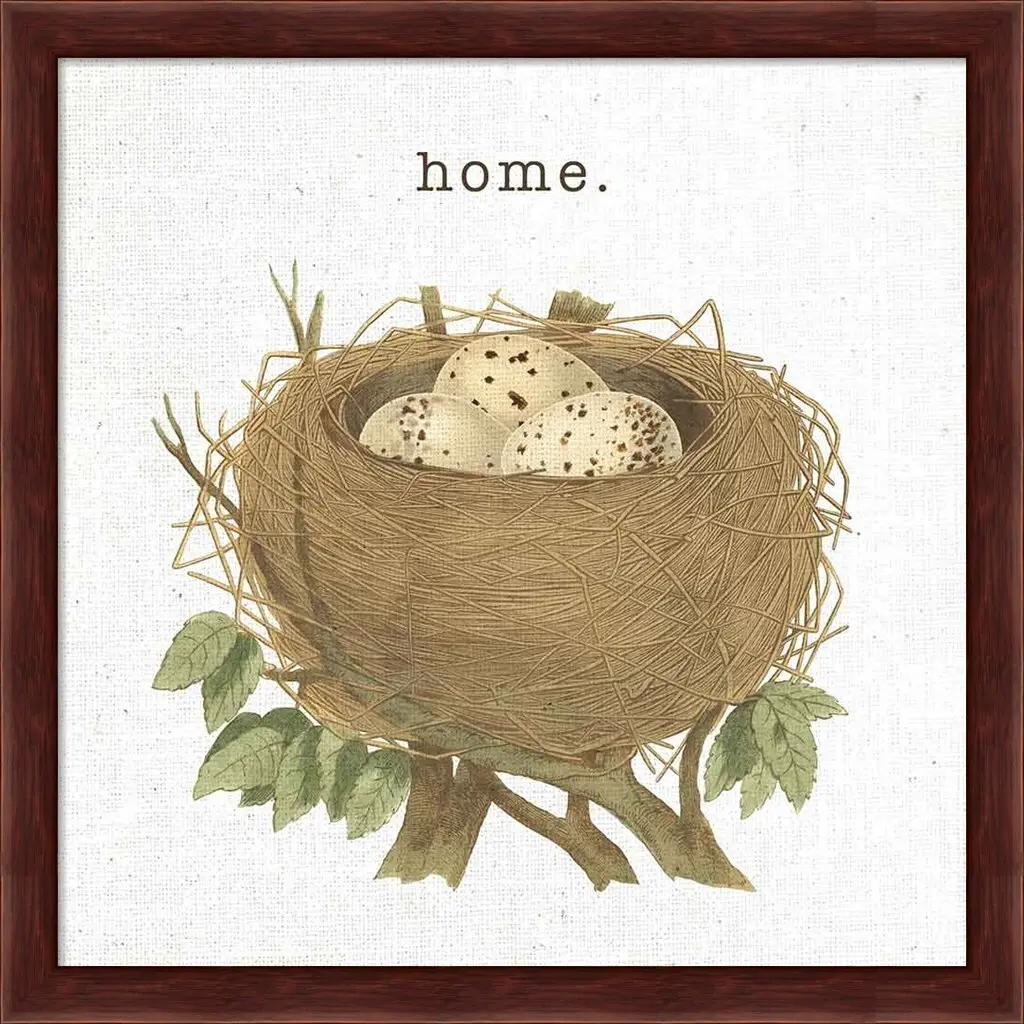Spring Nest II Home by Moira Hershey is a high quality piece of framed artwork. The finished size of this piece is 13.25" X 13.25" with an image size of 12" X 12". It has a Mahogany Deep Box frame and is finished with high quality glass. 100% Satisfaction Guaranteed.