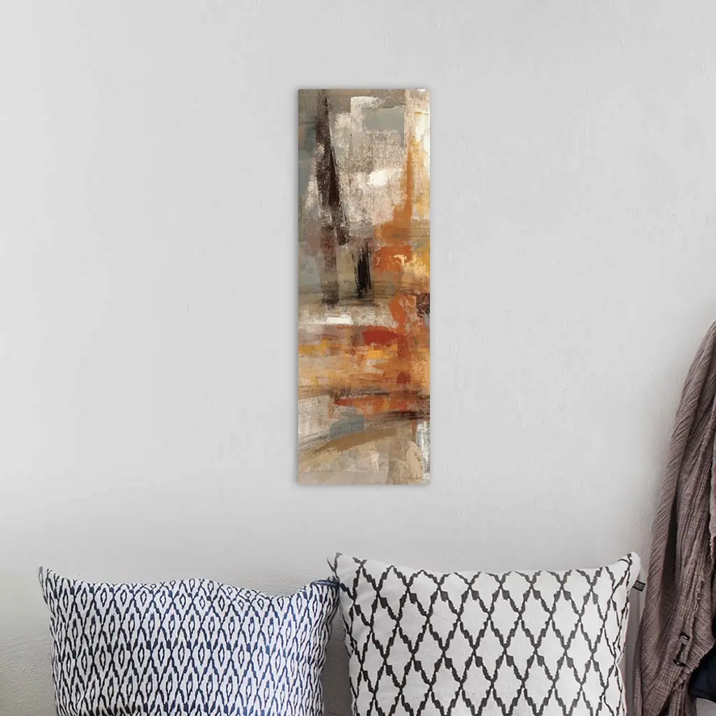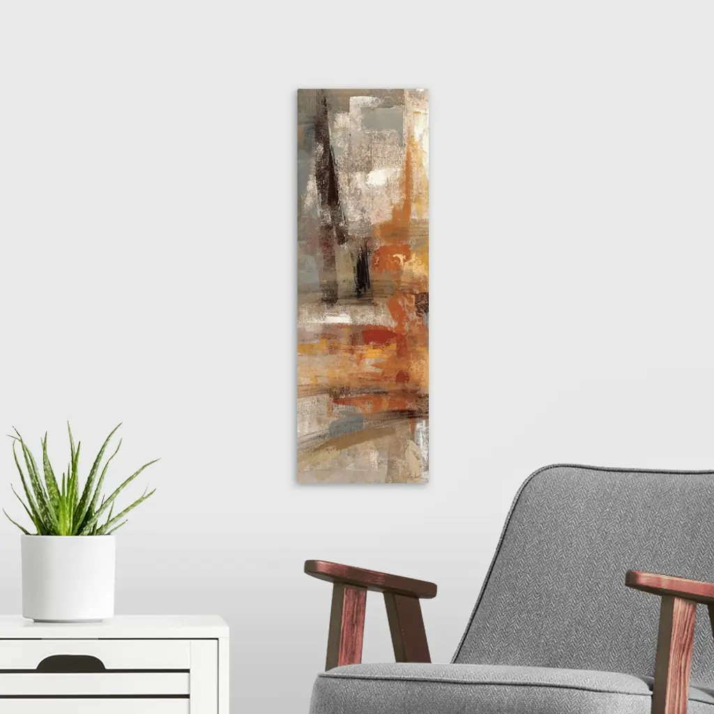 An abstract piece of art with brush strokes of earthy tones giving the painting depth.