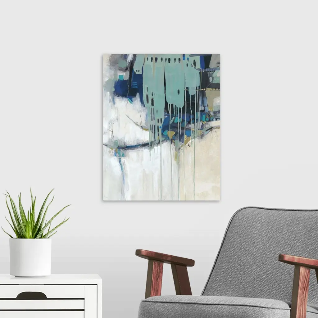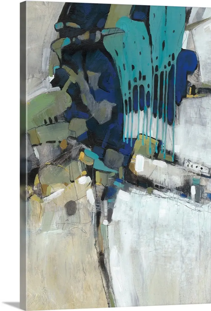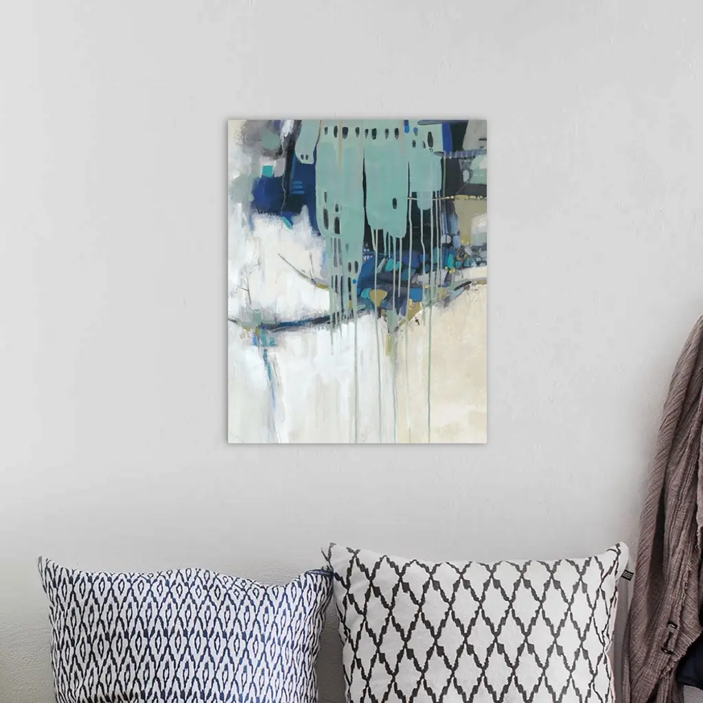 Contemporary abstract painting in teal, navy, and neutral hues.