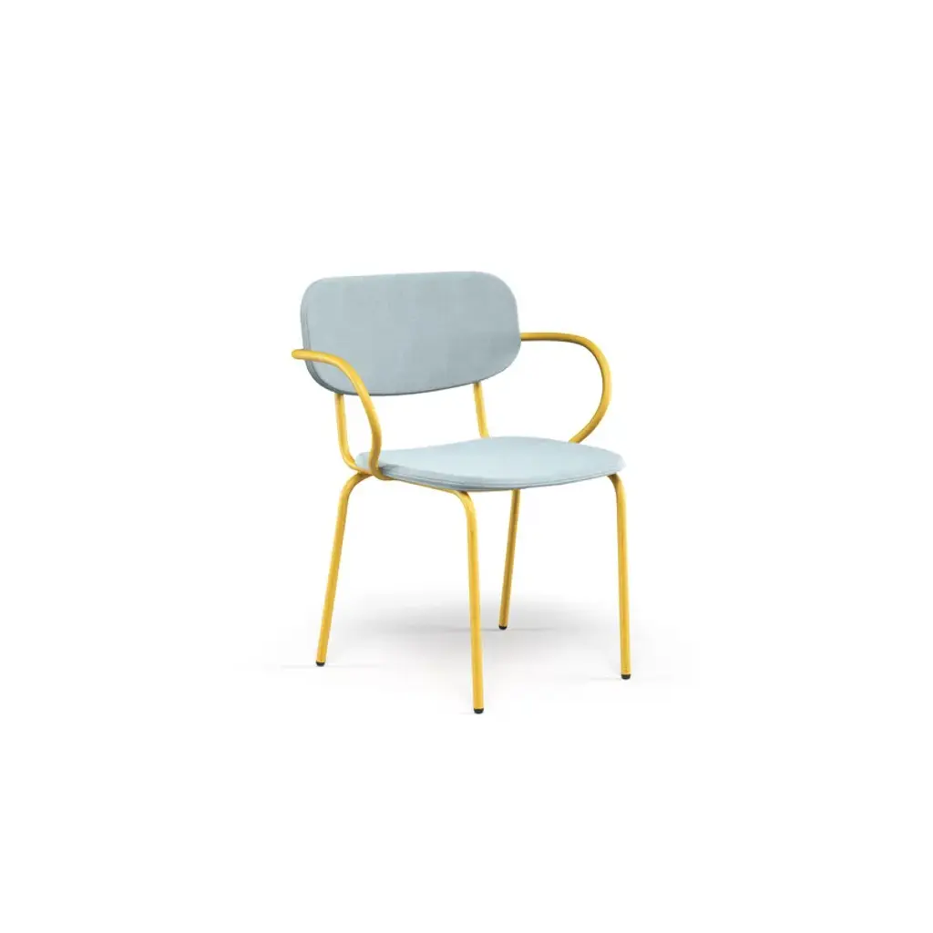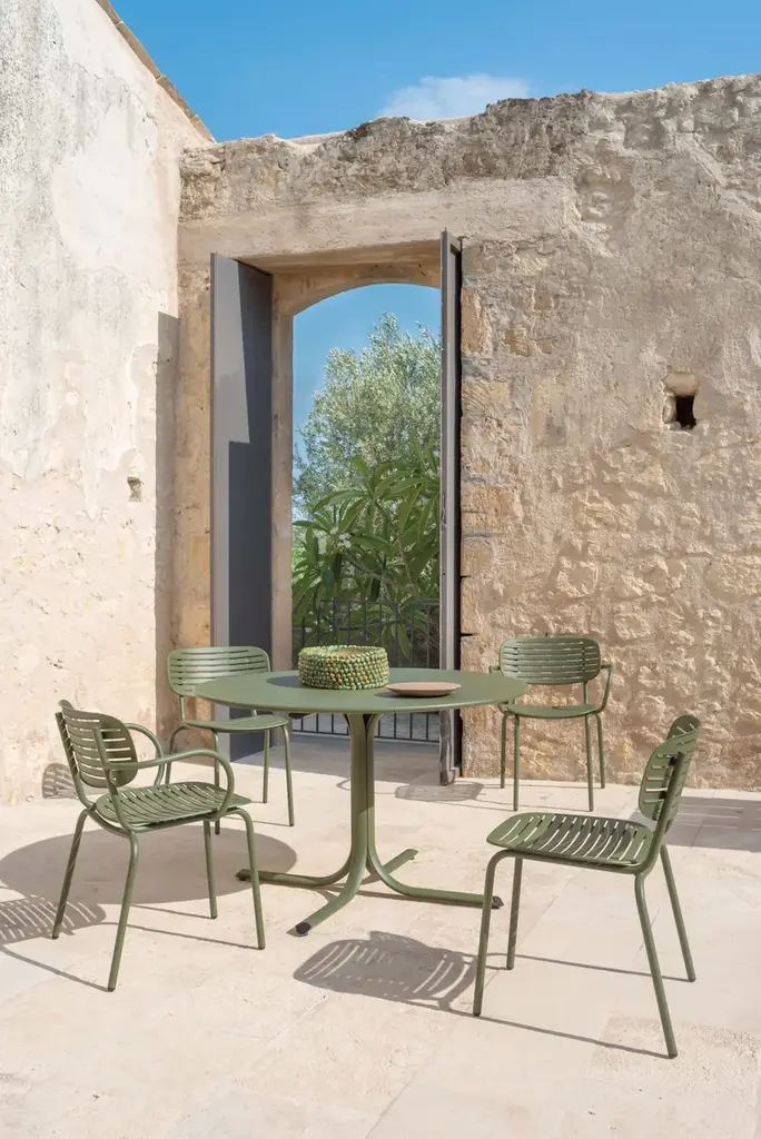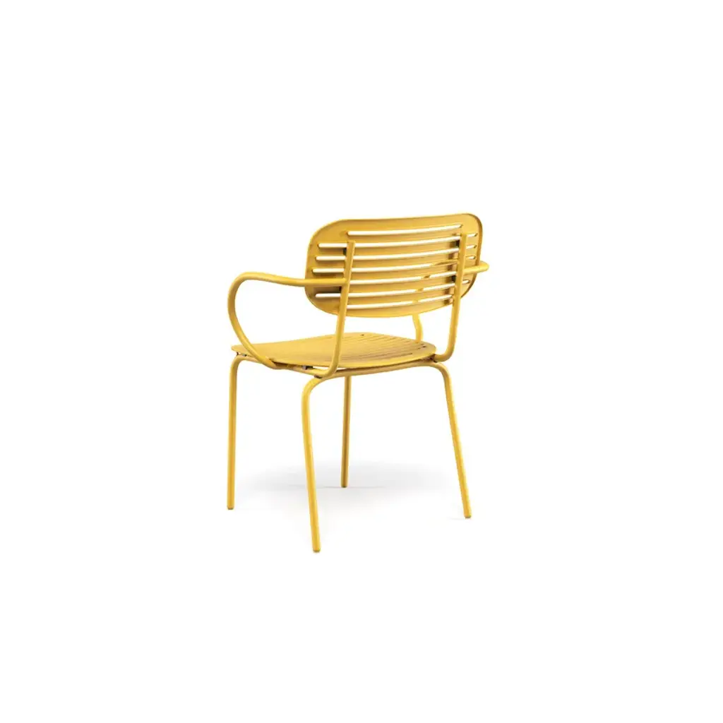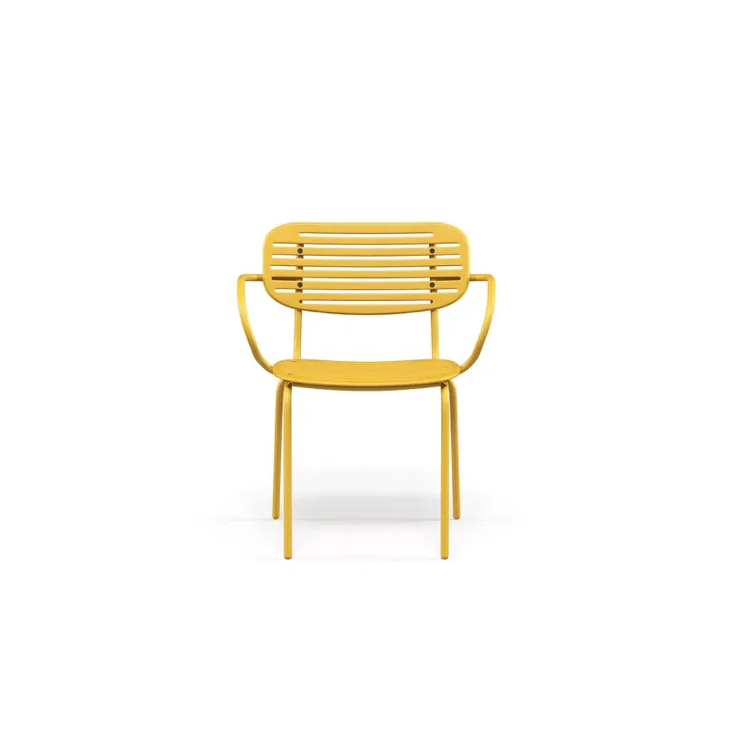 Mom is a garden chair with armrests with painted steel structure. The seat and back are in pre-galvanized painted sheet.Accessories:Cod. C / 639 - Polyester seat cushionCod. C / 640 - Acrylic seat cushionCod. C / 641 - Acrylic back cushionCod. C / 708 - Universal polyester cushionThe Mom collection by Coirier is inspired by traditional Japanese trays. The structure is made entirely from Fe360 tubular steel, while the seat and back, characterized by the striking graphic design, are in deep-drawn galvanized steel sheet. Emu-Coat finish (cataphoresis + painting). Stackable, Mom can be also produced in stainless steel. Available colors: marine blue, military green, antique iron, white, black, maple red, grey-green, Indian brown, dark blue, scarlet red, curry yellow, taupe, cement, dark green, corten, copper.