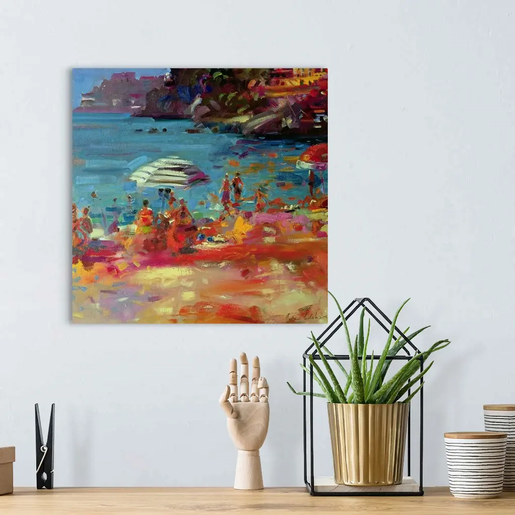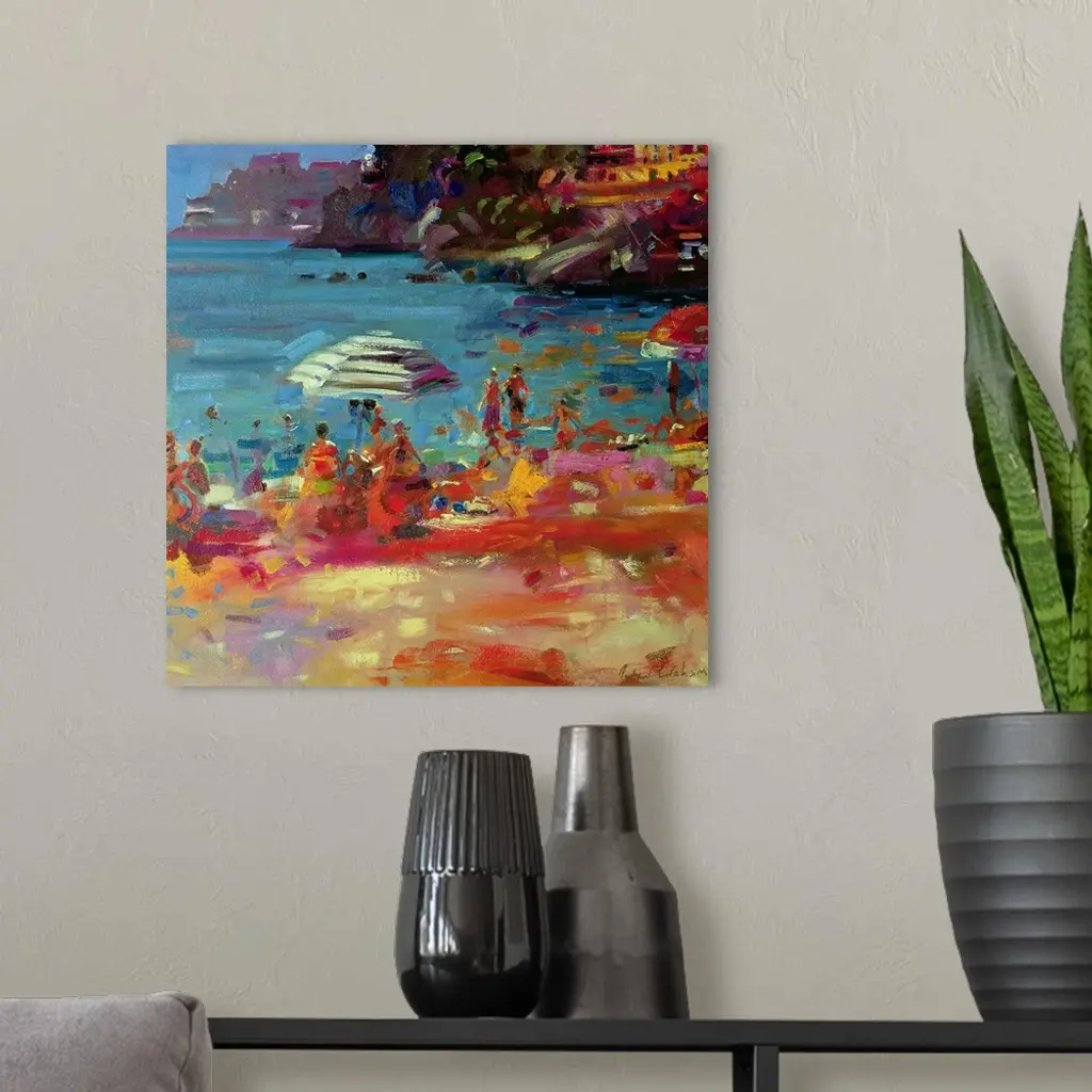 Contemporary artwork of people painted sitting on a beach in front of the water and buildings on cliffs line the right side of the picture.