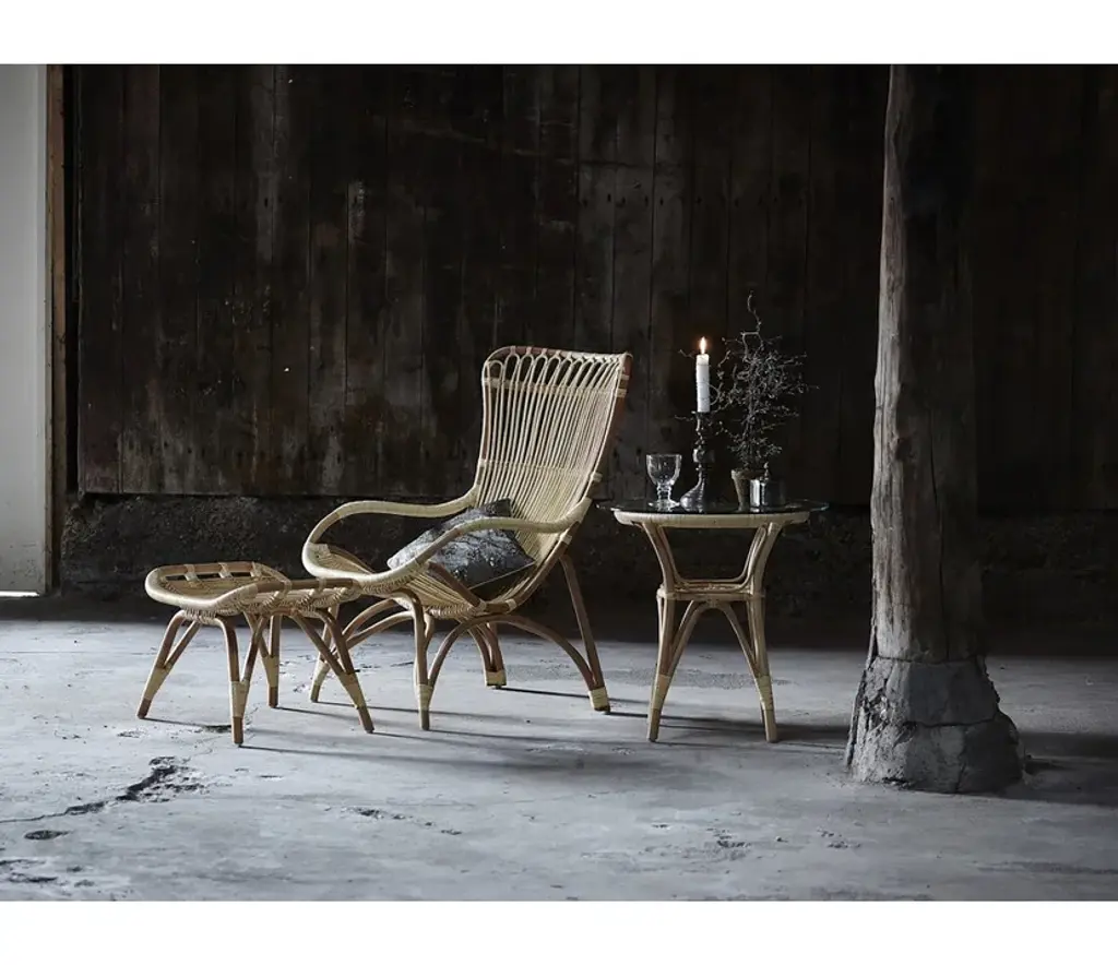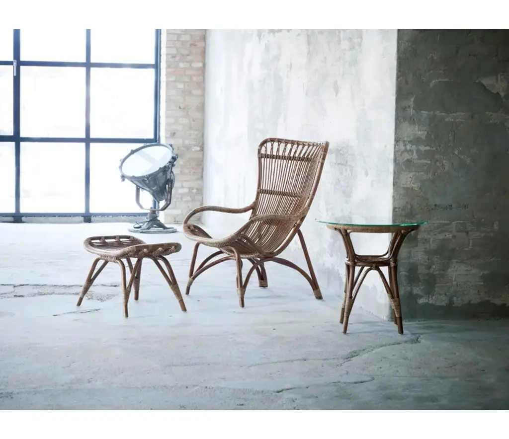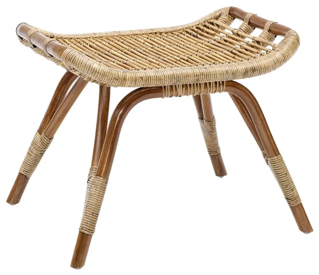 The Monet Foot Stool by Sika Design is the perfect complement to the matching Monet Chair. Expertly crafted from skilled artisans, the natural rattan footstool gets its design notes from original sketches from the 1950s and 60s. Named for the famous French artist, the artful design features an overstated saddle top with a reinforced splayed leg base. The slatted top opens at each end so the stool moves easily for extra seating.Features:The Originals collection honors our legacy with pieces inspired by the earliest sketches and production designs from Sika Design's origins in the 1950s.Non-stackable, contract-grade piece suitable for commercial and residential use.Indoor use only.Rattan is durable, lightweight, and flexible. It is a climbing plant sustainably harvested without disturbing the Indonesian rainforest.Handcrafted with rattan using a century-old method by bending the rattan into shape.Sika Design holds the ISO 14001 certification, which is the international standard for Environmental Responsibility.White plastic glides.