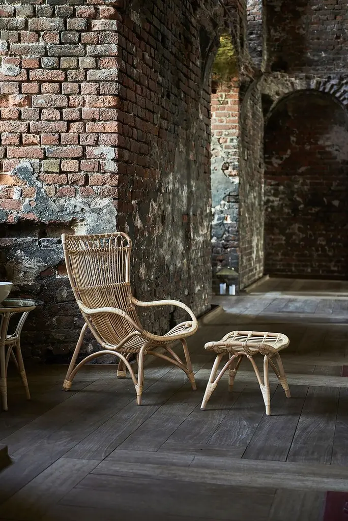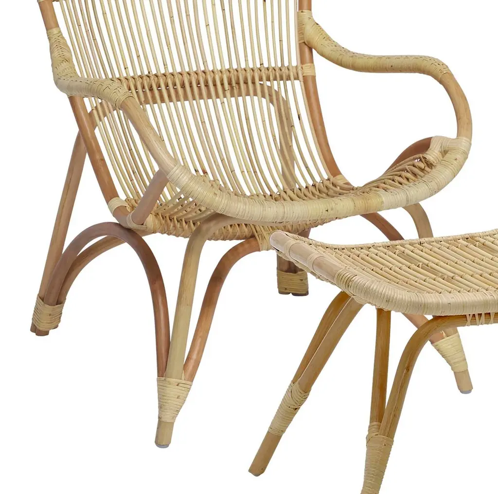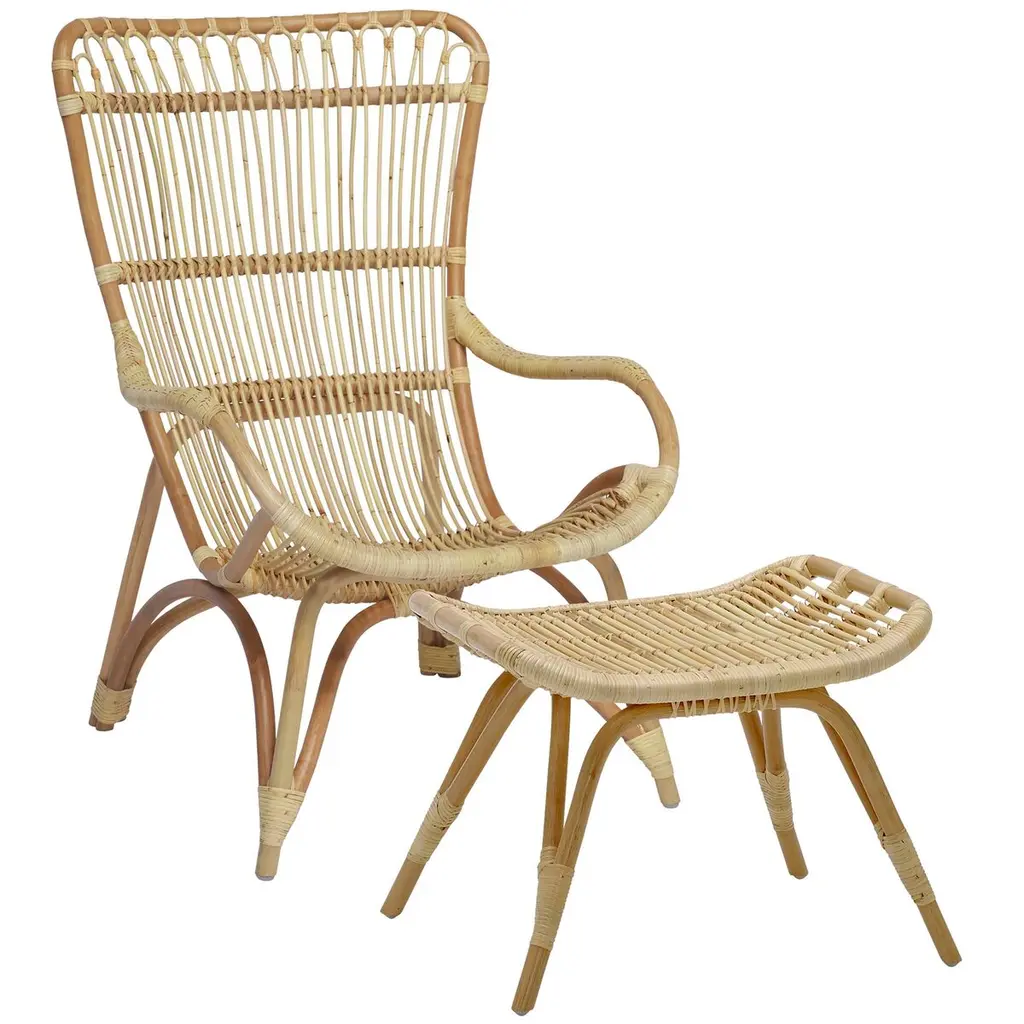 The Monet Chair by Sika Design is a high-backed lounge chair with an eye-pleasing silhouette. Inspired by found drawings and sketches from the 1950s and 1960s, the natural rattan chair is expertly crafted by skilled artisans. Named for the famous French landscape artist, the design features scenic rolling forms with a gently curved back and arms that seamlessly swoop around to form the chair front. Beautifully crafted with extra touches like a herringbone weave on the arms add to the comfort and pleasing aesthetic of this distinctive chair. A matching footstool is included.