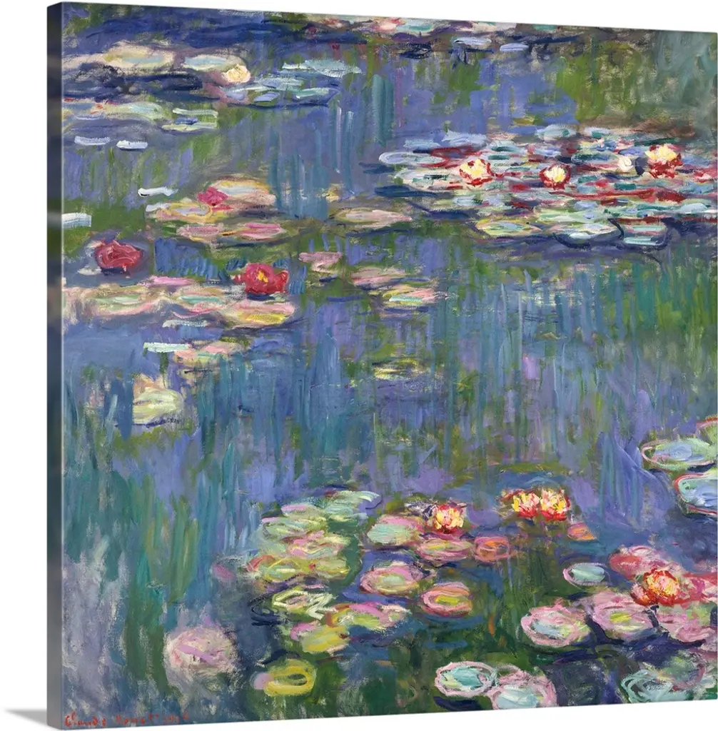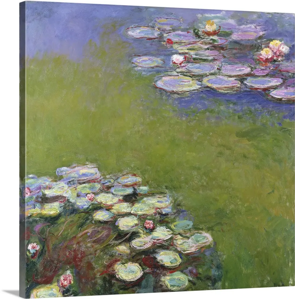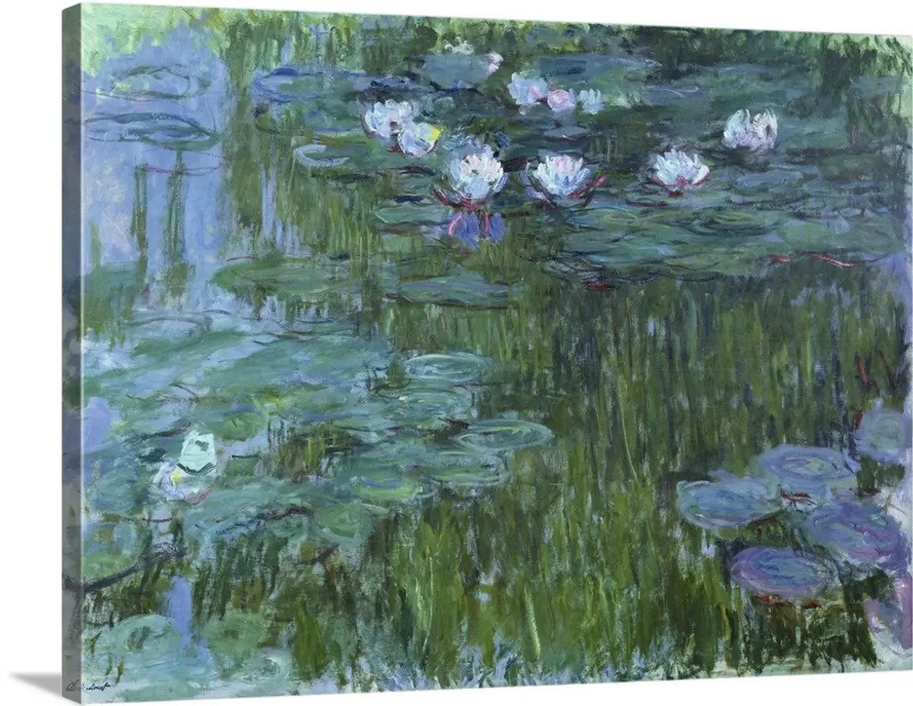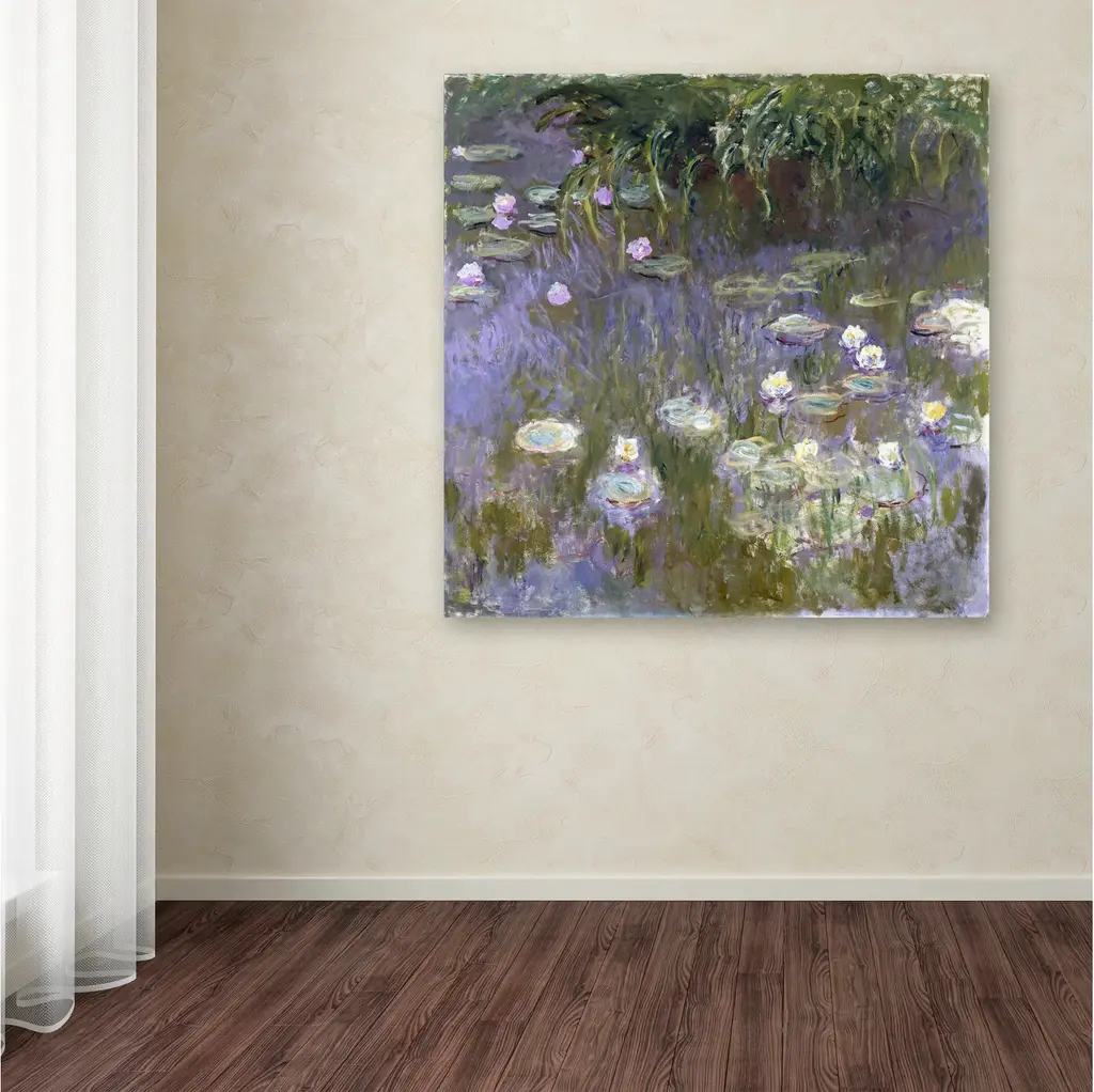 Artist: MonetSubject: LandscapeStyle: Mid-Century ModernProduct Type: Gallery-Wrapped Canvas ArtMade in USAThis ready to hang, gallery-wrapped art piece features water lilies at the bottom of the frame.Claude Monet was a founder of French impressionist painting, and the most consistent and prolific practitioner of the movement's philosophy of expressing one's perceptions before nature, especially as applied to plein-air landscape painting. Monet himself was enchanted by the vitality of outdoor settings as shown in many of his works.Giclee (jee-clay) is an advanced printmaking process for creating high quality fine art reproductions. The attainable excellence that Giclee printmaking affords makes the reproduction virtually indistinguishable from the original piece. The result is wide acceptance of Giclee by galleries, museums, and private collectors. Gallery wrap is a method of stretching an artist's canvas so that the canvas wraps around the sides and is secured a hidden, wooden frame. This method of stretching and preparing a canvas allows for a frameless presentation of the finished painting.