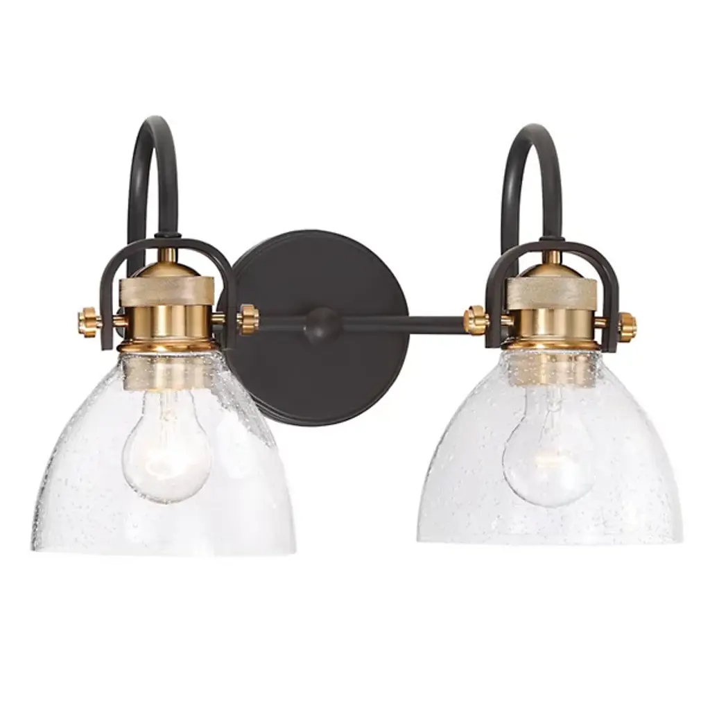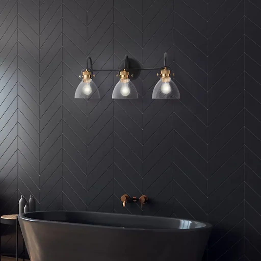 Bring an urban, industrial theme to your favorite space with the Monico Vanity Light from Minka-Lavery. A simple disc wall plate made of smooth steel extends a single, horizontal mounting rod that upholds a set of elegant fixtures. With the inner workings exposed, each piece puts on a full display, presenting the complex lines and angles that make up each one as a smooth, unassuming bulb rests on top. Encased in clear, seeded glass with a grainy texture, the light shines out a warm, clean glow that enchants your space.