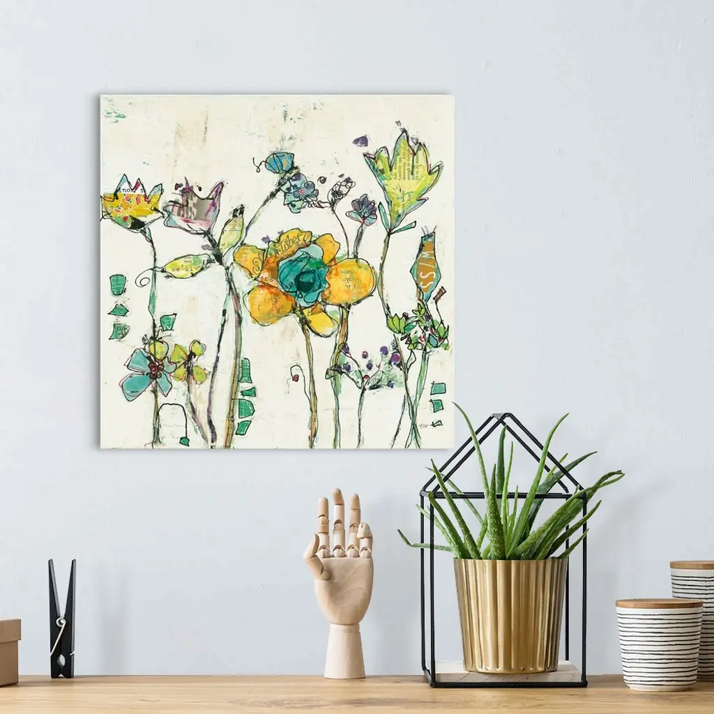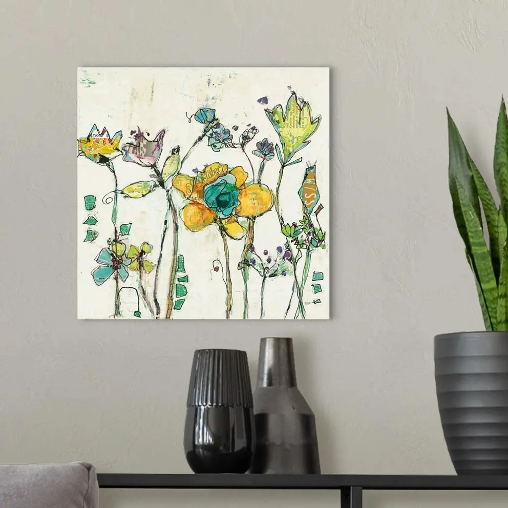 Decorative artwork featuring illustrative flowers that are adorned with cut paper.