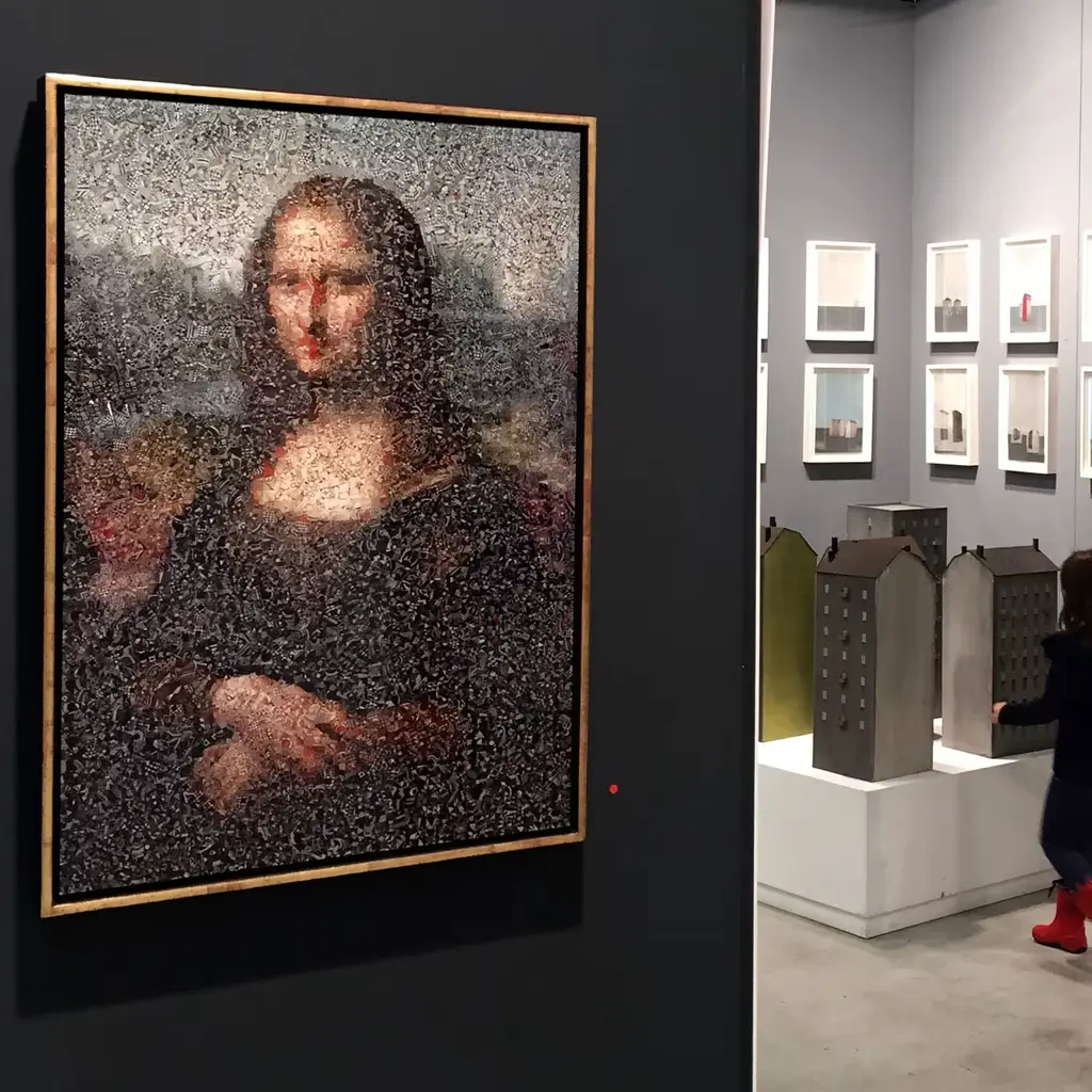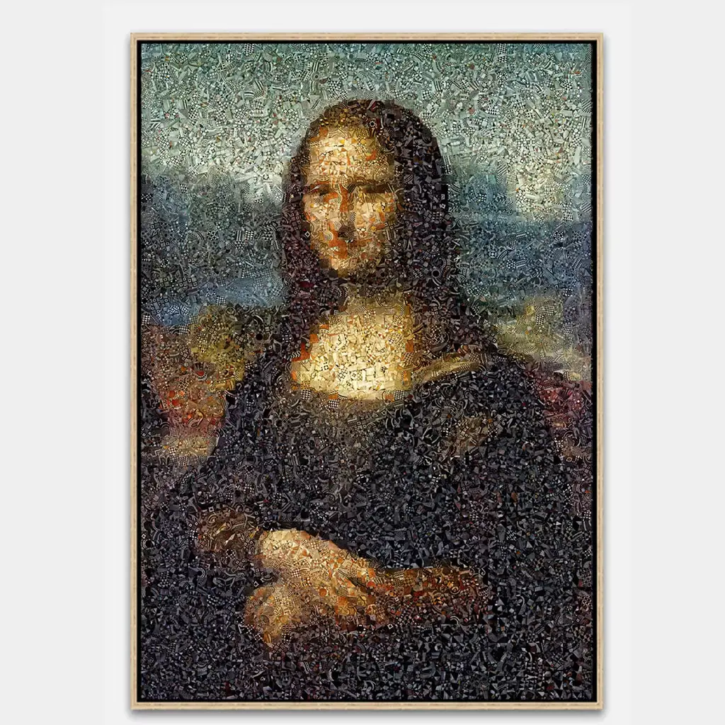 Monnalisa is composed of 3408 photographic tiles of the mosaic floor of St. Mark’s Basilica in Venice that have been used to elaborate this work provided with a double certificate of authenticity and uniqueness countersigned by the artist and blockchain registered. The work can be ordered with a handcrafted wood frame. Revisiting Leonardo da Vinci’s 'Monna Lisa' 77×53 cm, 2018, pigment print on fine art paper, acrylic glass, aluminum, ed. of 20. Please ask the Concierge for further information.
