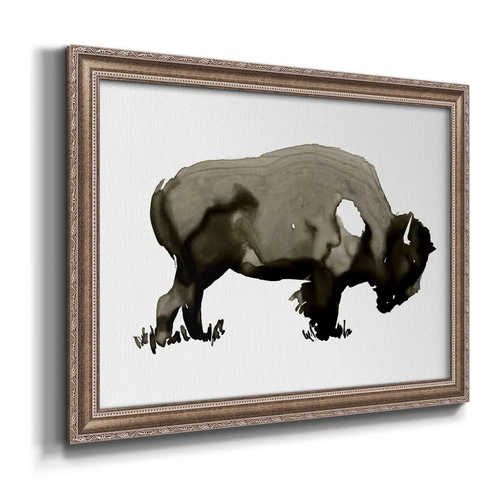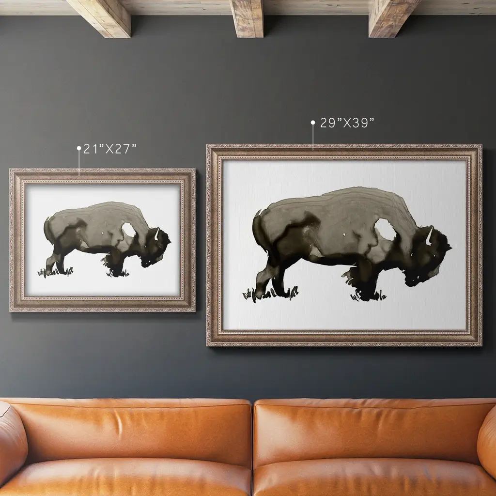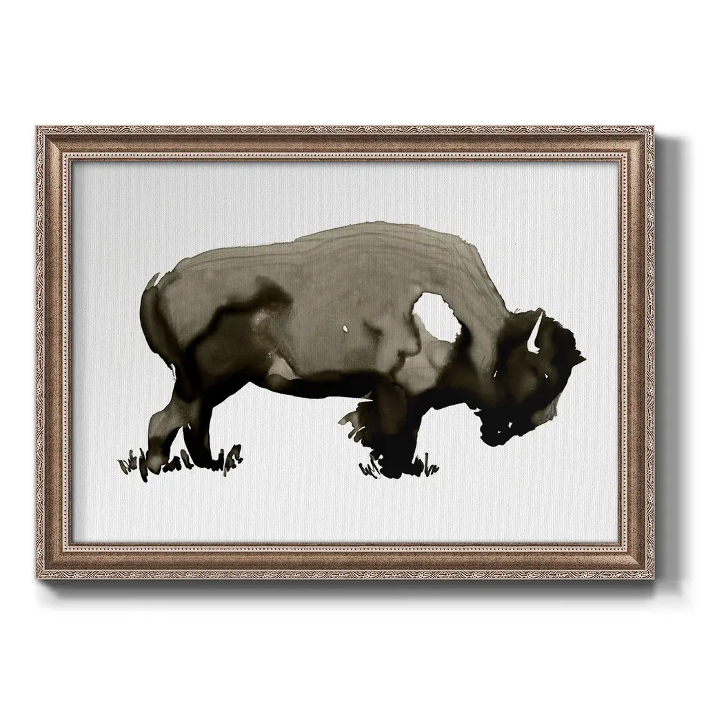 Monochrome Bison I Premium Framed Canvas- Ready to Hang A Premium Framed Canvas created to last. Framed in distressed wood and available in an array of sizes and colors Featuring a beveled a solid wood stretcher bar, each piece comes ready to hand 3 SIZES AVAILABLE 16''X20'' - Overall Size 18'X27'' - Overall Size 24''x36'' - Overall Size Each piece is made to order. Each piece comes with hanging hardware. Made in the USA Ready to Hang Giclee Paper Print Acrylic Glass Beveled Matt Board