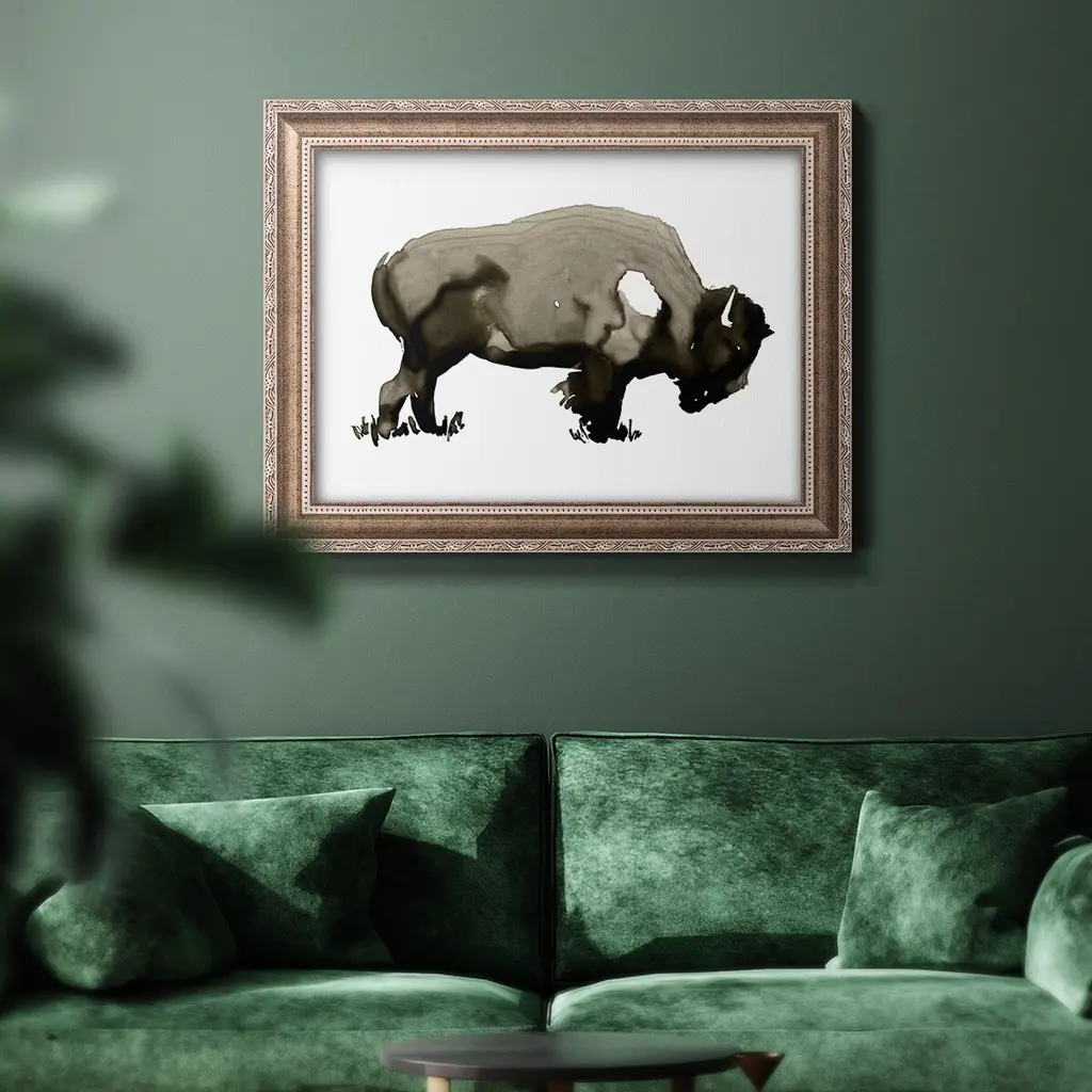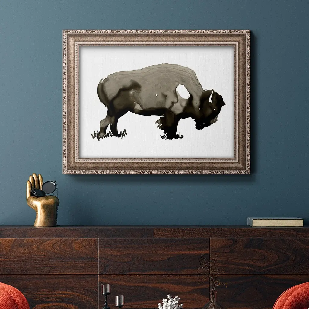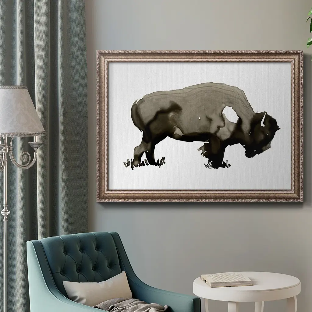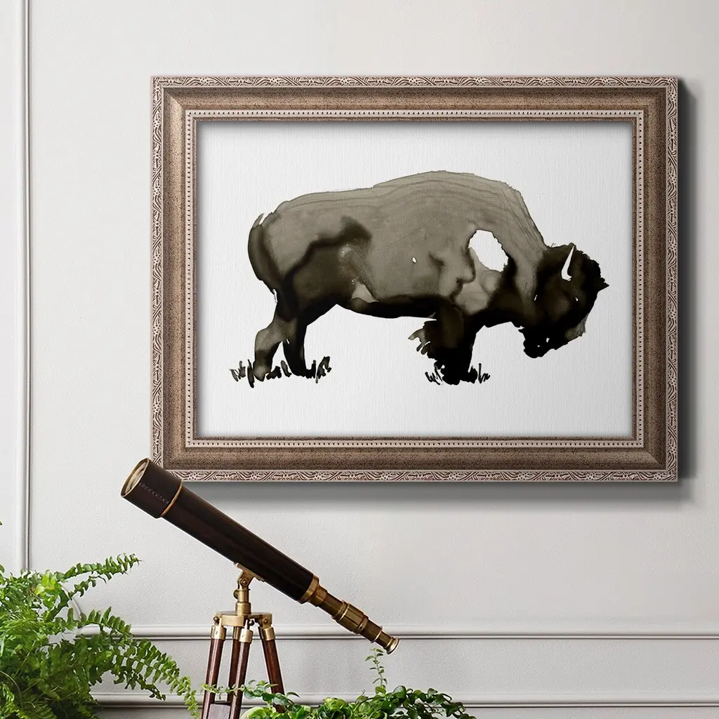 Monochrome Bison I Premium Framed Canvas- Ready to Hang A Premium Framed Canvas created to last. Framed in distressed wood and available in an array of sizes and colors Featuring a beveled a solid wood stretcher bar, each piece comes ready to hand 3 SIZES AVAILABLE 16''X20'' - Overall Size 18'X27'' - Overall Size 24''x36'' - Overall Size Each piece is made to order. Each piece comes with hanging hardware. Made in the USA Ready to Hang Giclee Paper Print Acrylic Glass Beveled Matt Board