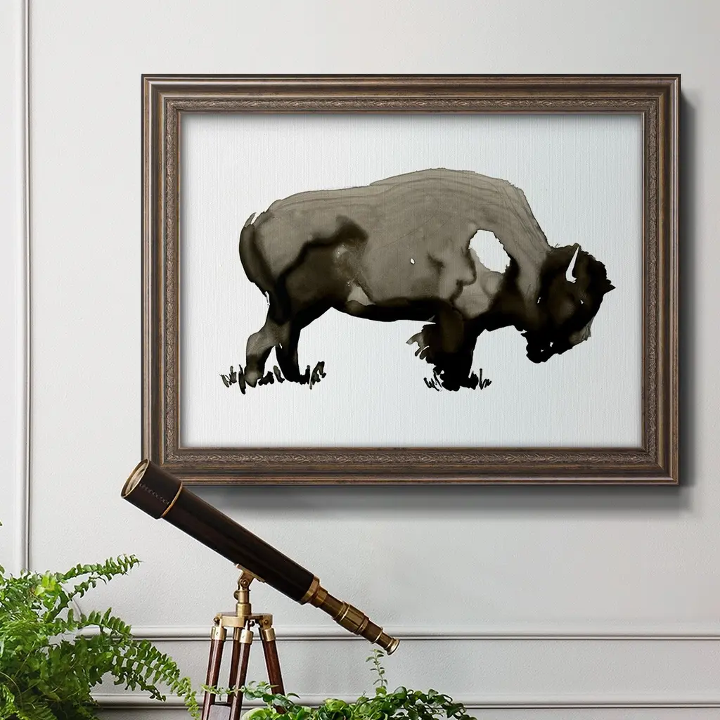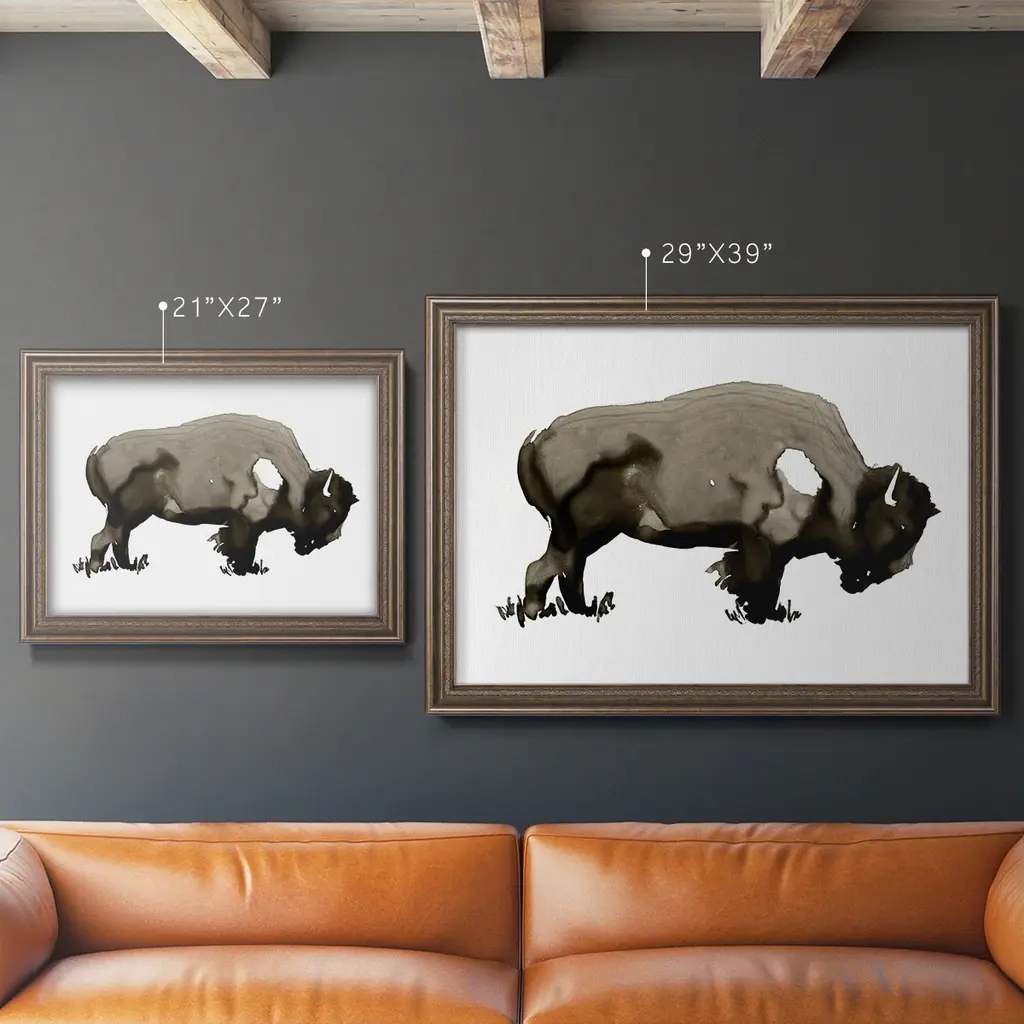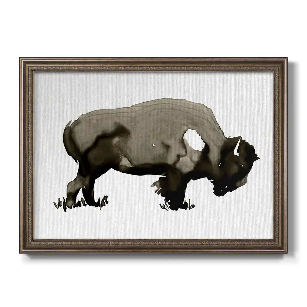 Monochrome Bison I Premium Framed Canvas- Ready to Hang A Premium Framed Canvas created to last. Framed in distressed wood and available in an array of sizes and colors Featuring a beveled a solid wood stretcher bar, each piece comes ready to hand 3 SIZES AVAILABLE 16''X20'' - Overall Size 18'X27'' - Overall Size 24''x36'' - Overall Size Each piece is made to order. Each piece comes with hanging hardware. Made in the USA Ready to Hang Giclee Paper Print Acrylic Glass Beveled Matt Board