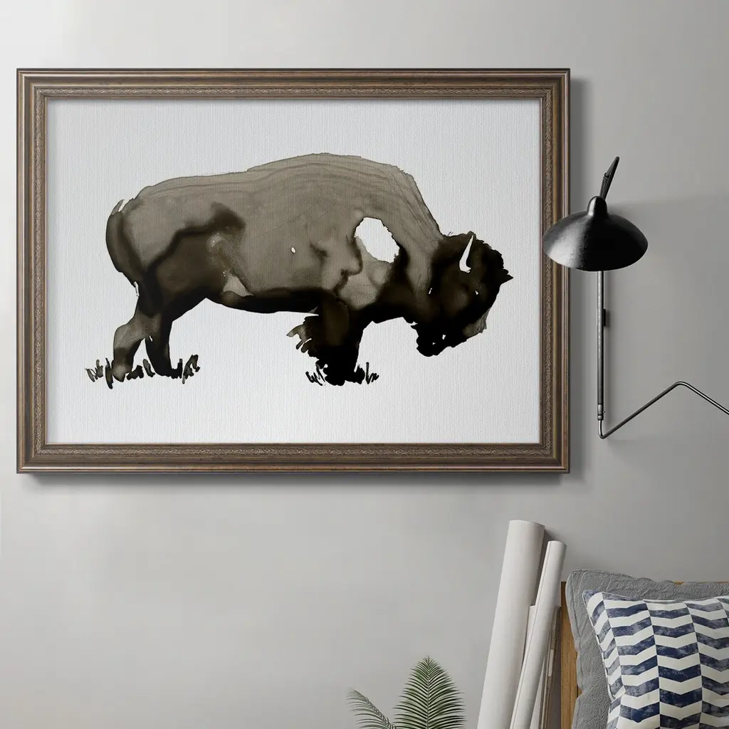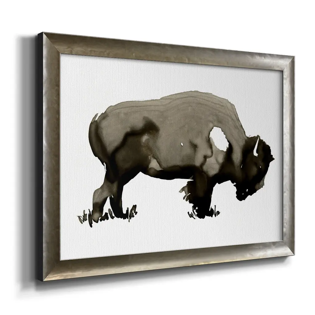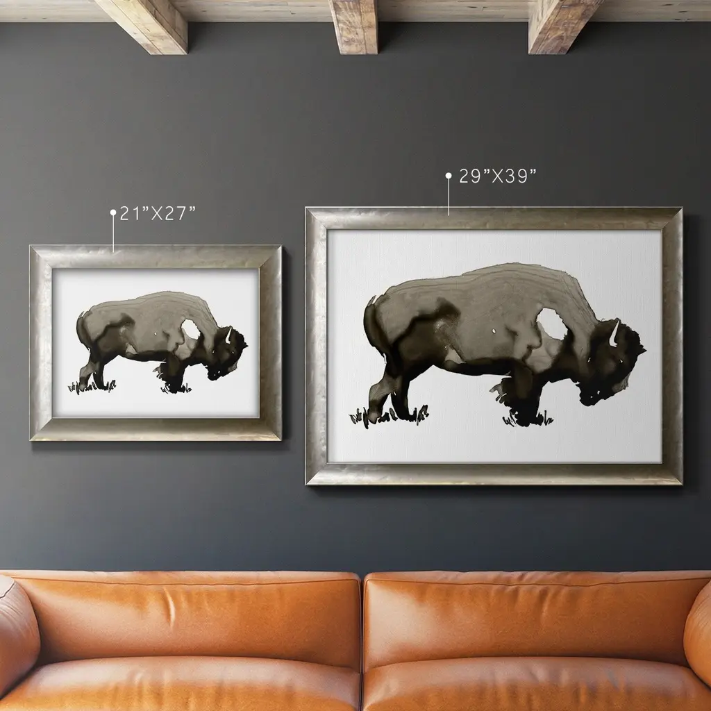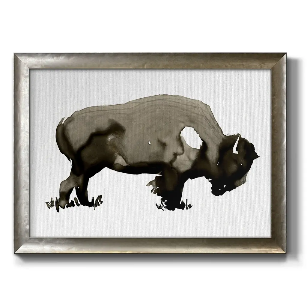 Monochrome Bison I Premium Framed Canvas- Ready to Hang A Premium Framed Canvas created to last. Framed in distressed wood and available in an array of sizes and colors Featuring a beveled a solid wood stretcher bar, each piece comes ready to hand 3 SIZES AVAILABLE 16''X20'' - Overall Size 18'X27'' - Overall Size 24''x36'' - Overall Size Each piece is made to order. Each piece comes with hanging hardware. Made in the USA Ready to Hang Giclee Paper Print Acrylic Glass Beveled Matt Board