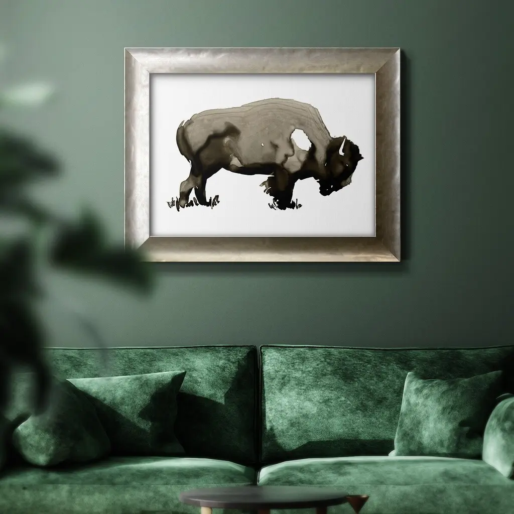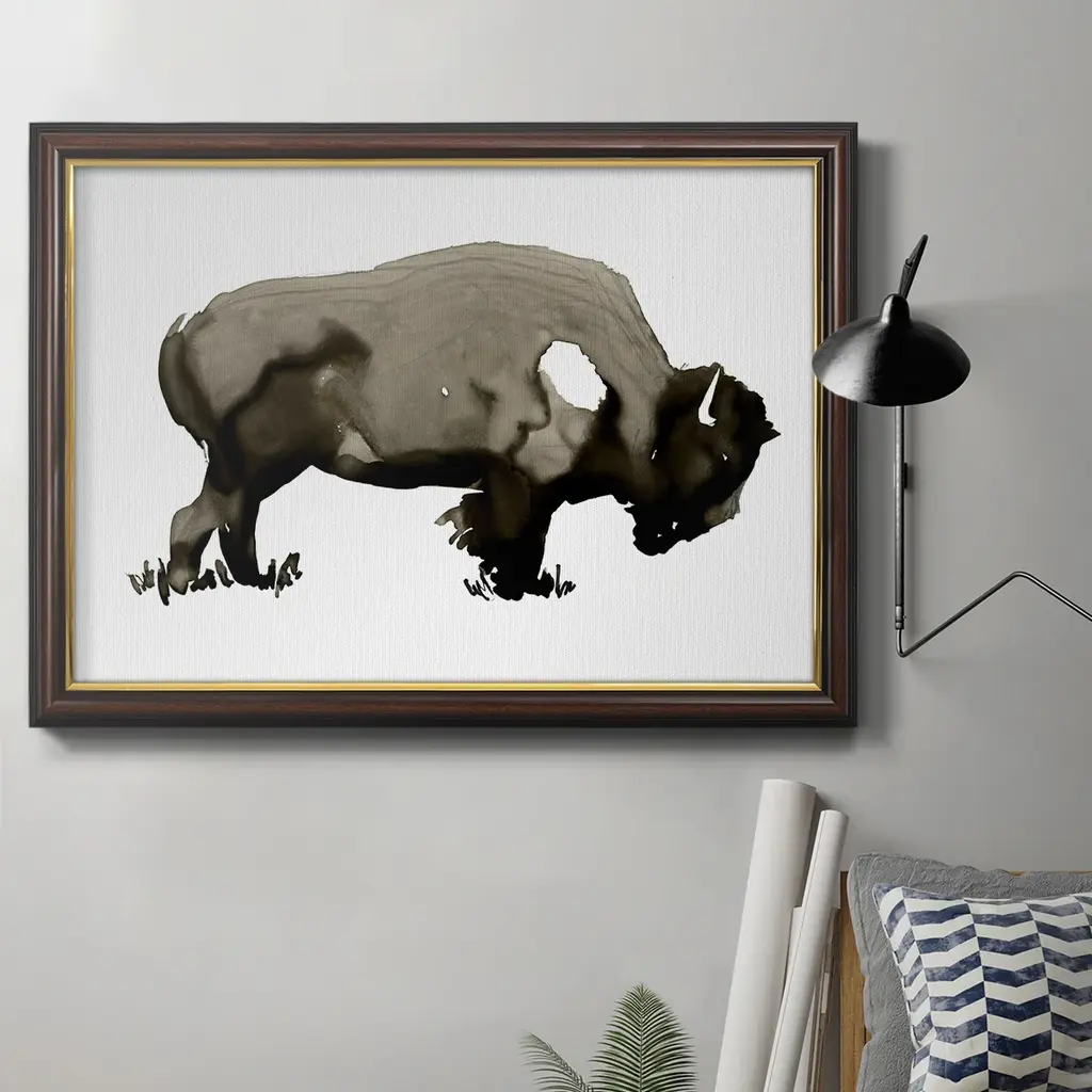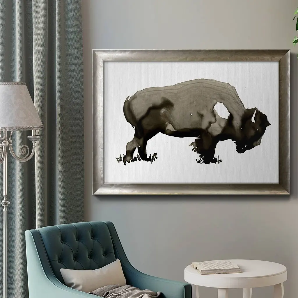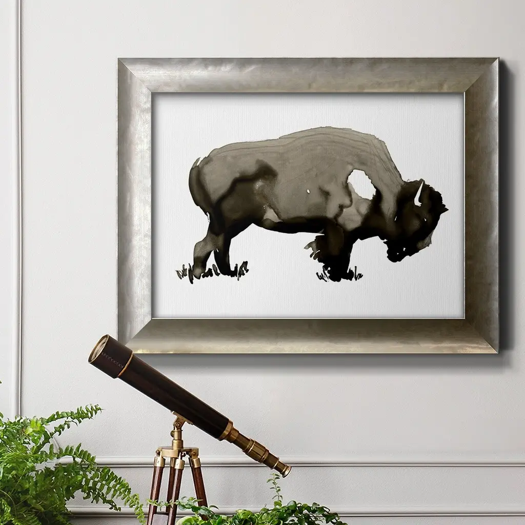 Monochrome Bison I Premium Framed Canvas- Ready to Hang A Premium Framed Canvas created to last. Framed in distressed wood and available in an array of sizes and colors Featuring a beveled a solid wood stretcher bar, each piece comes ready to hand 3 SIZES AVAILABLE 16''X20'' - Overall Size 18'X27'' - Overall Size 24''x36'' - Overall Size Each piece is made to order. Each piece comes with hanging hardware. Made in the USA Ready to Hang Giclee Paper Print Acrylic Glass Beveled Matt Board