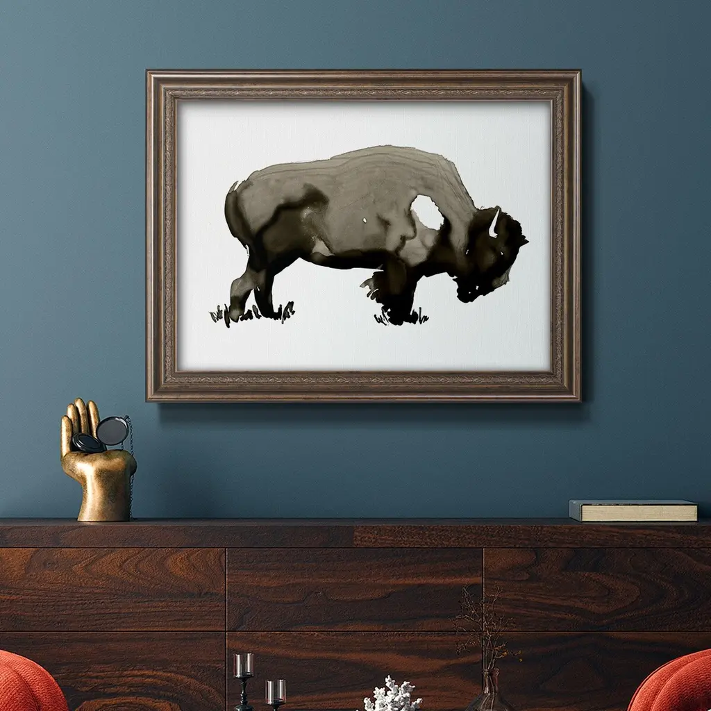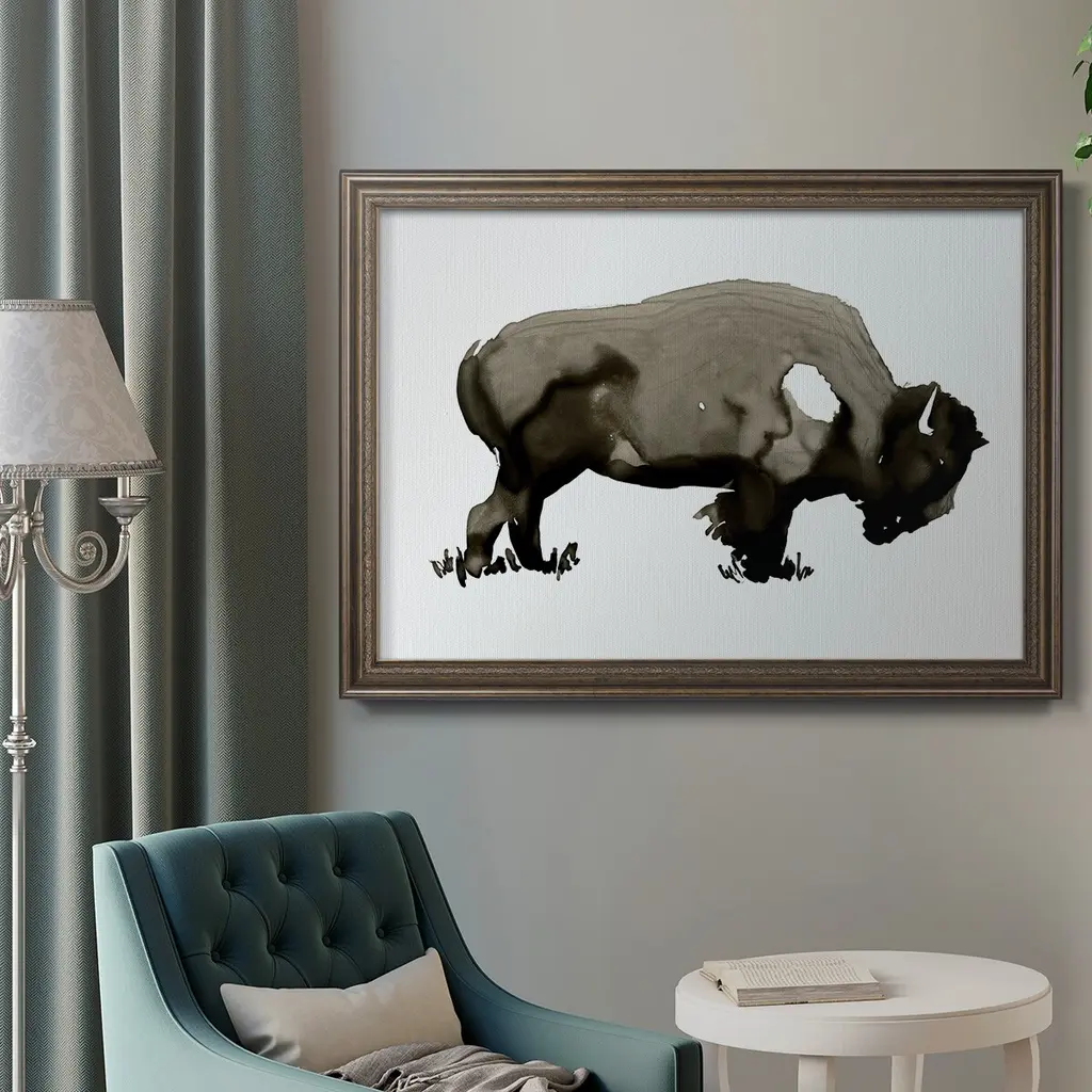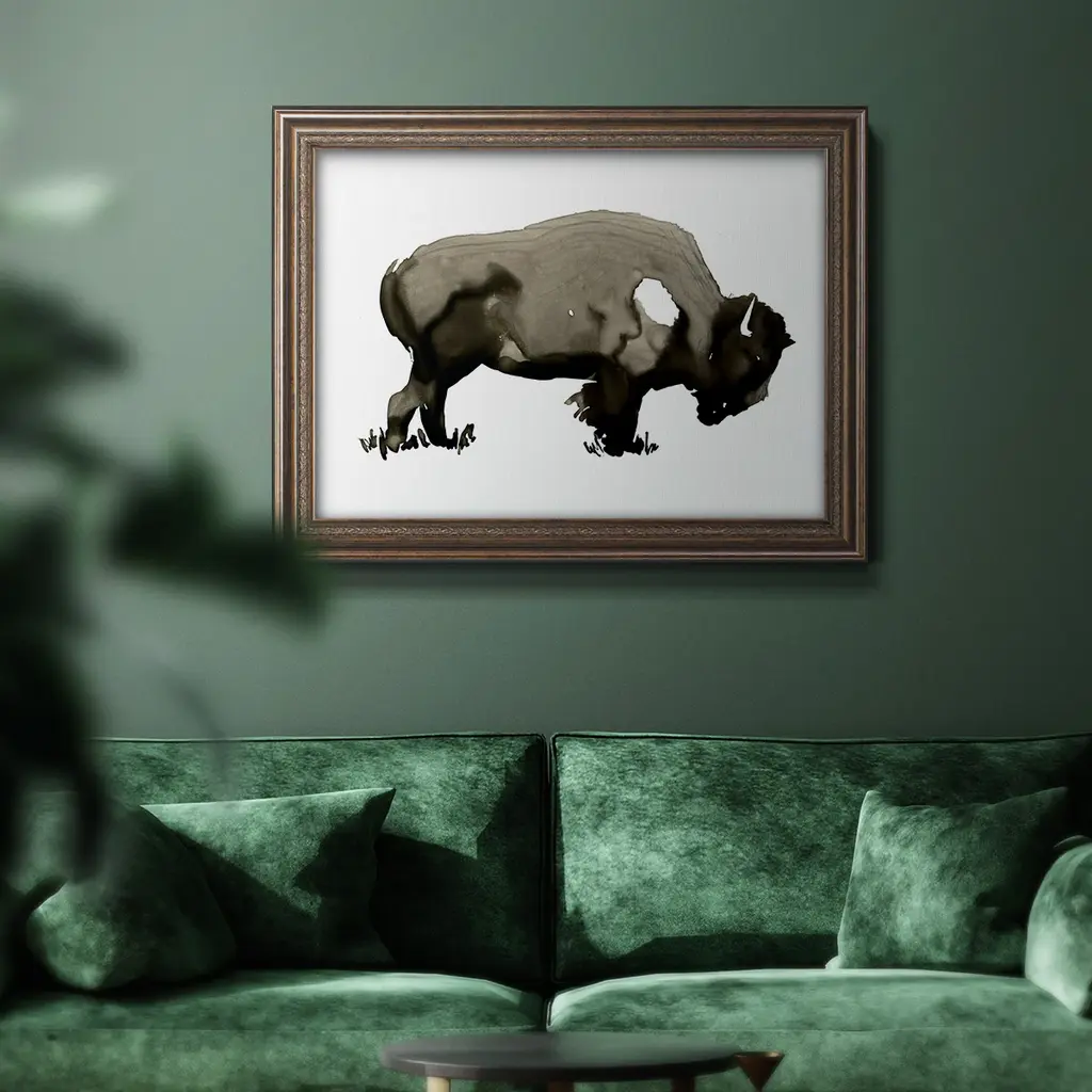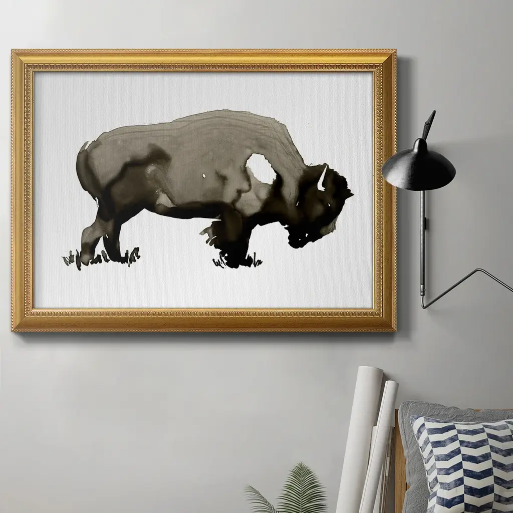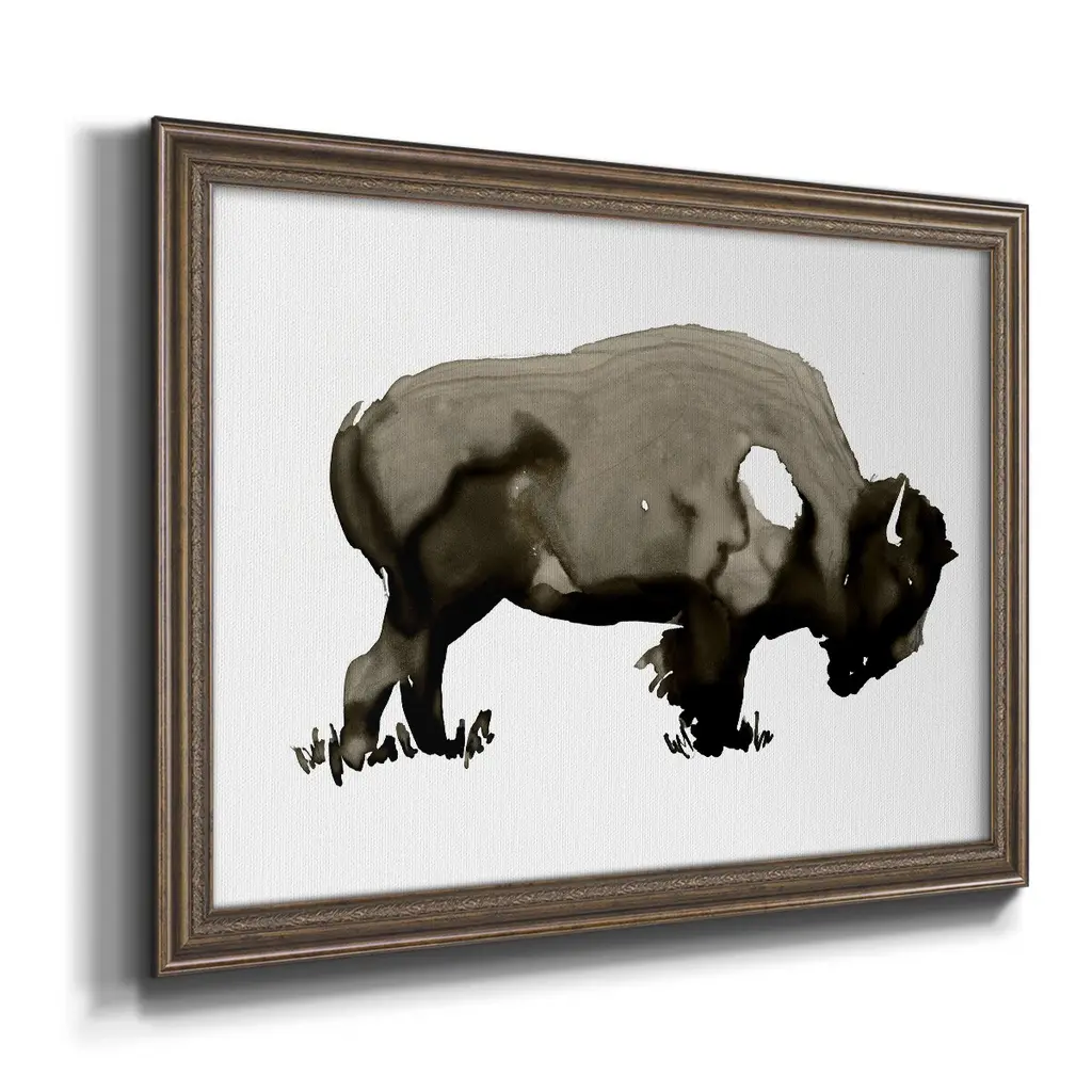 Monochrome Bison I Premium Framed Canvas- Ready to Hang A Premium Framed Canvas created to last. Framed in distressed wood and available in an array of sizes and colors Featuring a beveled a solid wood stretcher bar, each piece comes ready to hand 3 SIZES AVAILABLE 16''X20'' - Overall Size 18'X27'' - Overall Size 24''x36'' - Overall Size Each piece is made to order. Each piece comes with hanging hardware. Made in the USA Ready to Hang Giclee Paper Print Acrylic Glass Beveled Matt Board