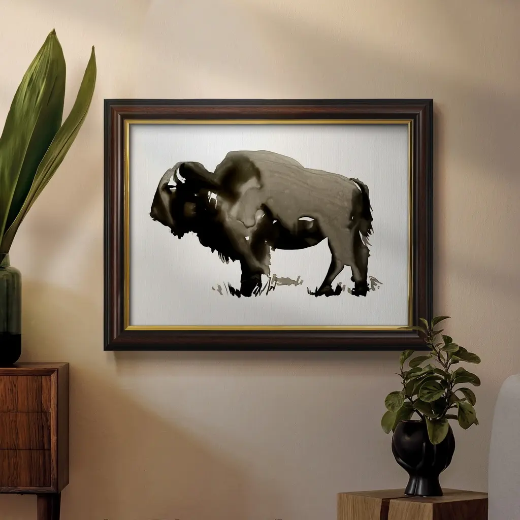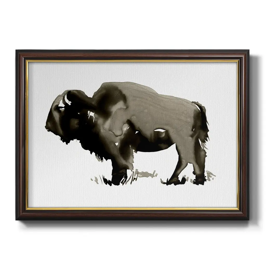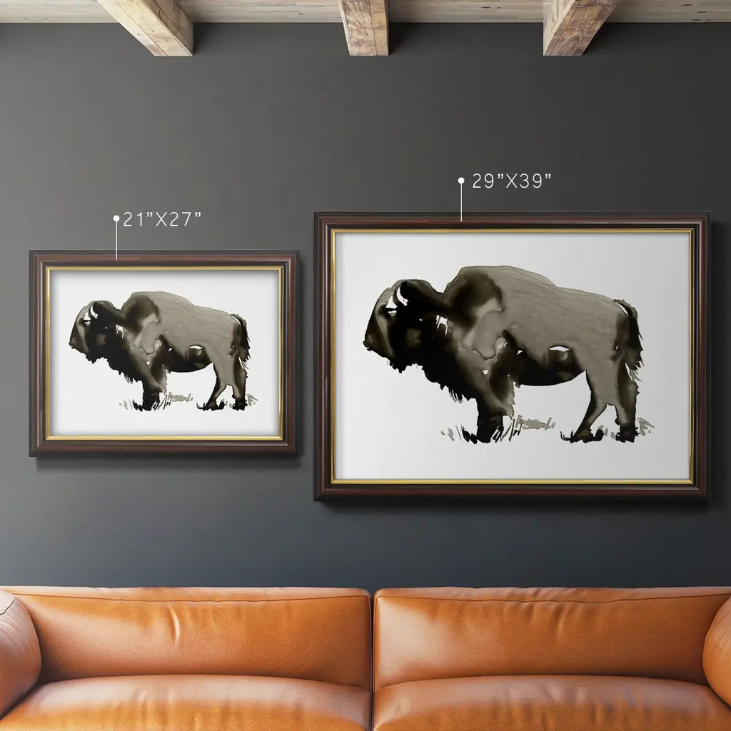 Monochrome Bison II Premium Framed Canvas- Ready to Hang A Premium Framed Canvas created to last. Framed in distressed wood and available in an array of sizes and colors Featuring a beveled a solid wood stretcher bar, each piece comes ready to hand 3 SIZES AVAILABLE 16''X20'' - Overall Size 18'X27'' - Overall Size 24''x36'' - Overall Size Each piece is made to order. Each piece comes with hanging hardware. Made in the USA Ready to Hang Giclee Paper Print Acrylic Glass Beveled Matt Board