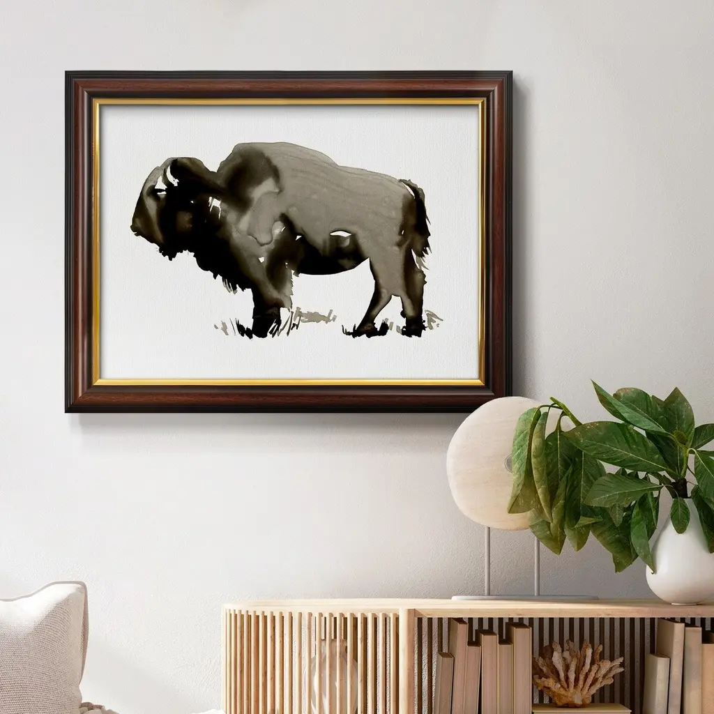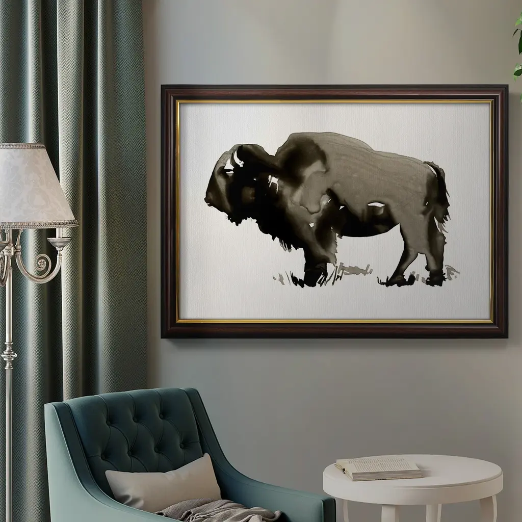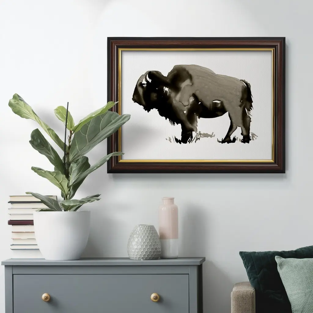Monochrome Bison II Premium Framed Canvas- Ready to Hang A Premium Framed Canvas created to last. Framed in distressed wood and available in an array of sizes and colors Featuring a beveled a solid wood stretcher bar, each piece comes ready to hand 3 SIZES AVAILABLE 16''X20'' - Overall Size 18'X27'' - Overall Size 24''x36'' - Overall Size Each piece is made to order. Each piece comes with hanging hardware. Made in the USA Ready to Hang Giclee Paper Print Acrylic Glass Beveled Matt Board