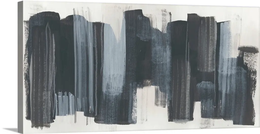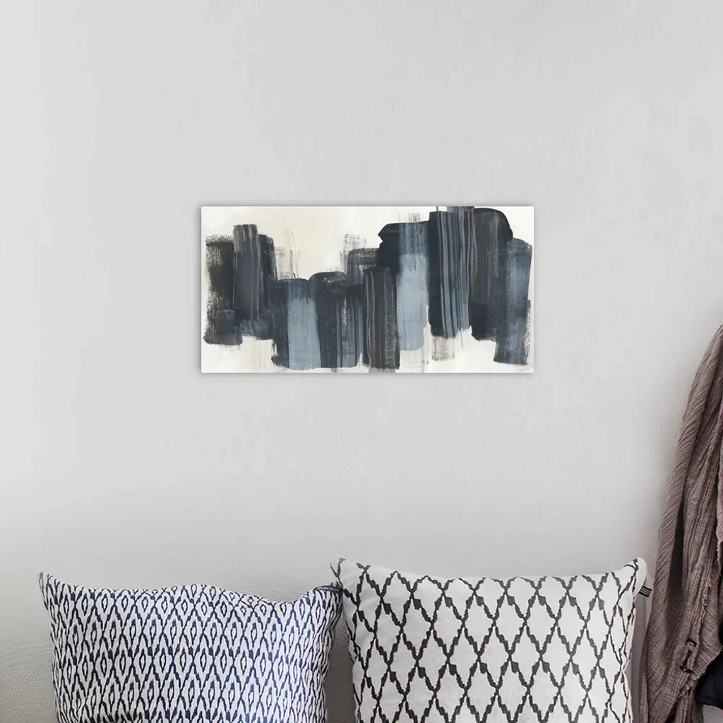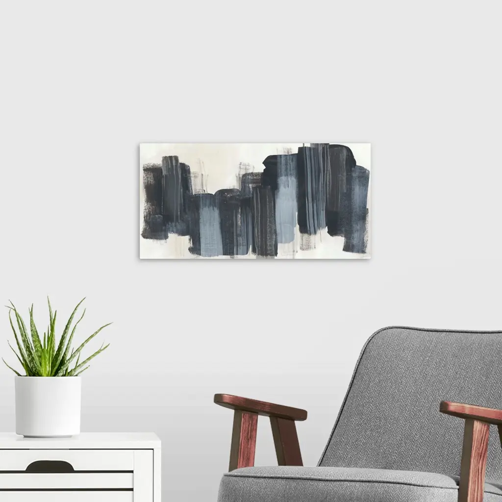 Horizontal abstract artwork in dark grey blocks on beige.