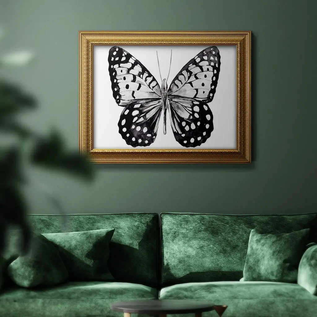 Monochrome Wings Whole I Premium Framed Canvas- Ready to Hang A Premium Framed Canvas created to last. Framed in distressed wood and available in an array of sizes and colors Featuring a beveled a solid wood stretcher bar, each piece comes ready to hand 3 SIZES AVAILABLE 16''X20'' - Overall Size 18'X27'' - Overall Size 24''x36'' - Overall Size Each piece is made to order. Each piece comes with hanging hardware. Made in the USA Ready to Hang Giclee Paper Print Acrylic Glass Beveled Matt Board