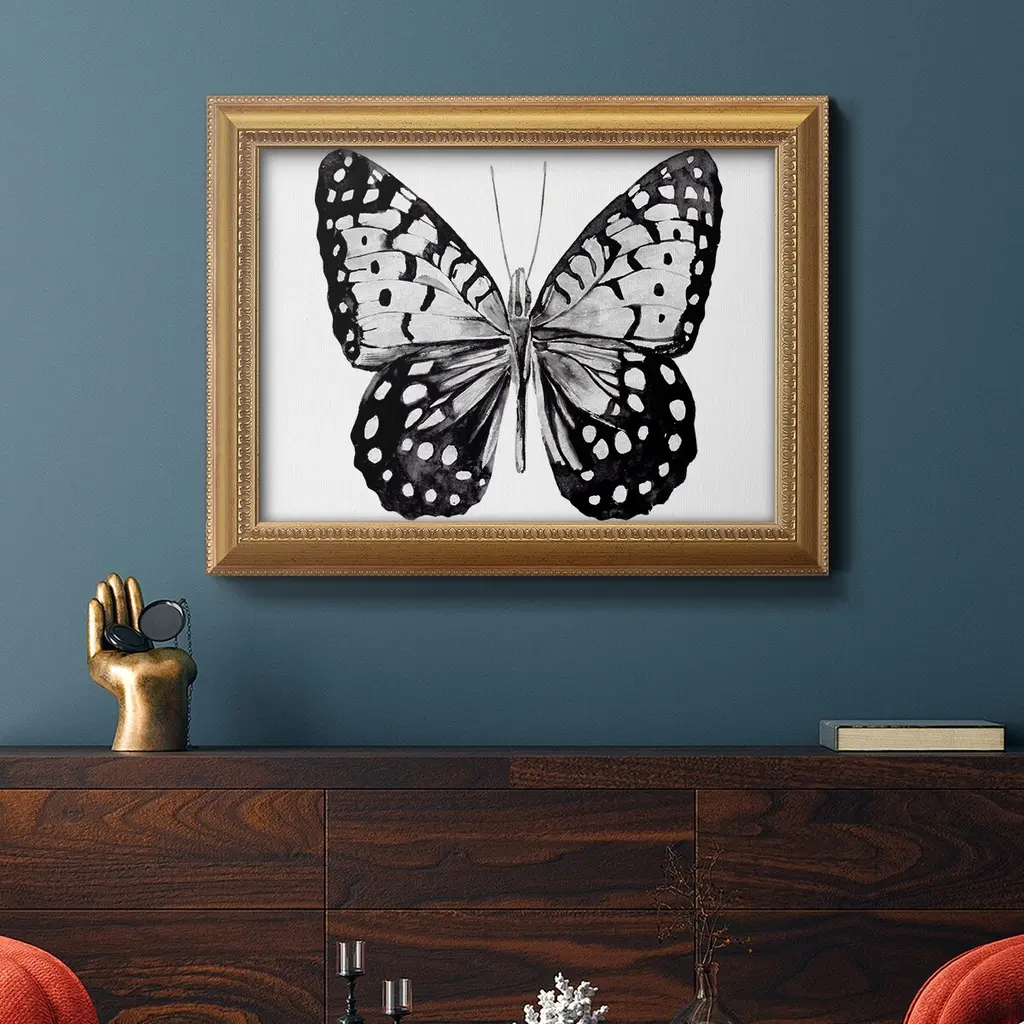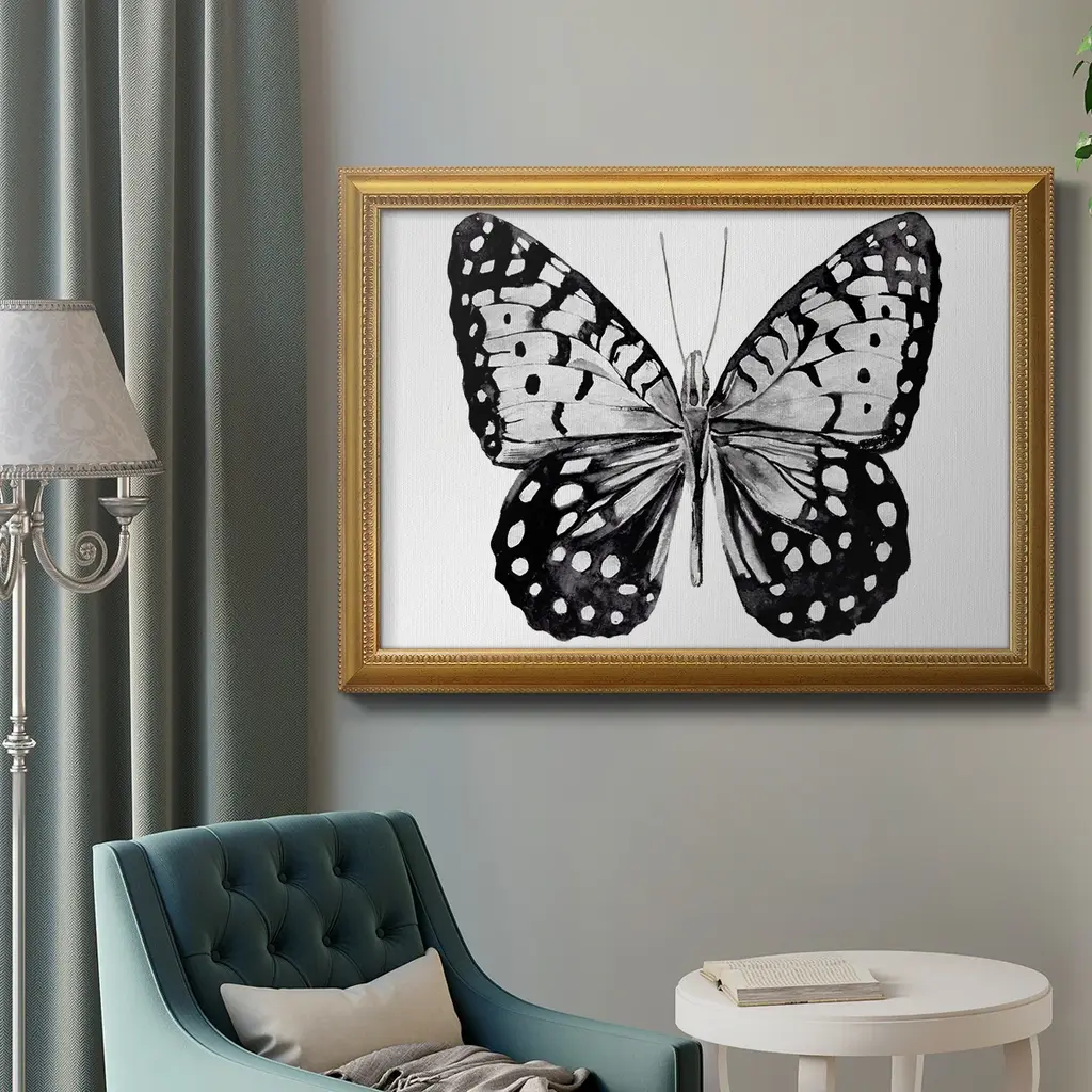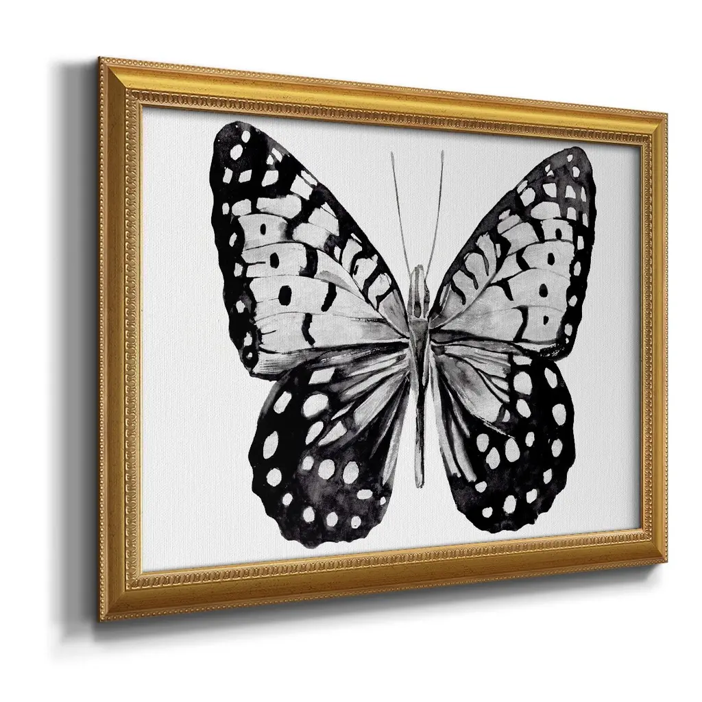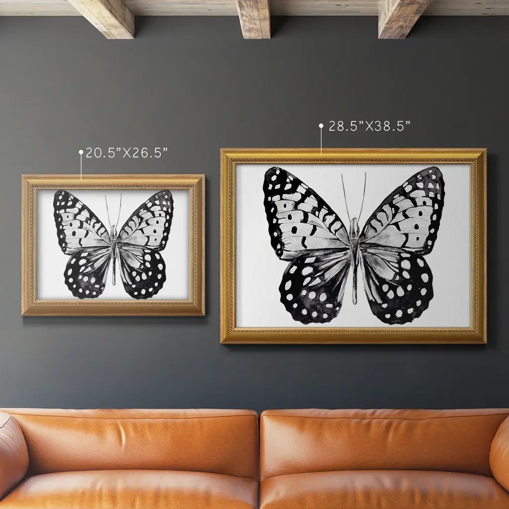 Monochrome Wings Whole I Premium Framed Canvas- Ready to Hang A Premium Framed Canvas created to last. Framed in distressed wood and available in an array of sizes and colors Featuring a beveled a solid wood stretcher bar, each piece comes ready to hand 3 SIZES AVAILABLE 16''X20'' - Overall Size 18'X27'' - Overall Size 24''x36'' - Overall Size Each piece is made to order. Each piece comes with hanging hardware. Made in the USA Ready to Hang Giclee Paper Print Acrylic Glass Beveled Matt Board