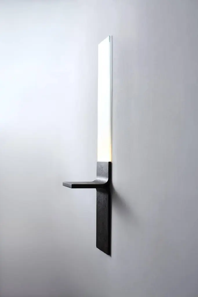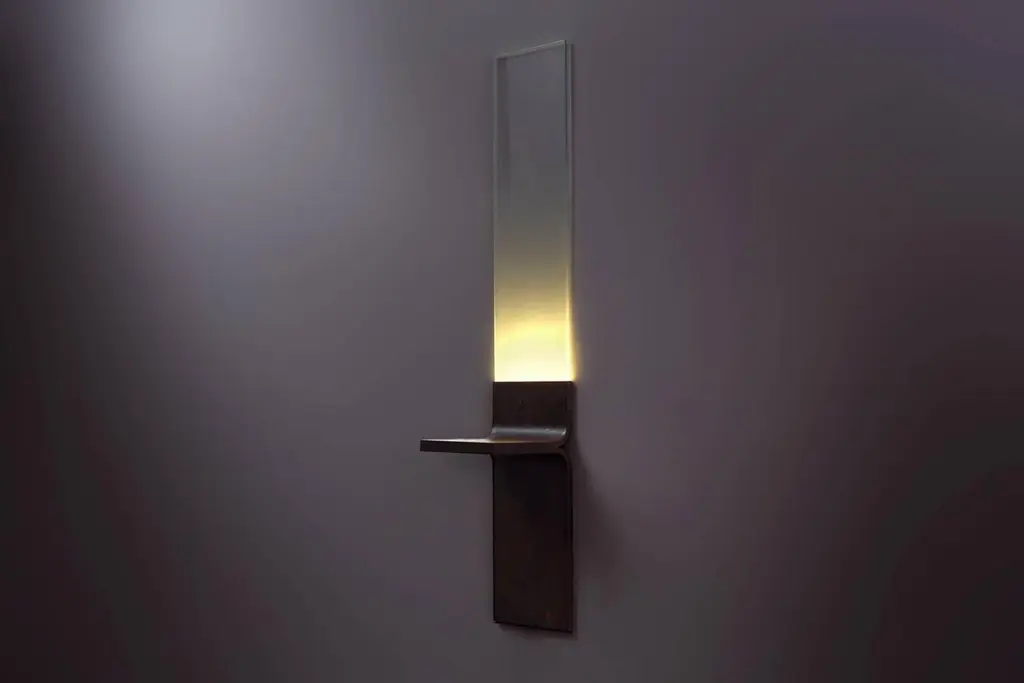 The monolith, brass LED light plant grower, Luvere StudioMaterials: Cold ? ?rolled ? ?steel, ? ?starfire ? ?glass, ? ?LED ? ?lightingDimensions: 37” ? ?x ? ?7” ? ?x ? ?7”The monolith is a wall-mounted, full-spectrum LED light fixture designed to display and grow collector plant specimens. Crafted from cold rolled steel, which is aged and protected with a clear coat. It shoots a vertical light into a pane of sanded tempered glass that goes from a translucent gradient to a perfectly transparent pinnacle. The result is a soothing window-like effect of translucent light that creates abundant lumens to force a blossom to form or help a delicate orchid thrive. Bended steel provides a perch for the plants to be featured. Light spills onto the ceiling, softly illuminating the room.Luvere studio is a design team that combines a love of nature and fine objects to make unique, beautifully crafted art pieces and lighted stages for growing plants in difficult environments.