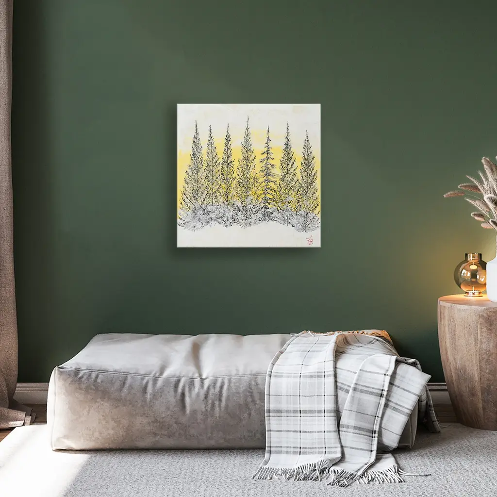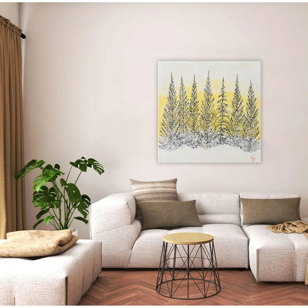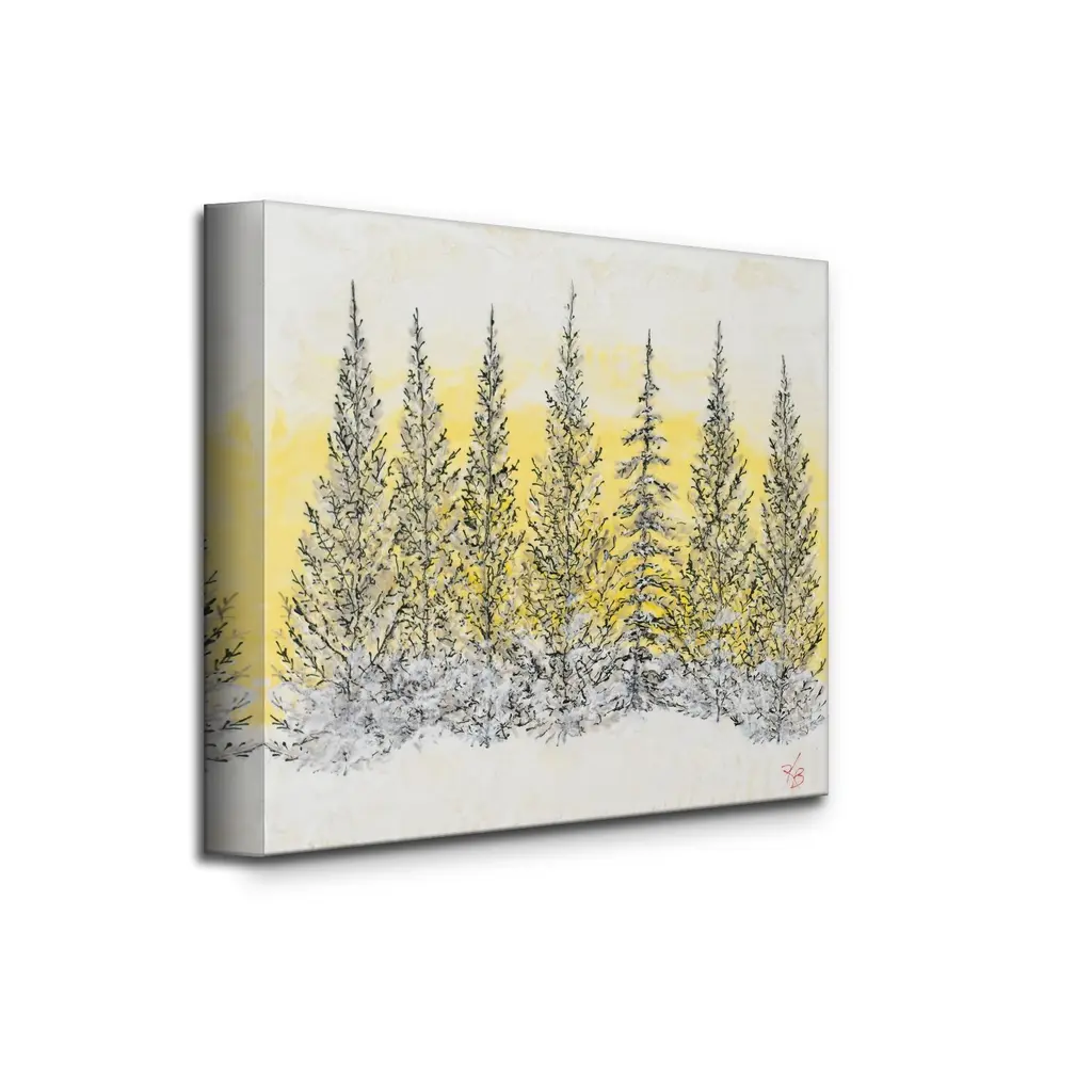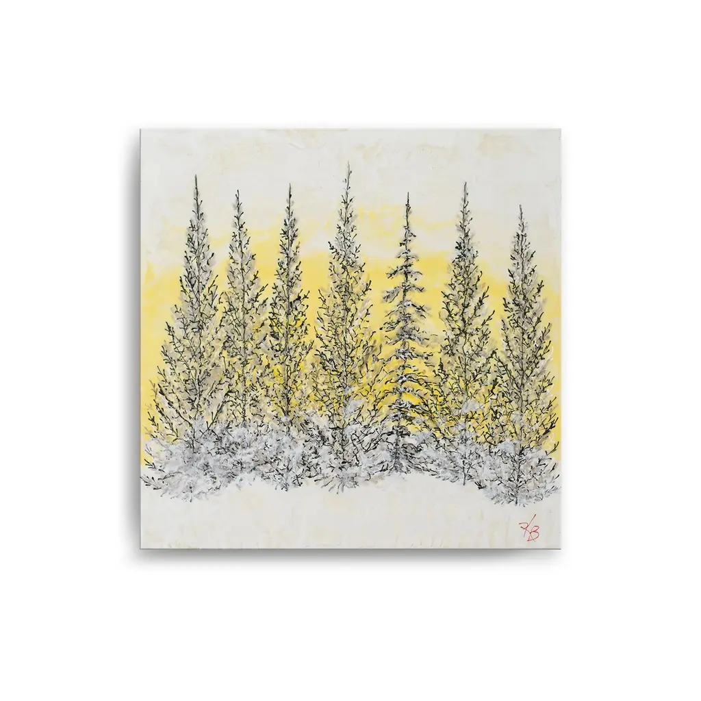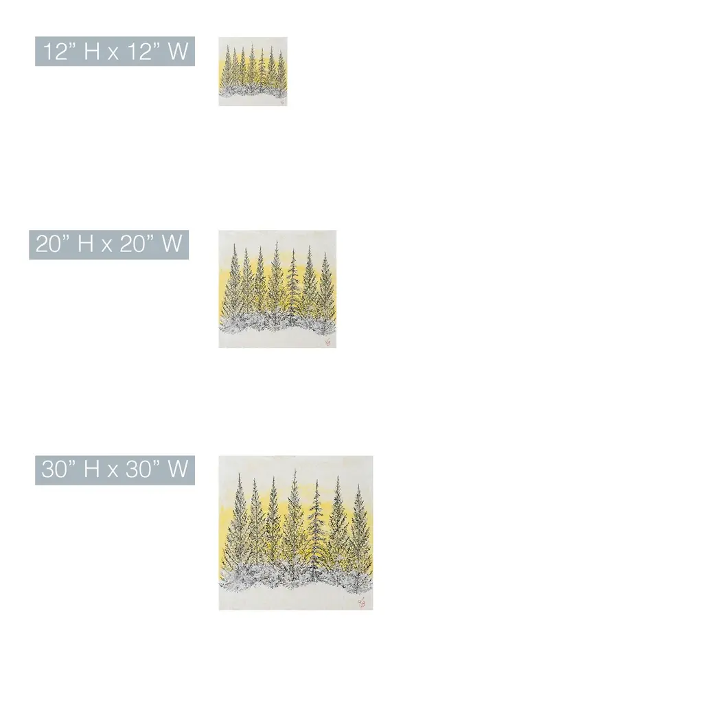 Add a touch of neutral sophistication to your home décor with this landscape wrapped canvas wall art titled 'Monoscape XLIV' by Karen Biery. The square artwork features monochromatic black trees with a glowing yellow background that will complement your contemporary décor's aesthetic. Designed and handcrafted in Chattanooga, Tennessee by Ready2HangArt using a locally sourced artist print on canvas, and assembled on an eco-friendly pine wood frame finished with a rear hanger for simple installation. Presenting a glimpse of nature's real beauty, this wrapped canvas wall art features the unique encaustic process found in the Karen Biery collection. Product Features: Carefully printed on UV/water resistant poly-cotton matte canvas Skillfully hand wrapped on a kiln dried pine wood frame Hanging hardware included for easy installation Made in the USA