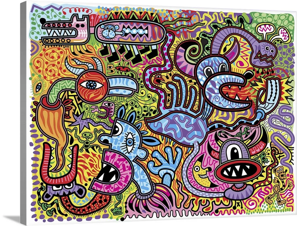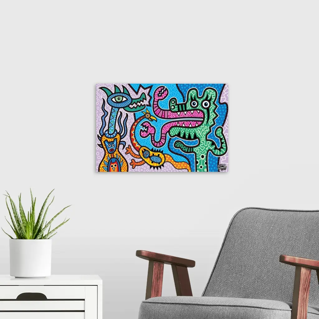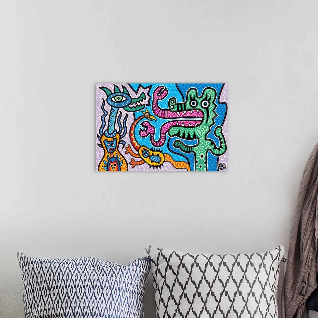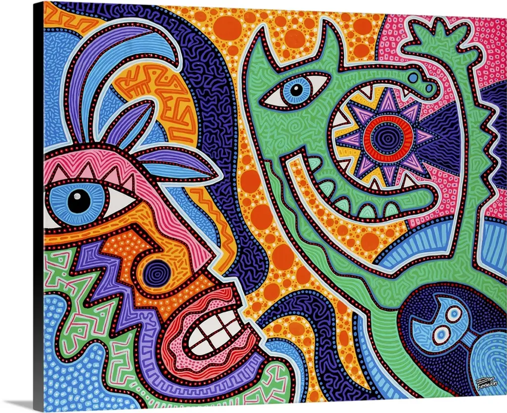 Contemporary aboriginal inspired artwork with bright colors and intricate detail.