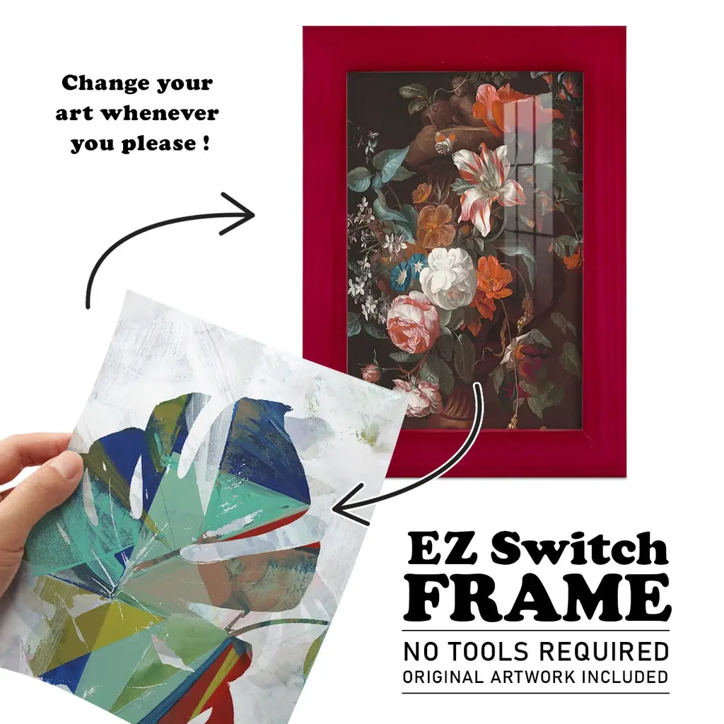 Monstera VIII -EZ SWITCH Framed Print w/glass-Cherry Red A delightful, framed print. Featuring a solid wood frame with real wood glass. This premium print is giclee quality. In addition, every frame features a removable back and table top stand. This allows you to change your art in the future or to just stand the art on a table for a new look. We are sure you'll enjoy our new series of EZ SWITCH Framed Art. Solid Wood Frame Real Glass Removable / Replaceable Art Built in Tabletop Stand Sizes range from 4x6 up to 12x15 - buy just one or pair them up as sets as you see fit.