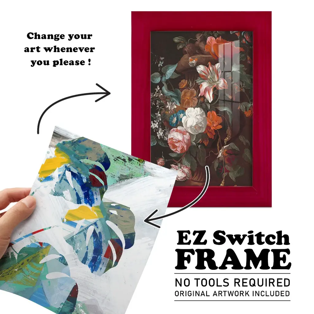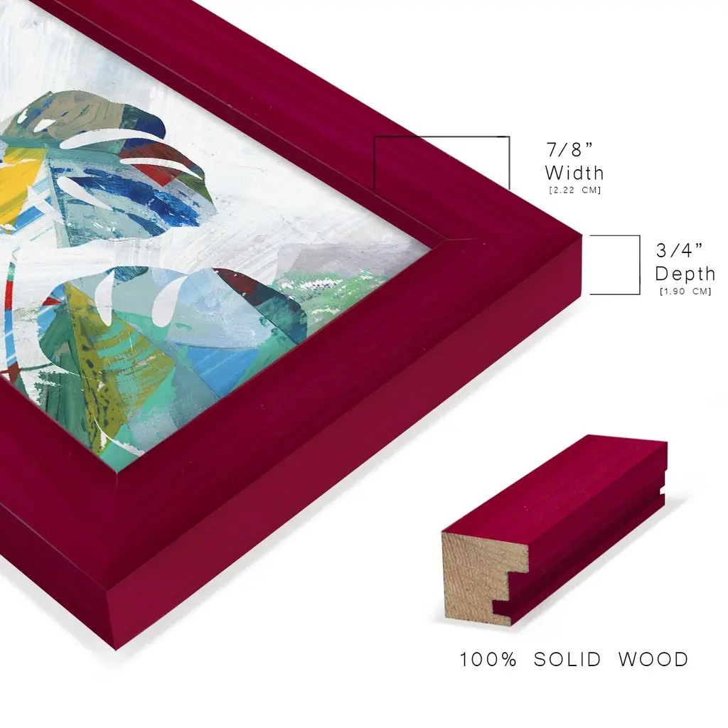 Monstera X -EZ SWITCH Framed Print w/glass-Cherry Red A delightful, framed print. Featuring a solid wood frame with real wood glass. This premium print is giclee quality. In addition, every frame features a removable back and table top stand. This allows you to change your art in the future or to just stand the art on a table for a new look. We are sure you'll enjoy our new series of EZ SWITCH Framed Art. Solid Wood Frame Real Glass Removable / Replaceable Art Built in Tabletop Stand Sizes range from 4x6 up to 12x15 - buy just one or pair them up as sets as you see fit.
