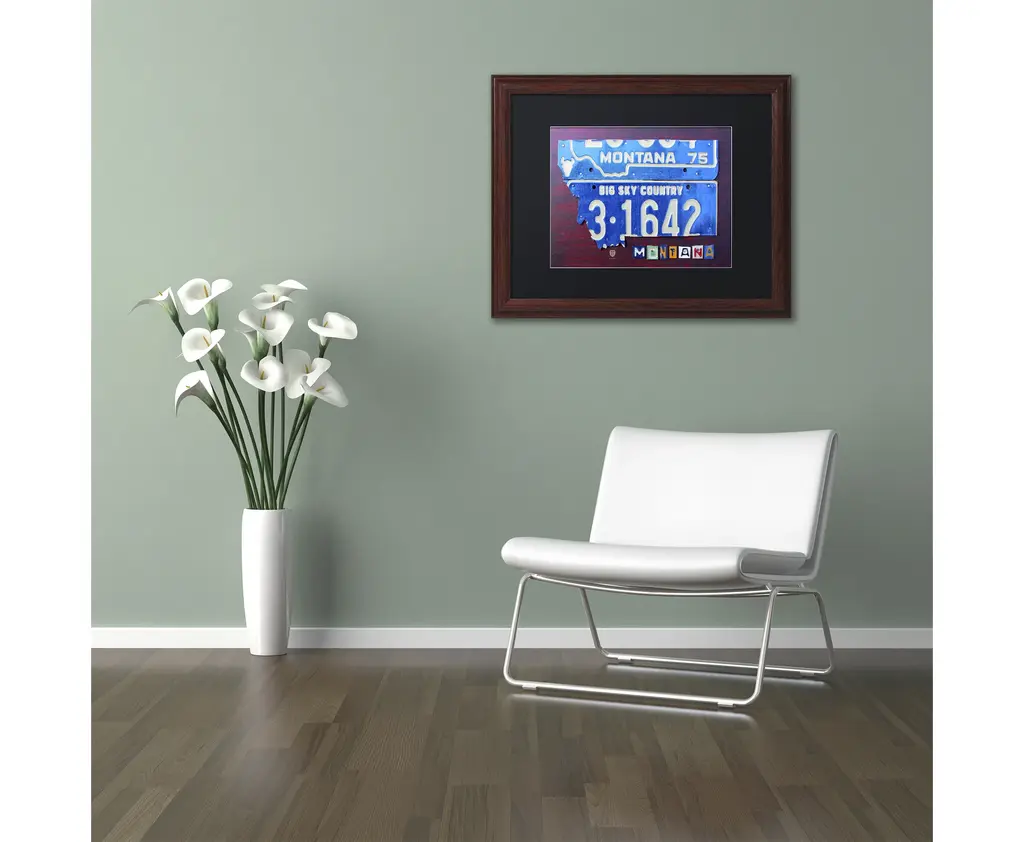 Title: MontanaArtist: Design TurnpikeProduct Type: Matted Framed Canvas ArtSize: 16" x 20"Matte Color: BlackFrame Color: WoodMade in the USA.David Bowman creates handmade license plate art and maps under the name Design Turnpike. As a boy, David loved license plates. His interest in maps, geography, travel and crafting grew to inspire the art he creates today. He continues to brainstorm and produce various new designs along with his classic license plate maps.An 11" x 14" giclee print under acrilyic in an 16" x 20" Wood Frame. Giclee (jee-clay) is an advanced printmaking process for creating museum quality fine art reproductions. This high quality print is matted using Black Matting and comes in a Wood Frame. A clear acrylic facing is added to protect the print. The piece is fully assembled by professional framers and comes ready to hang.Materials:Canvas: 100% Cotton, Frame: MDF, Matte: Paper-Laminated 100% Wood Fiber Core, Facing: Acrylic