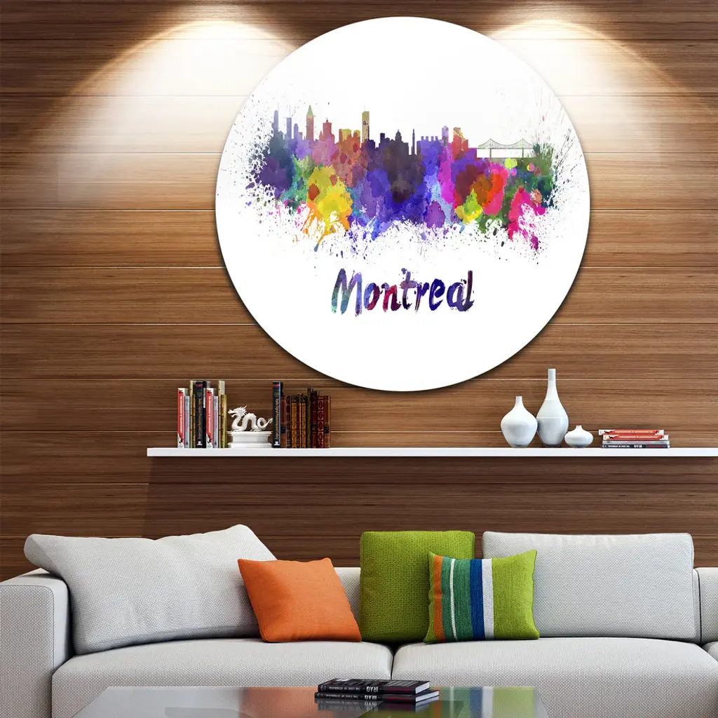 Bring Contemporary Abstraction to your home with this large Circle Metal wall art. This Montreal Skyline Metal Artwork makes it the focal point of any room or office. - White Gloss Coating ensures colors are extra vibrant with light reflection.- Aluminum grade Sheet Metal with 1 inch mounting frame on the back giving the illusion that the artwork is floating on the wall..- Mounting Brackets are included along with instructions.- High Quality Digital images are created directly into a glossy aluminum panel producing a stunning and captivating print into the glossy finish of the metal.- Water, Fire and Scratch resistant HD Aluminum panels.- Looks better than any photo paper and guaranteed to last at least 20 years- Easy to clean with a microfiber cloth. Colors are far superior to regular Canvas Art. - Easy to Hang