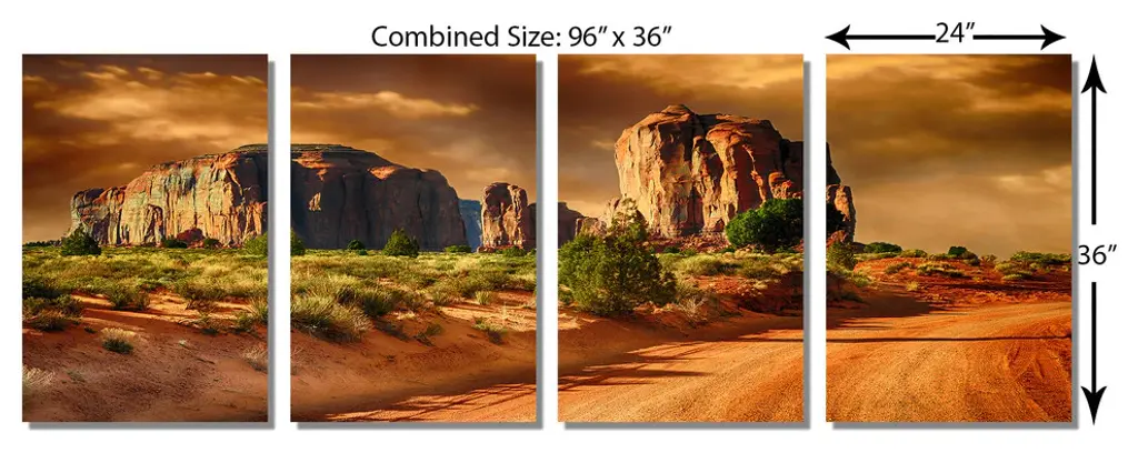 96"œ x 36"œ total size. Ready To Hang! (4 pieces - 24"œ x 36"œ each). 4 Panel Split Metal Print of Monument Valley during Sunset. Modern metal wall art for home or office wall decor & interior design. Printed on Luxurious, HD aluminum glossy metal panels. Multi panel art.. HD aluminum panels. Metal print wall art. Includes Shadow Wall Mount on the back.• Aluminum Metal Wall Art• Made in USA• Ready to hang - No assembly required• Shadow mount hardware on the back• 0.045"œ thick HD Aluminum Panels• Scratch resistant, glossy finish• Superb color clarity, luxurious prints• Epson printing process• For indoor or moisture rich environment use• Easy to clean. Gently wipe with microfiber cloth.