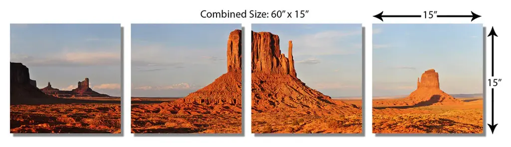 60"œ x 15"œ total size. Ready To Hang! (4 pieces - 15"œ x 15"œ each). 4 Panel Split Monument Valley panoramic Metal Print. Modern metal wall art for home or office wall decor & interior design. Printed on Luxurious, HD aluminum glossy metal panels. Multi panel art.. HD aluminum panels. Metal print wall art. Includes Shadow Wall Mount on the back.• Aluminum Metal Wall Art• Made in USA• Ready to hang - No assembly required• Shadow mount hardware on the back• 0.045"œ thick HD Aluminum Panels• Scratch resistant, glossy finish• Superb color clarity, luxurious prints• Epson printing process• For indoor or moisture rich environment use• Easy to clean. Gently wipe with microfiber cloth.