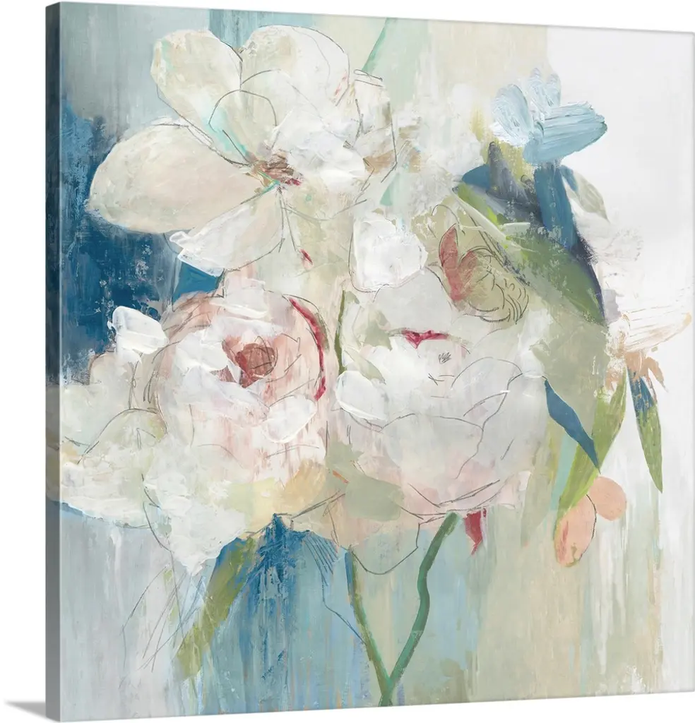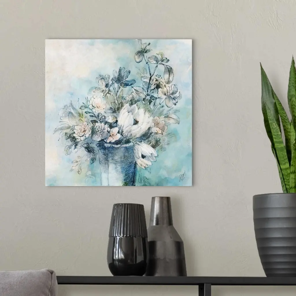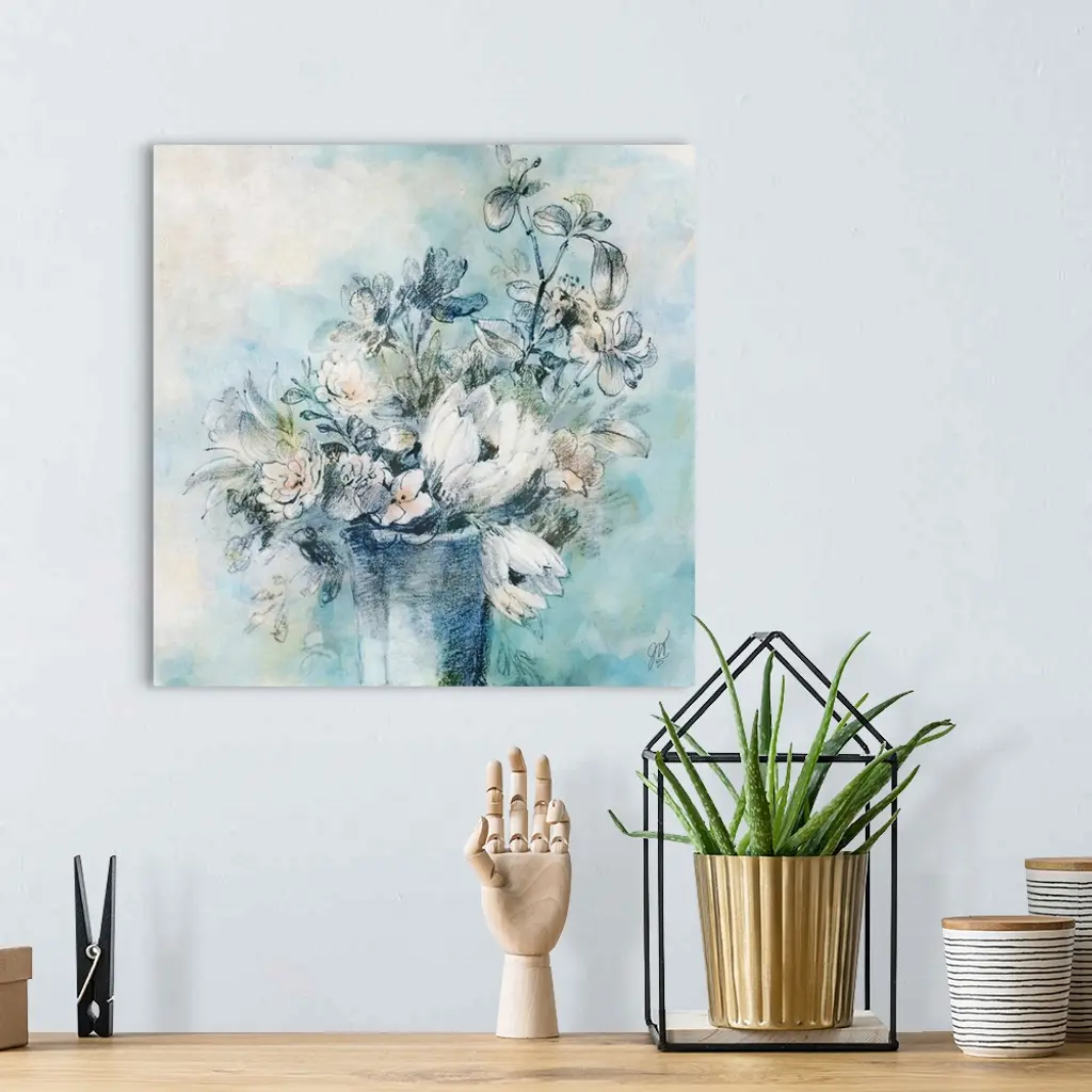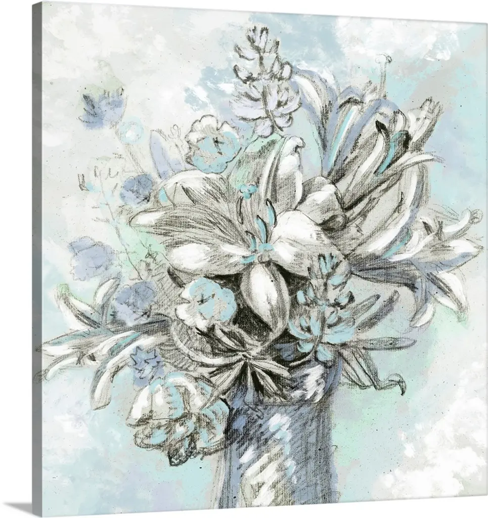 A modern sketch of a vase full of flowers in shades of turquoise and peach.