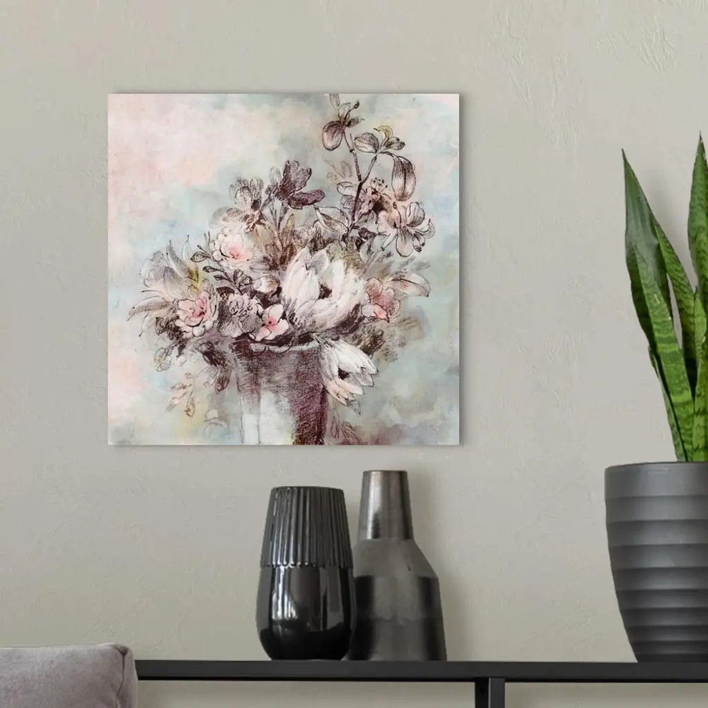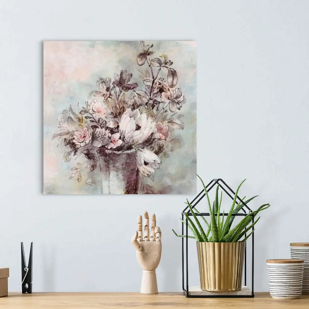 A modern sketch of a vase full of flowers in shades of peach and turquoise.