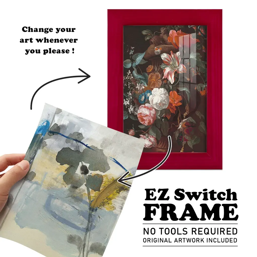Moody Floral II -EZ SWITCH Framed Print w/glass-Cherry Red A delightful, framed print. Featuring a solid wood frame with real wood glass. This premium print is giclee quality. In addition, every frame features a removable back and table top stand. This allows you to change your art in the future or to just stand the art on a table for a new look. We are sure you'll enjoy our new series of EZ SWITCH Framed Art. Solid Wood Frame Real Glass Removable / Replaceable Art Built in Tabletop Stand Sizes range from 4x6 up to 12x15 - buy just one or pair them up as sets as you see fit.